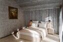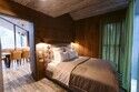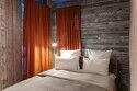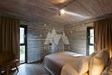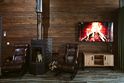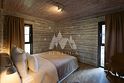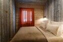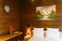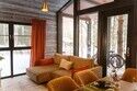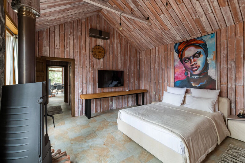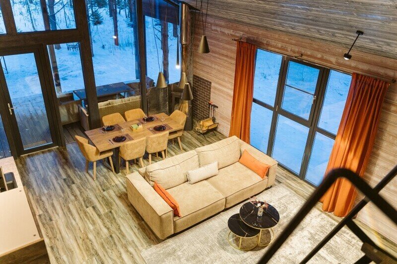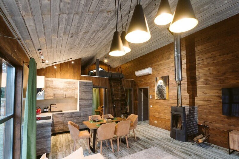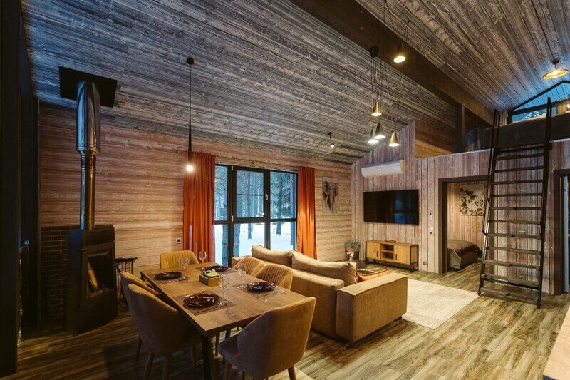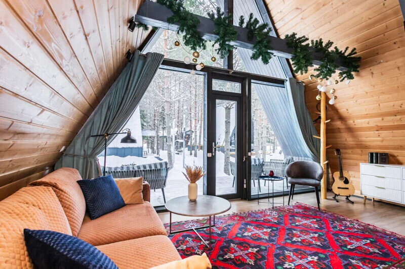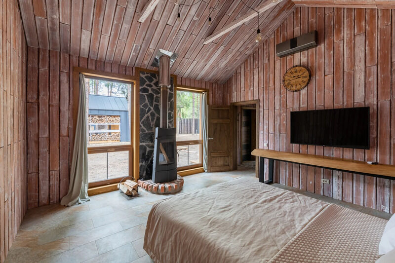 Сказочный домик с одной изолированной спальней с кроватью KingSize, гостиная с камином большим диваном кроватью с панорамными окнами и сауной.