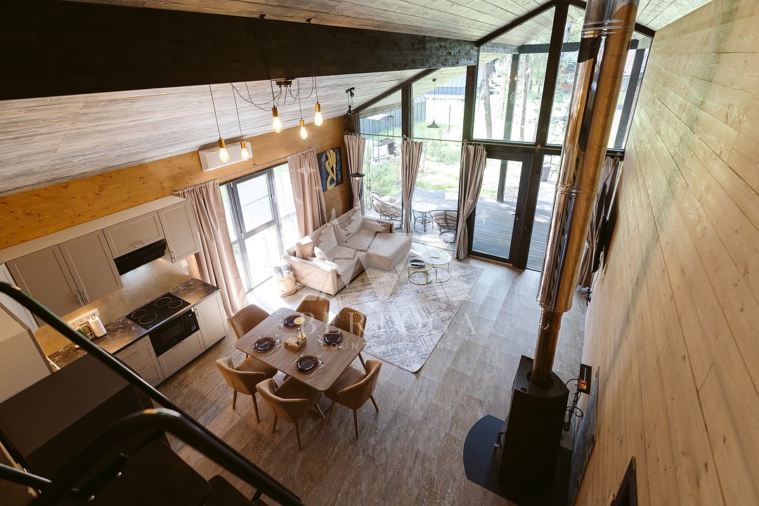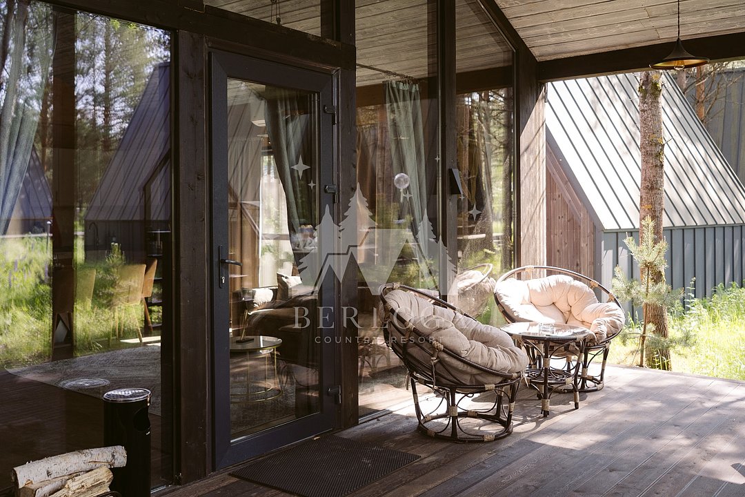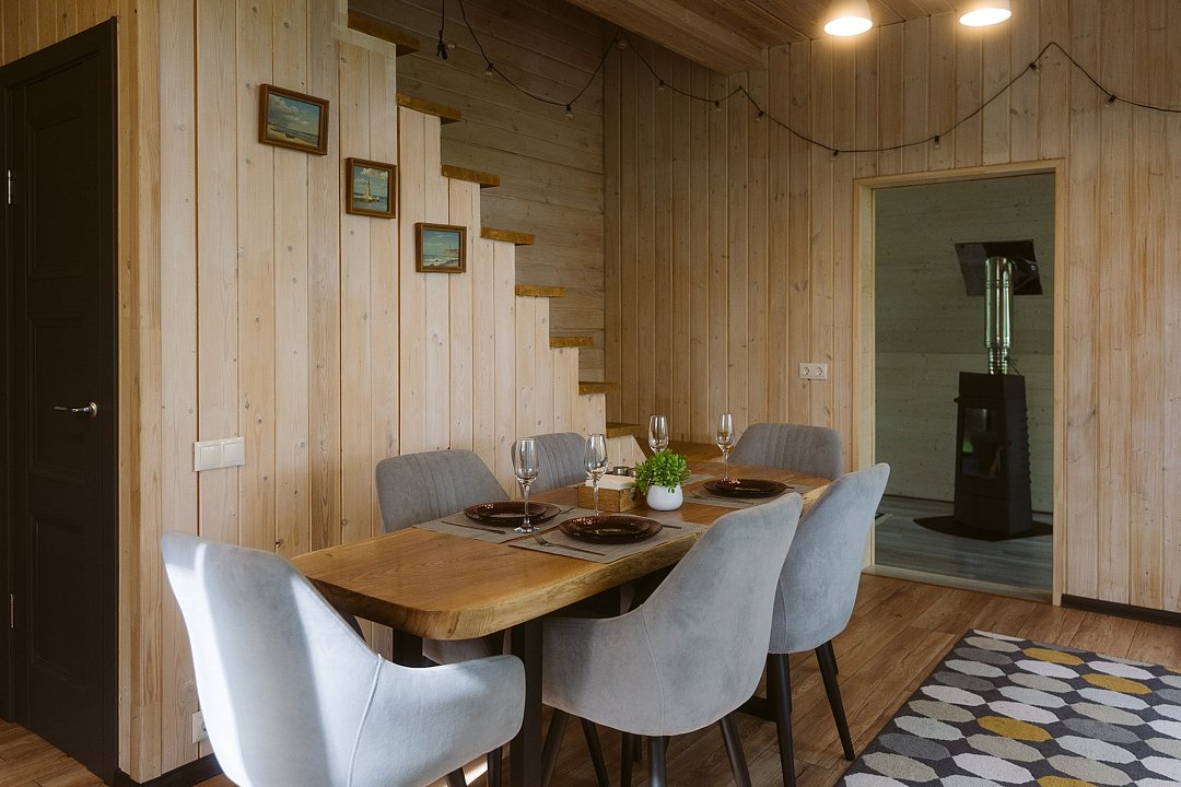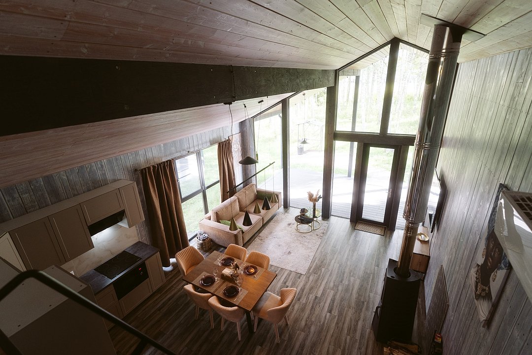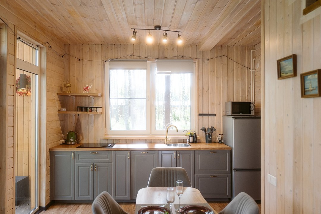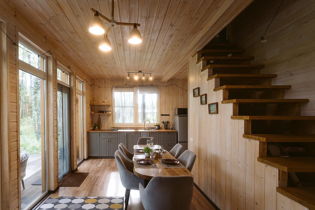 Гостиная совмещена с кухней и обеденной зоной. Увеличенная терраса с грилем и уличной мебелью для завтраков под теплыми лучами солнца и отдыха под открытым небом с видом на озеро. В этом уютном домике с большим панорамным окном есть своя собственная сауна. Максимальная её температура составляет 60°. Подходит для компании друзей или семьи. На заднем дворике расположена барбекю зона.