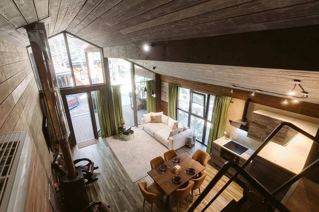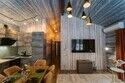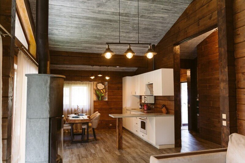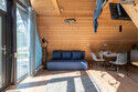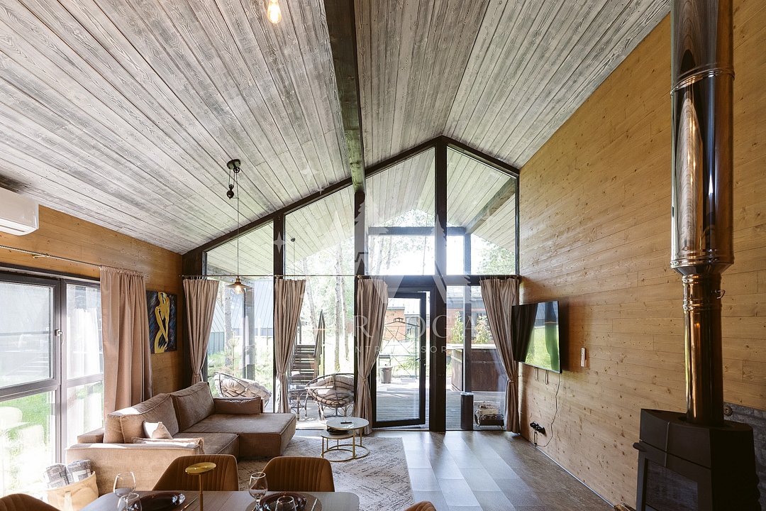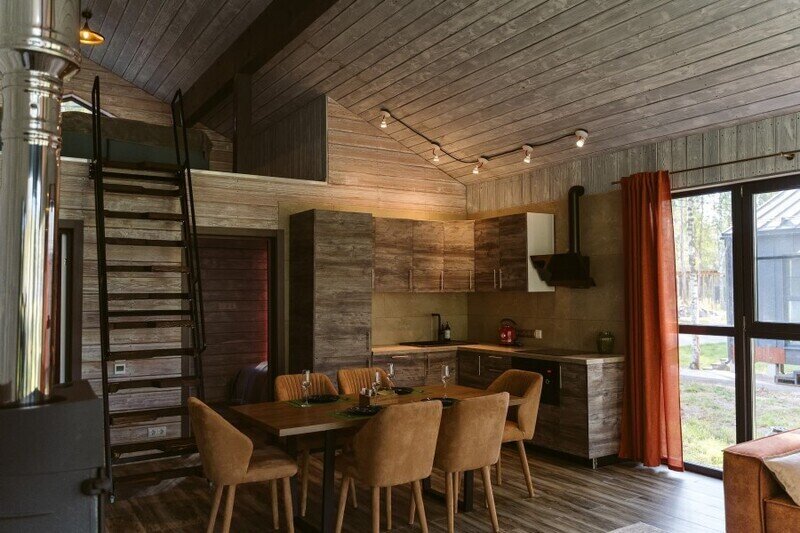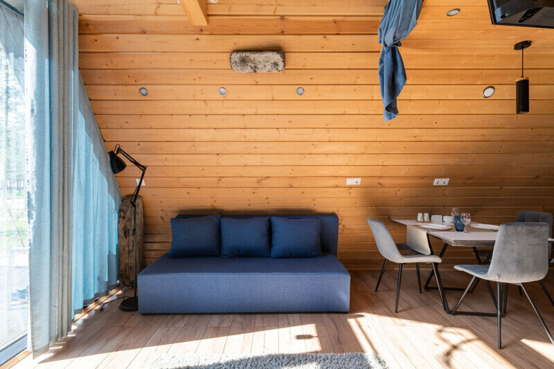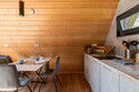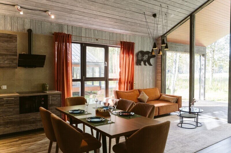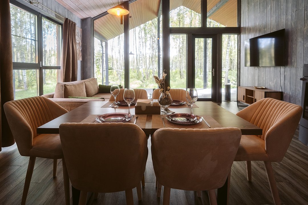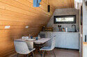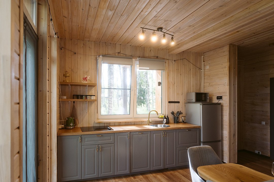 Гостиная совмещена с кухней и обеденной зоной. Увеличенная терраса с грилем и уличной мебелью для завтраков под теплыми лучами солнца и отдыха под открытым небом с видом на озеро. В этом уютном домике с большим панорамным окном есть своя собственная сауна. Максимальная её температура составляет 60°. Подходит для компании друзей или семьи. На заднем дворике расположена барбекю зона.