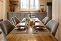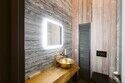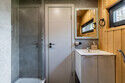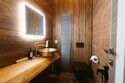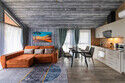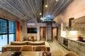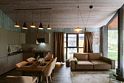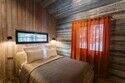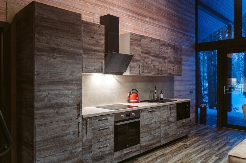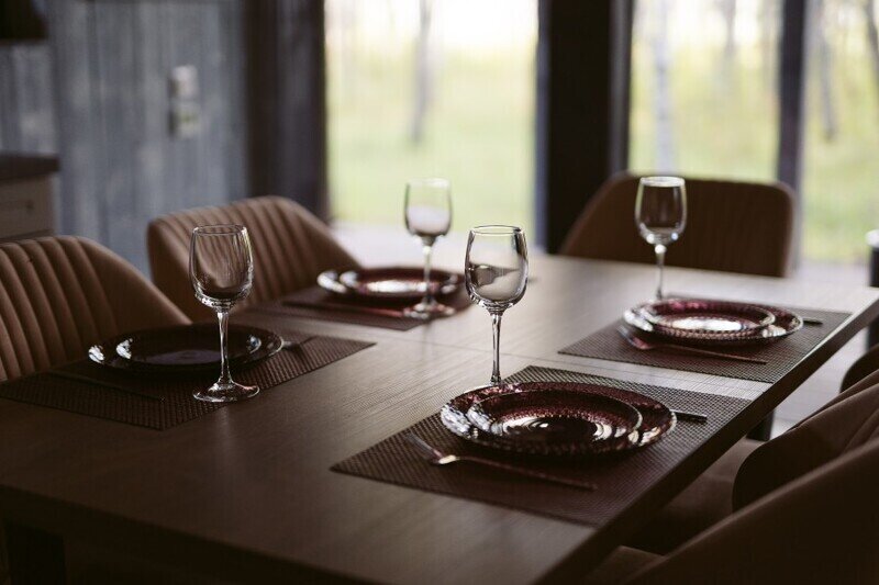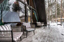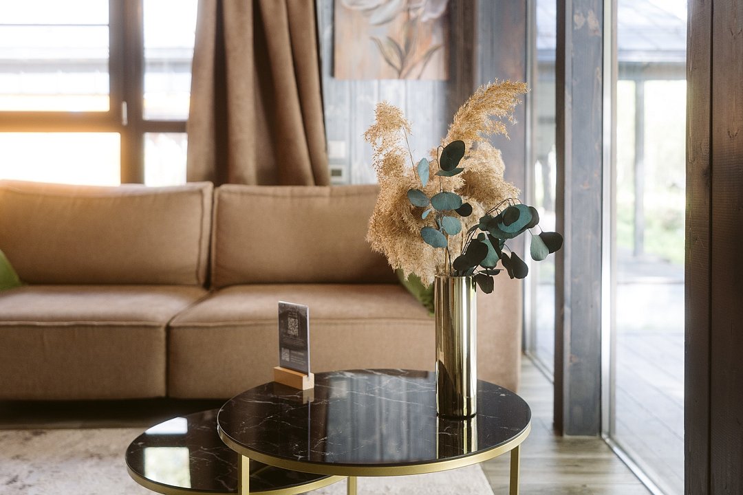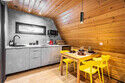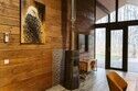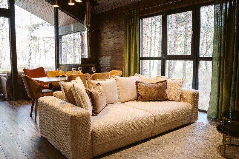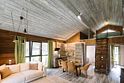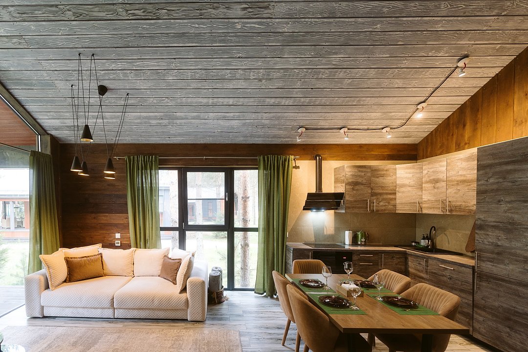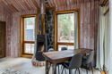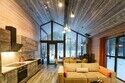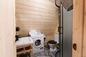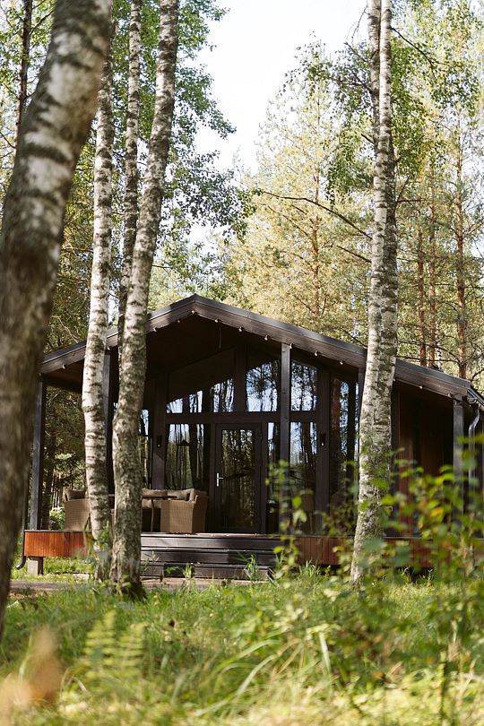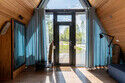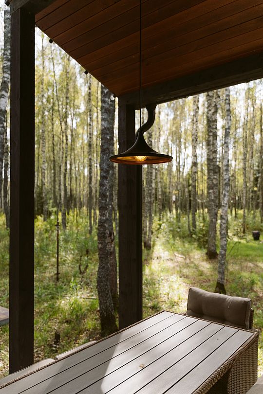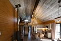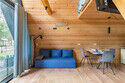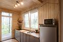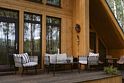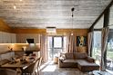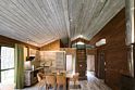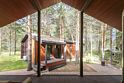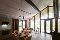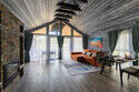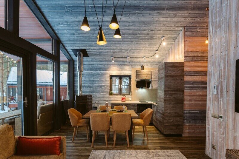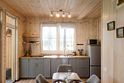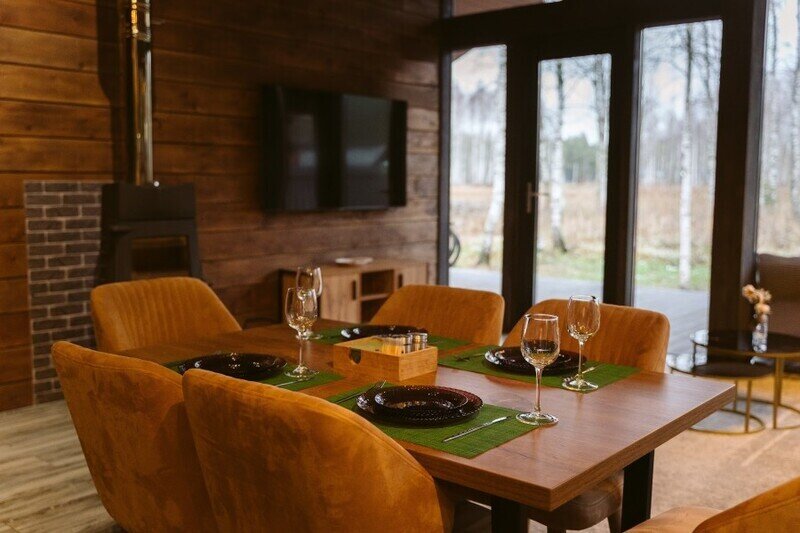 Гостиная совмещена с кухней и обеденной зоной. Увеличенная терраса с грилем и уличной мебелью для завтраков под теплыми лучами солнца и отдыха под открытым небом с видом на озеро. В этом уютном домике с большим панорамным окном есть своя собственная сауна. Максимальная её температура составляет 60°. Подходит для компании друзей или семьи. На заднем дворике расположена барбекю зона.