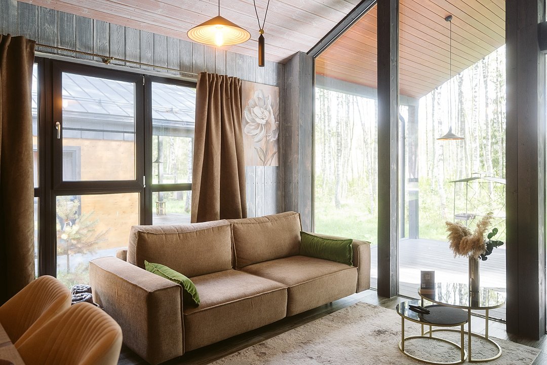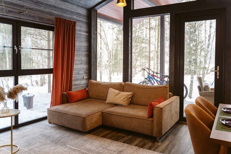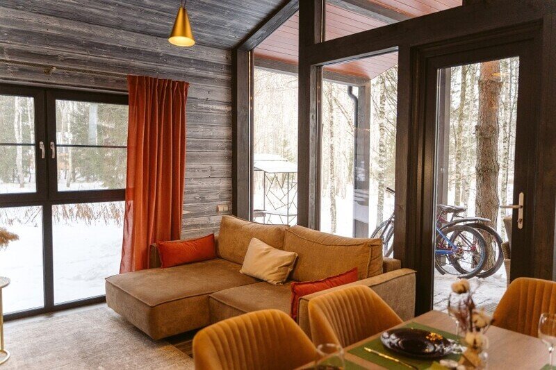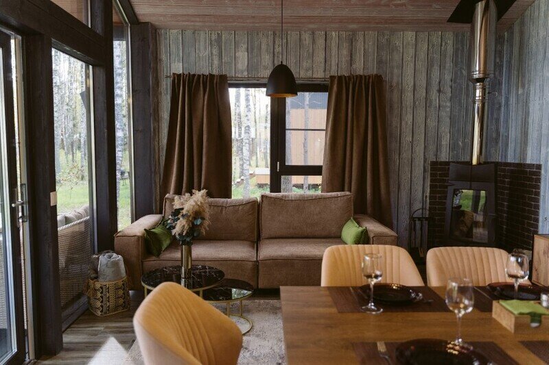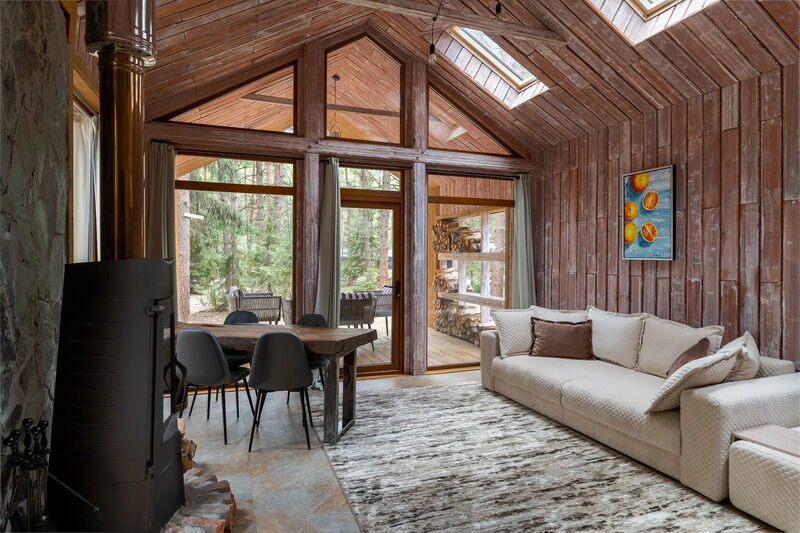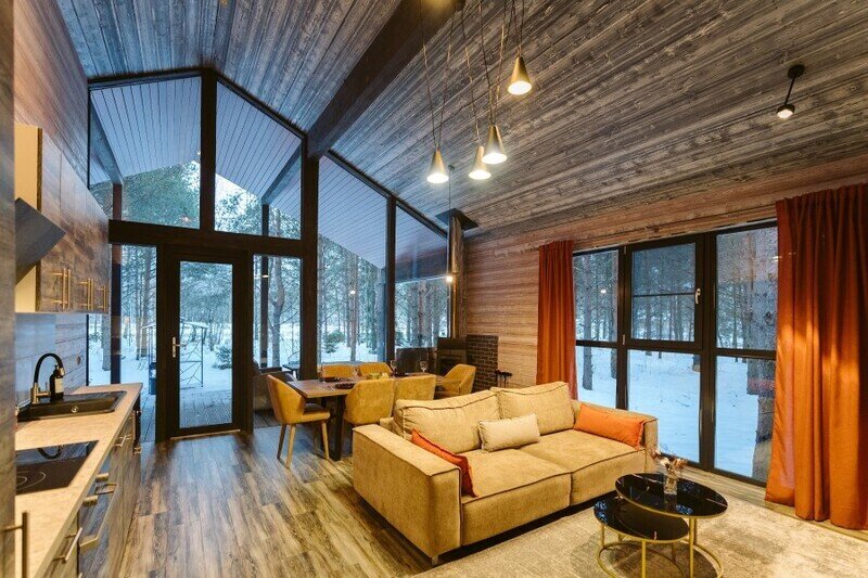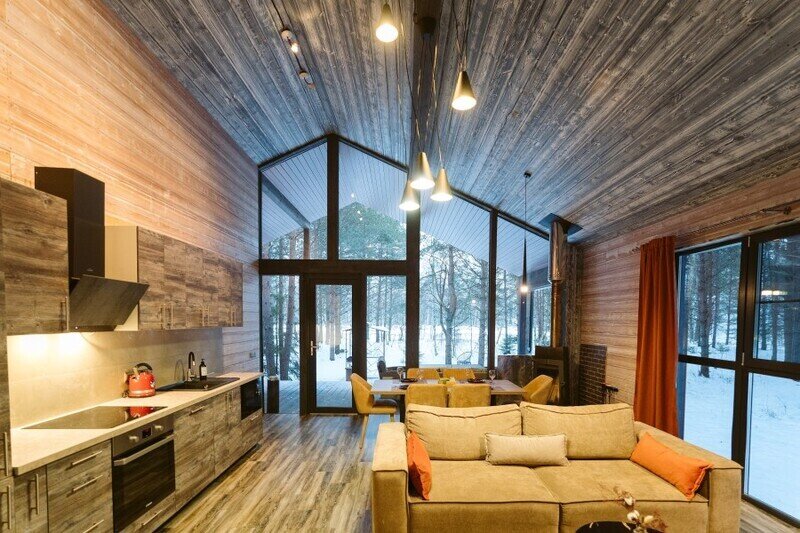 Дом с двумя спальнями и кухней гостиной с диваном кроватью, панорамным окном, камином и сауной.