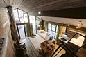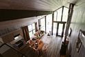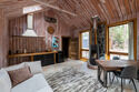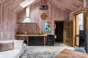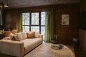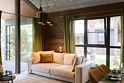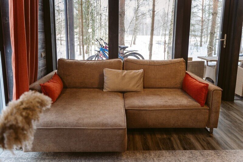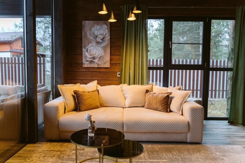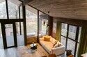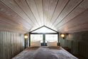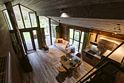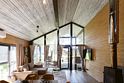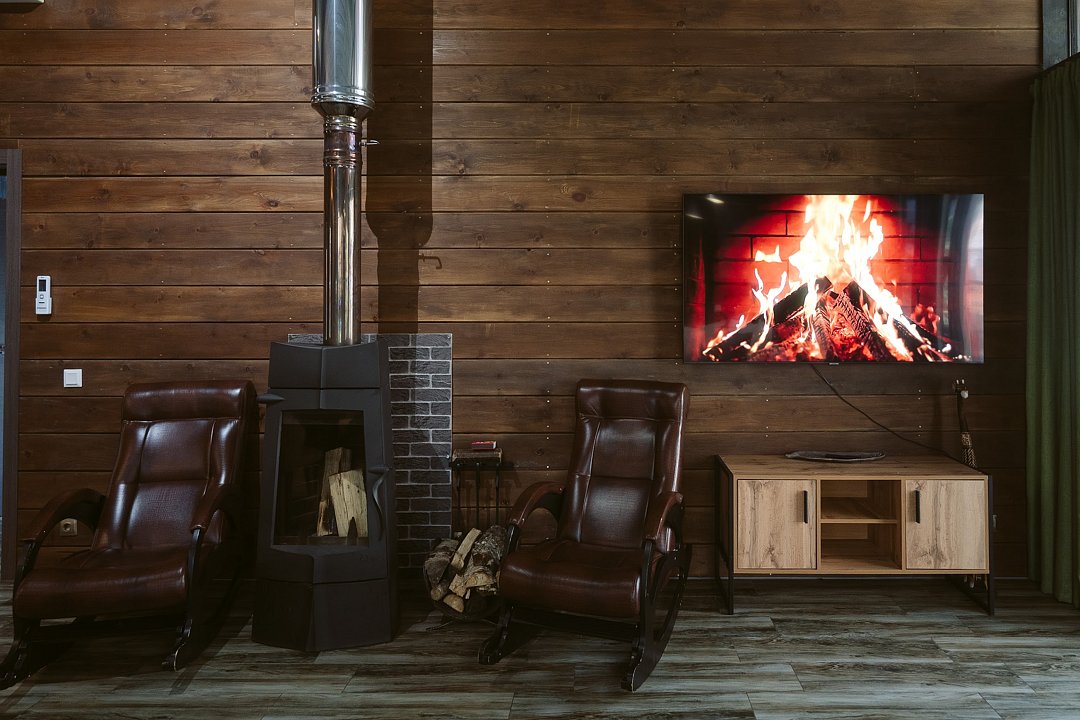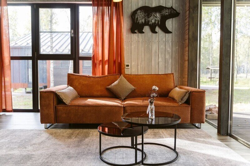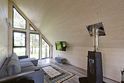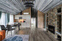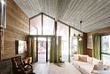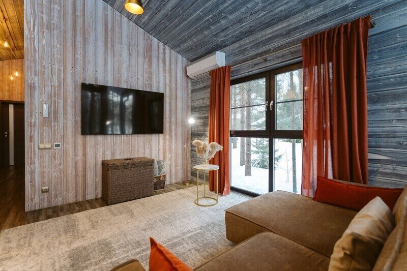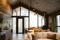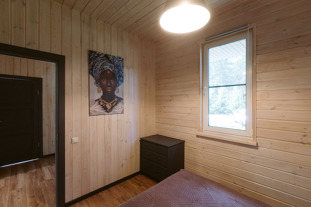 Дом с двумя спальнями и кухней гостиной с диваном кроватью, панорамным окном, камином и сауной.