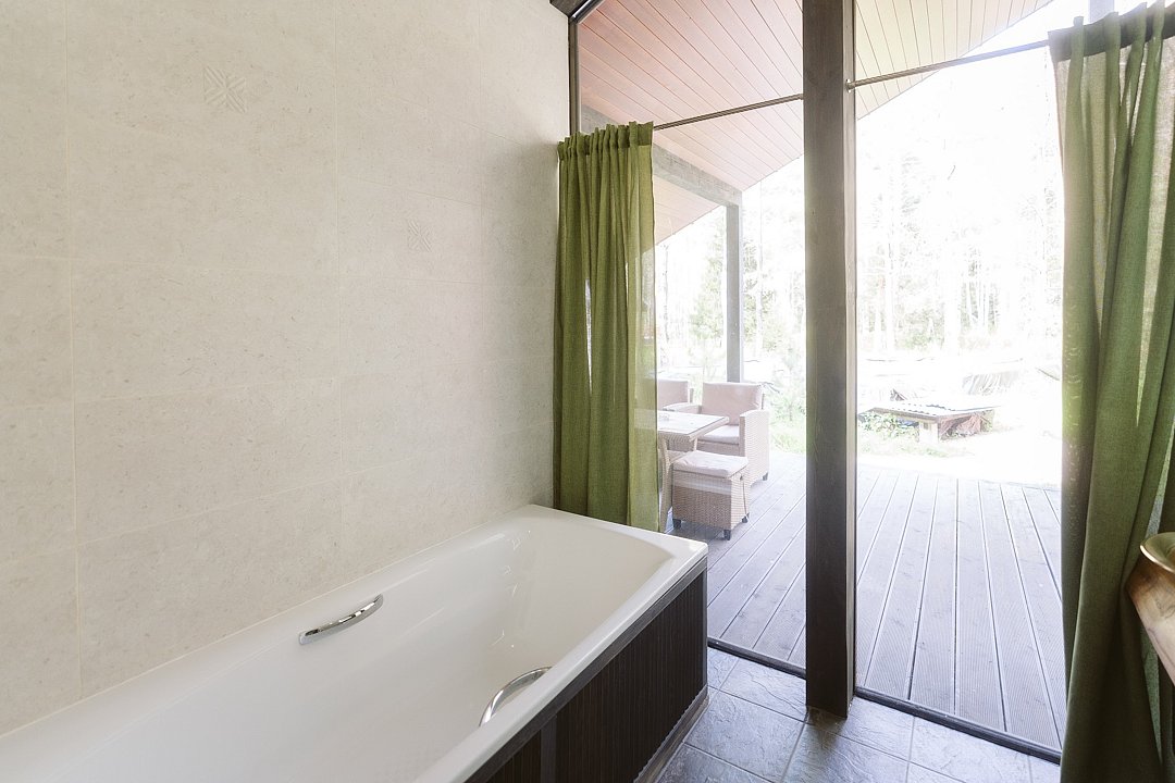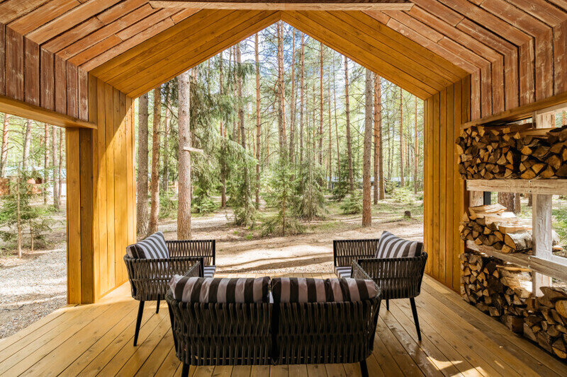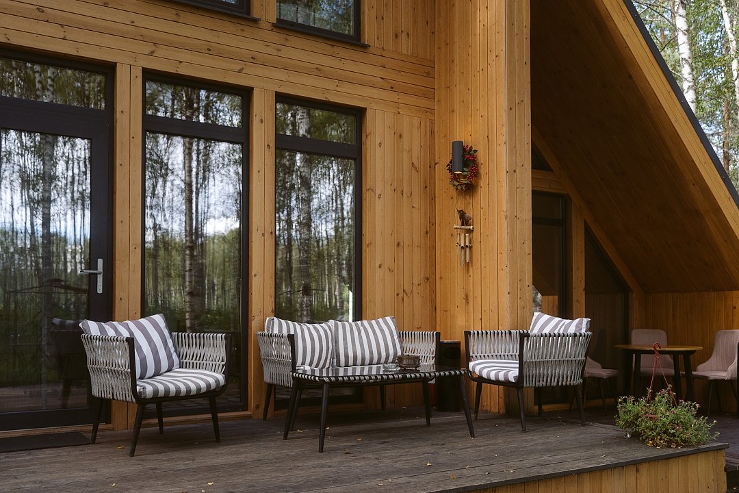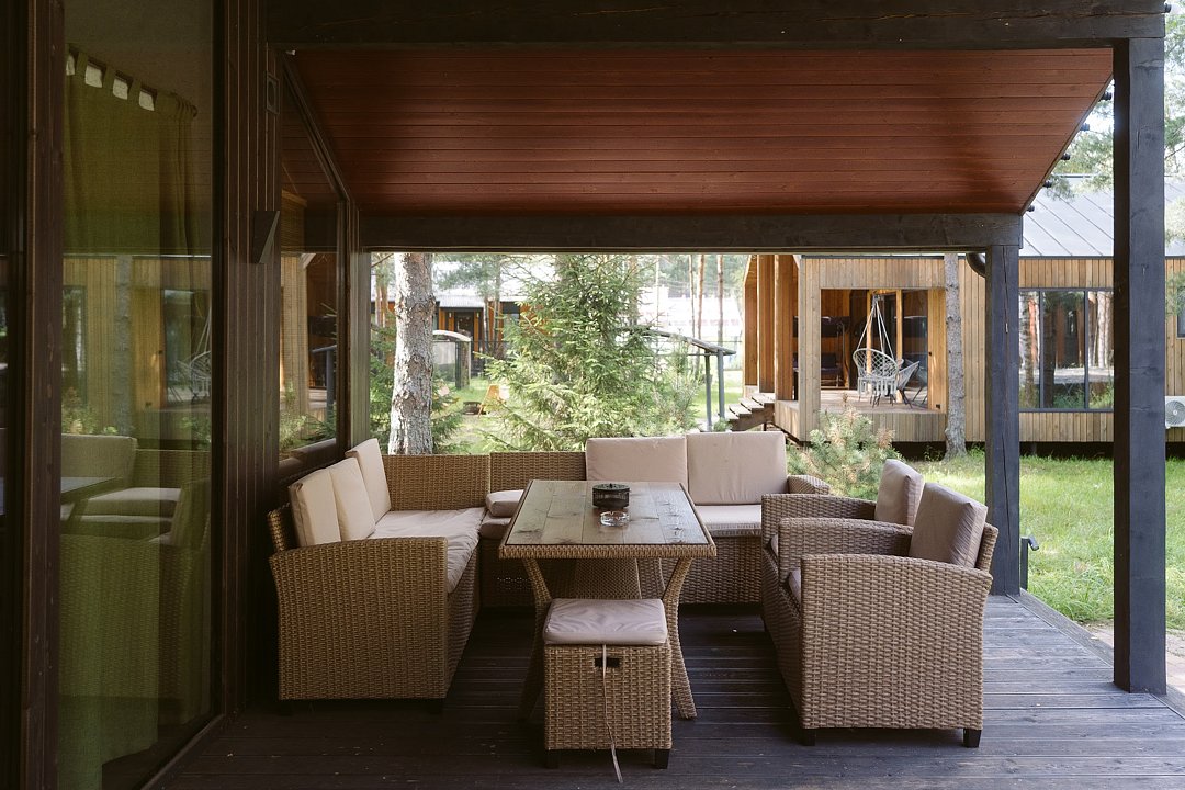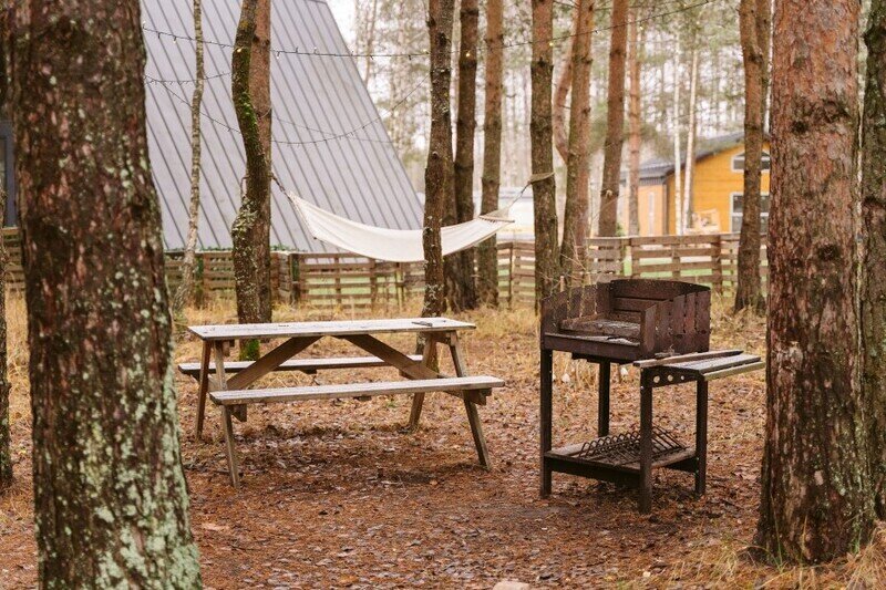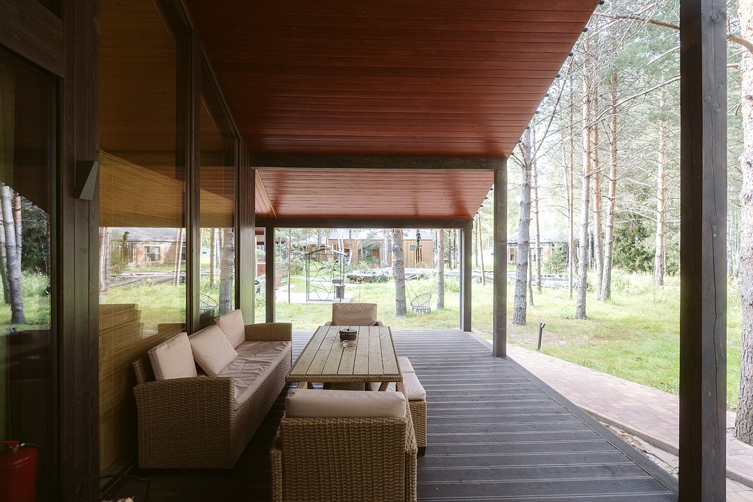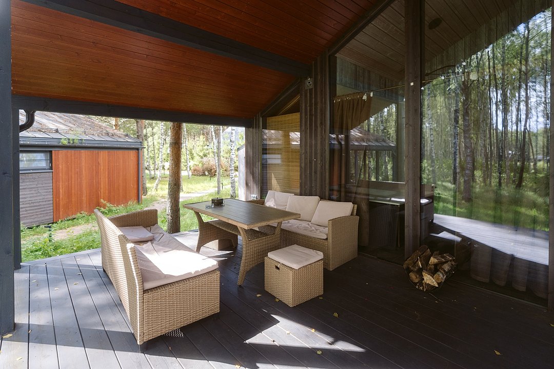 На террасе имеется зона барбекю с мангалом, а все необходимые принадлежности можно приобрести на месте. Также рядом оборудована парковка для машин. А любители активного отдыха могут взять напрокат велосипеды и отправиться в мини-путешествие по сосновому лесу.