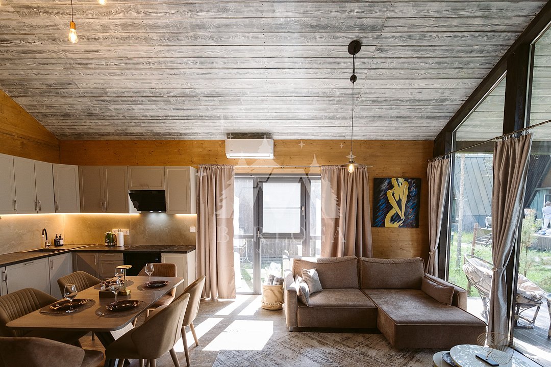 Система отопления и кондиционирования, теплый пол, телевизор с интернет каналами, спальня, гостиная с диваном кроватью, санузел, ванная с эко-косметикой , кухня со столовыми приборами, плитой и микроволновой печью, чайный набор, бесплатный Wi-Fi, барбекю зона.