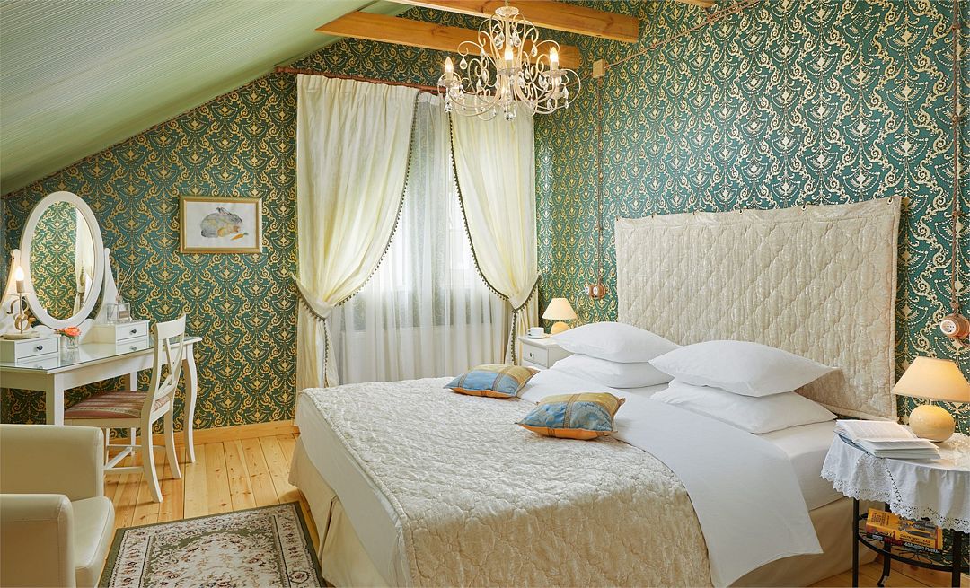 Номера на третьем, мансардном этаже выполнены в стиле дворянской усадьбы, оснащены удобной двуспальной кроватью, антикварным будуарным столиком и предметами искусства из коллекции семьи Кописки. Из номеров открывается живописный вид на пойму реки Клязьма, голубые купола Храма Жён Мироносиц, кратерный сад и аллею.