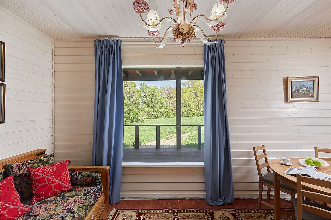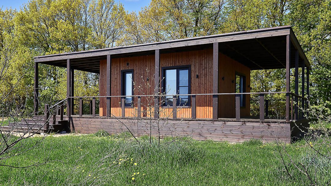Дом «Дача», построенный из натурального дерева, состоит из просторной кухни-гостиной, спальни с кроватью queen-size, ванной комнаты с окном, а также круговой террасой с зоной отдыха.