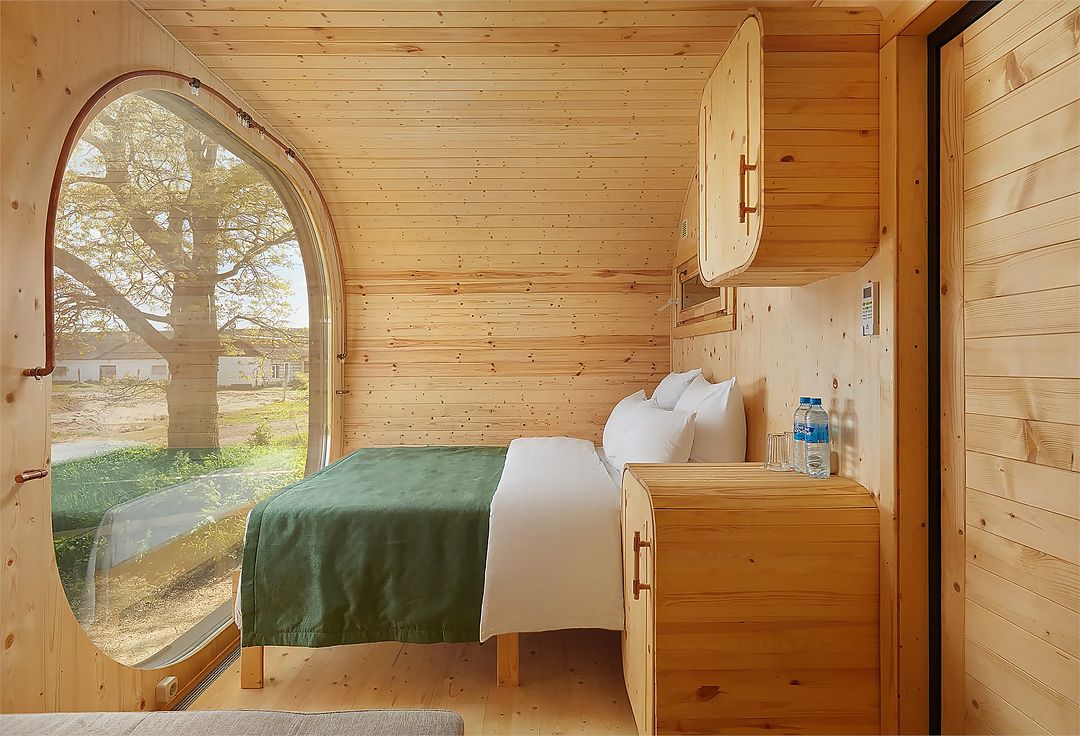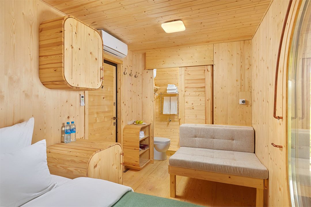 Уютный дом капсула подходит для любителей уединенного и комфортного отдыха на природе. В гостевом доме есть все необходимое для проживания: ванная комната с душевой кабиной, гостиная с мини-кухней, спальная комната, собственная открытая терраса, кондиционер, возможность парковки автомобиля рядом с домом.