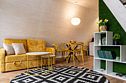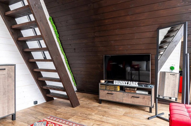 - спальная зона: ортопедический матрас на втором этаже, раскладной диван на первом;