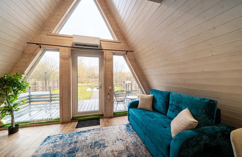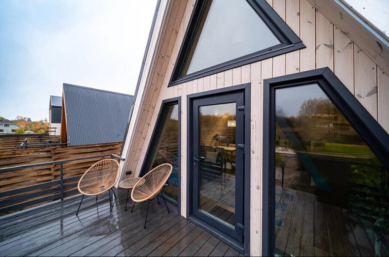 Отдых в А-фрейм домике Рекс. Домик со своей огороженной территорией 5 соток. Дом вмещает до 4-х человек + ребенок до 7 лет.