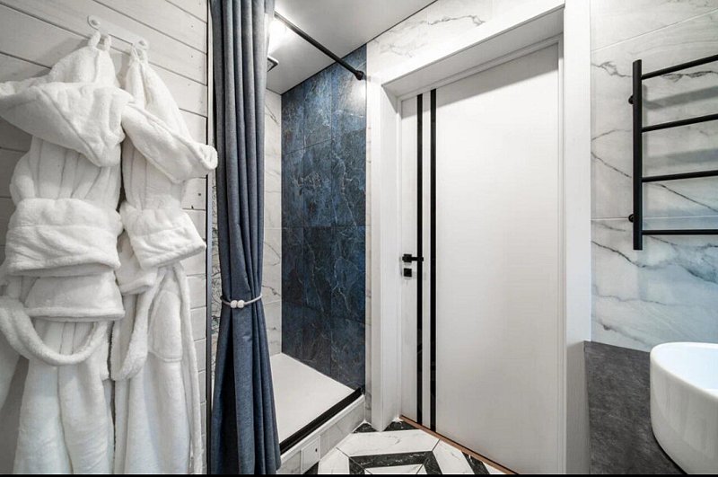 Предоставляются все средства личной гигиены: комплект полотенец на каждого человека, халат, одноразовые тапочки и набор для чистки зубов, шампунь, кондиционер и гель для душа.