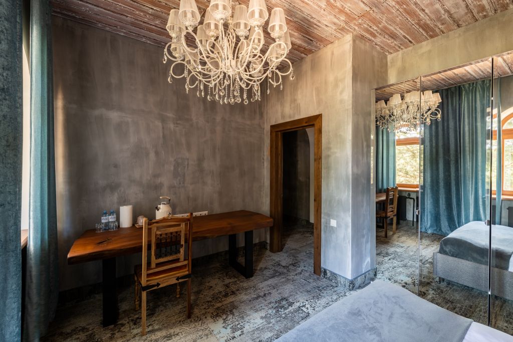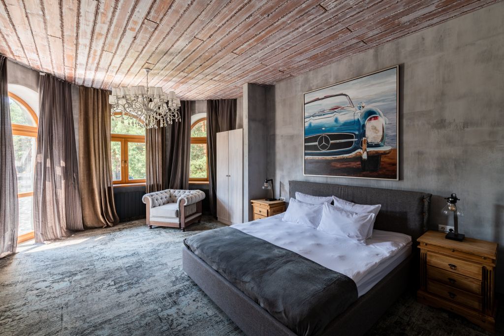 Элегантный выдержанный интерьер, комфортная рабочая зона и окружение соснового леса располагает к спокойному уединенному отдыху. В декоре использованы материалы, обладающие естественной природной фактурой. Прохлада камня, мягкость натуральных тканей и фактурность дерева создают уникальный тактильный интерьер.