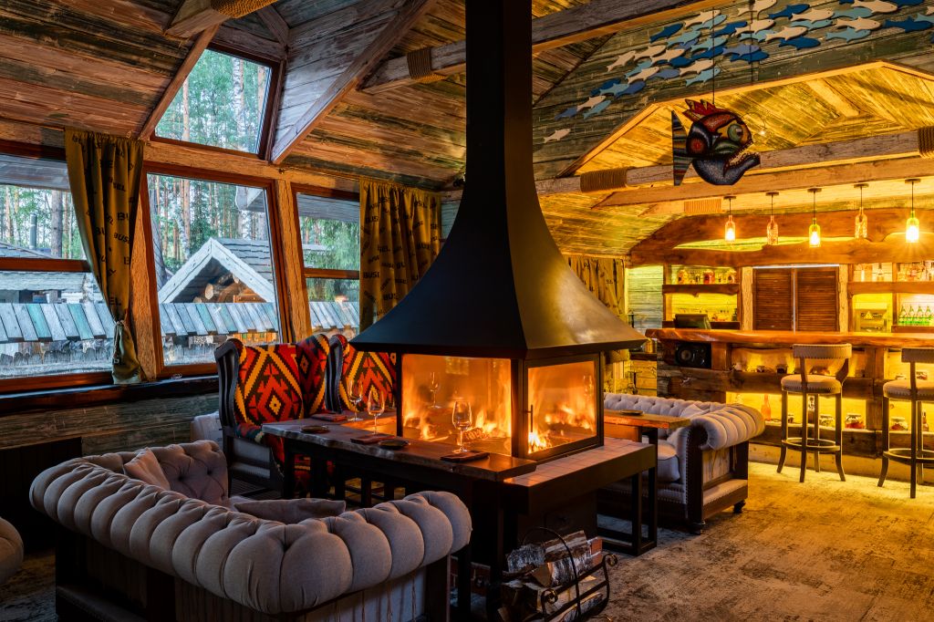 Бар с камином и интерьерами из натурального дерева порадует изысканной винной картой , крафтовыми настойками собственного приготовления и кальян баром.