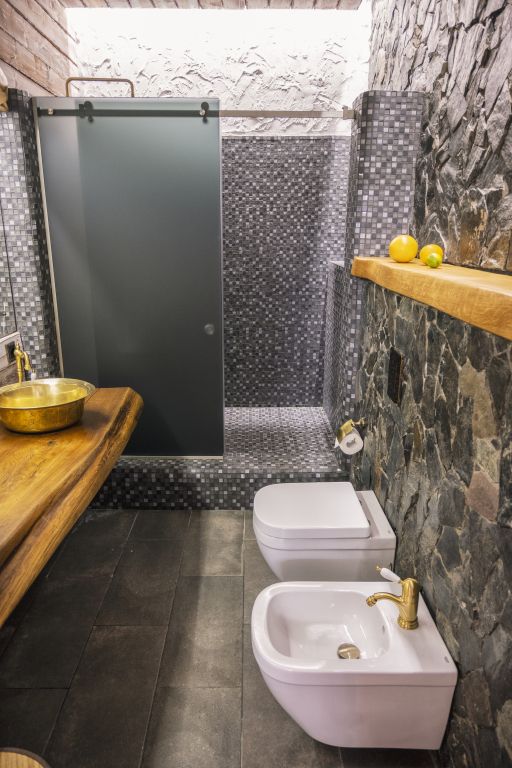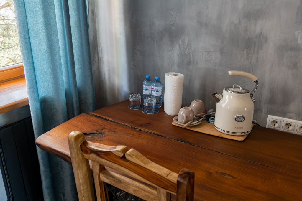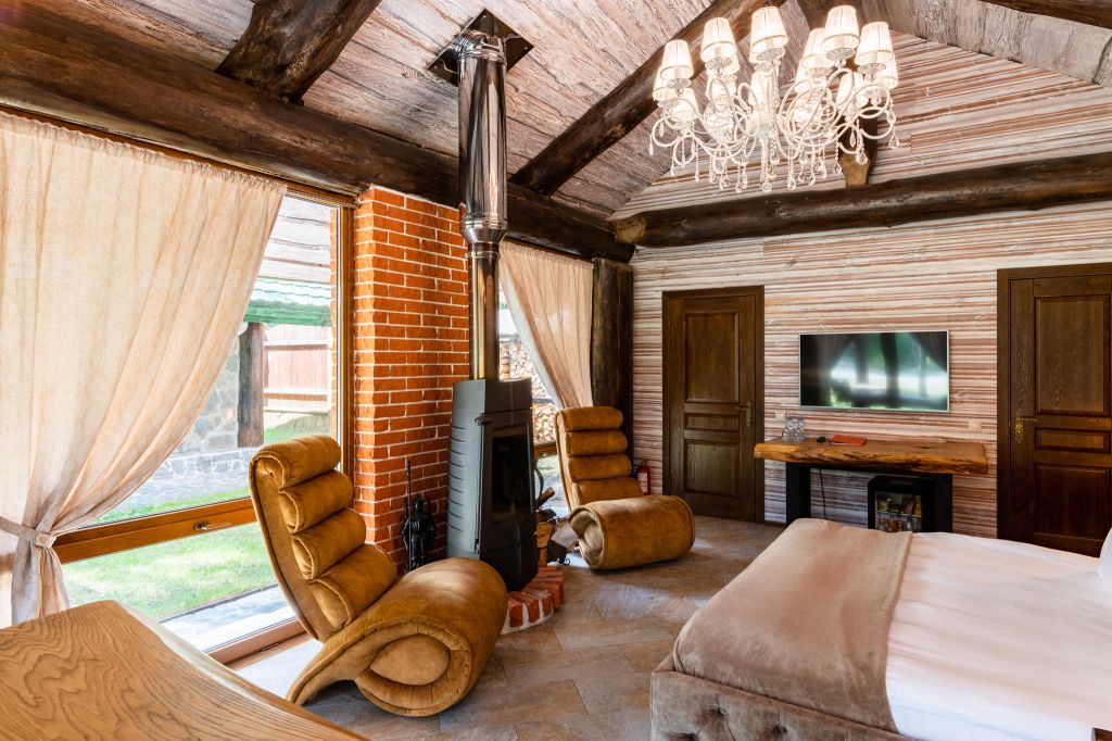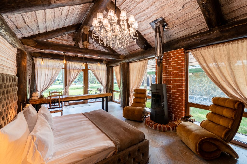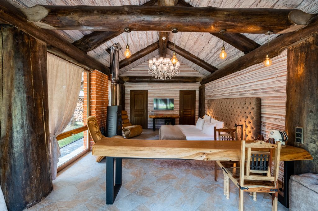 Внутри есть все необходимое для комфортного проживания: спальня с кроватью king size, рабочая и обеденная зона,TV с интернет каналами, чайная станция, бесплатный Wi-Fi, камин, душевая и санузел, гардеробная а так же собственная терраса с мебелью. Дом идеально подходит для проведения романтичных выходных. Стильный и продуманный интерьер, уединенное расположение и великолепный сервис.