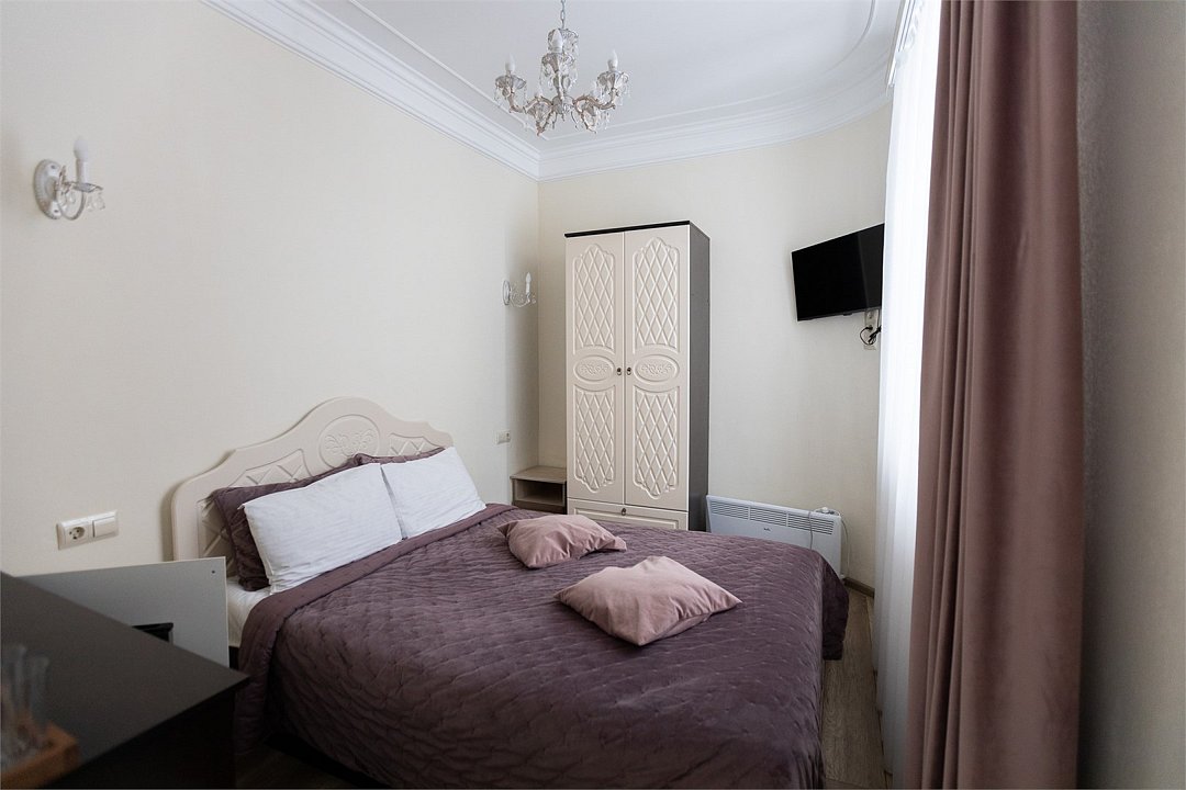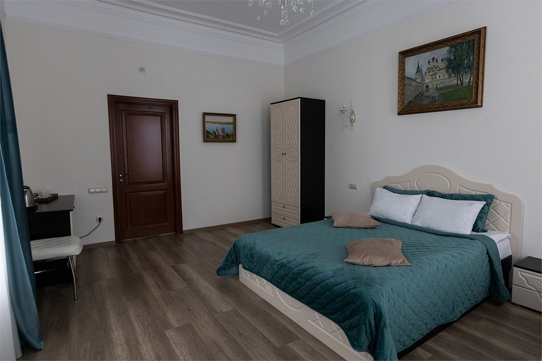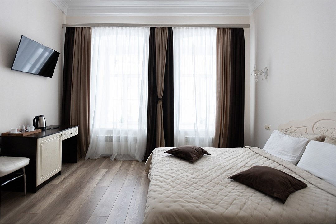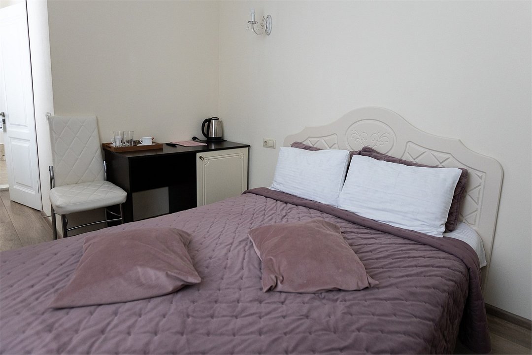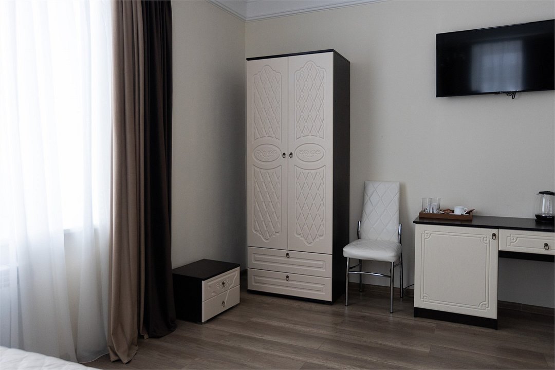 Wi-Fi, фен, вентилятор, электронные замки, ванна или душевая кабина, халаты, банные полотенца, тапочки, косметические средства, двуспальная кровать, тумбы, стулья, шкаф для одежды, вешалки, зеркало, комод, обслуживание номеров, информационная карта, меню, сейф, унитаз, вид на город, кулер на этаже, вид во двор, ламинат, стаканы, стол, мини-холодильник, гостиничная парфюмерия, телевизор со Smart TV, фумигатор, уборка номера, набор для приготовления чая и кофе, услуги прачечной (платно)В гостиничном номере