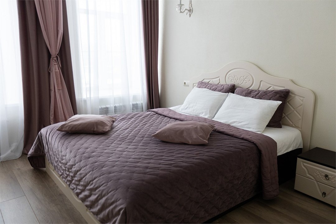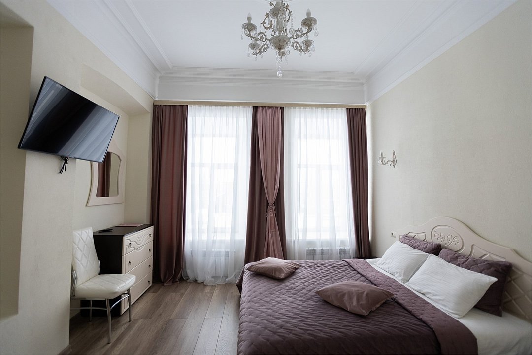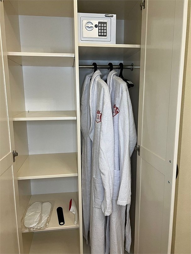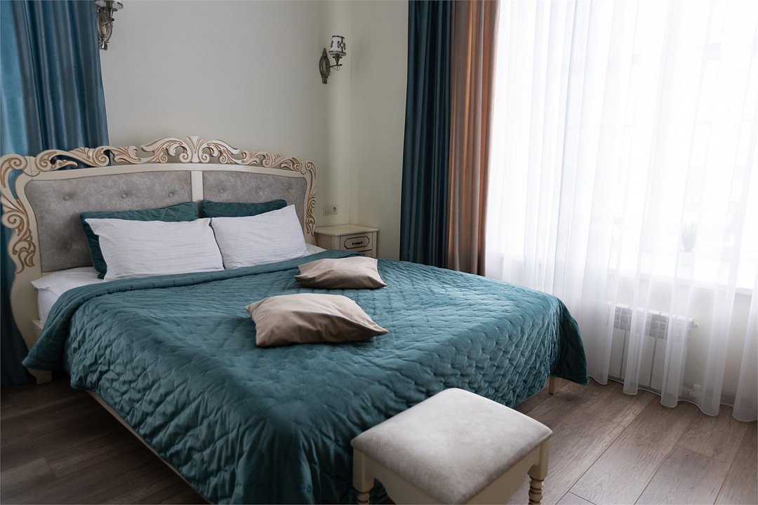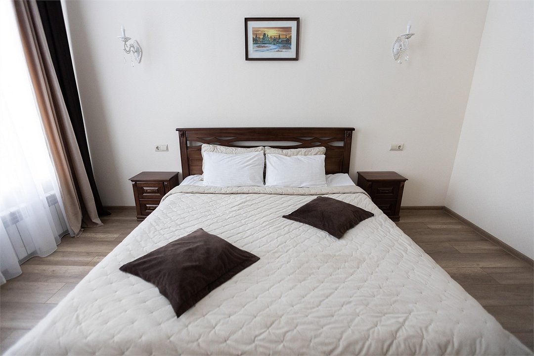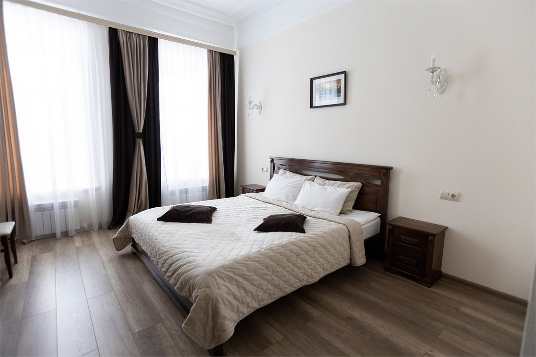 Wi-Fi, фен, вентилятор, электронные замки, ванна или душевая кабина, халаты, банные полотенца, тапочки, косметические средства, двуспальная кровать, тумбы, стулья, шкаф для одежды, вешалки, зеркало, комод, обслуживание номеров, информационная карта, меню, сейф, унитаз, вид на город, кулер на этаже, вид во двор, ламинат, стаканы, стол, мини-холодильник, гостиничная парфюмерия, телевизор со Smart TV, фумигатор, уборка номера, набор для приготовления чая и кофе, услуги прачечной (платно)В гостиничном номере