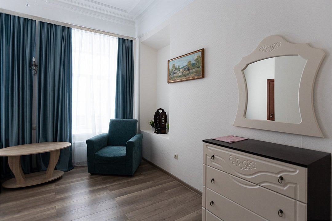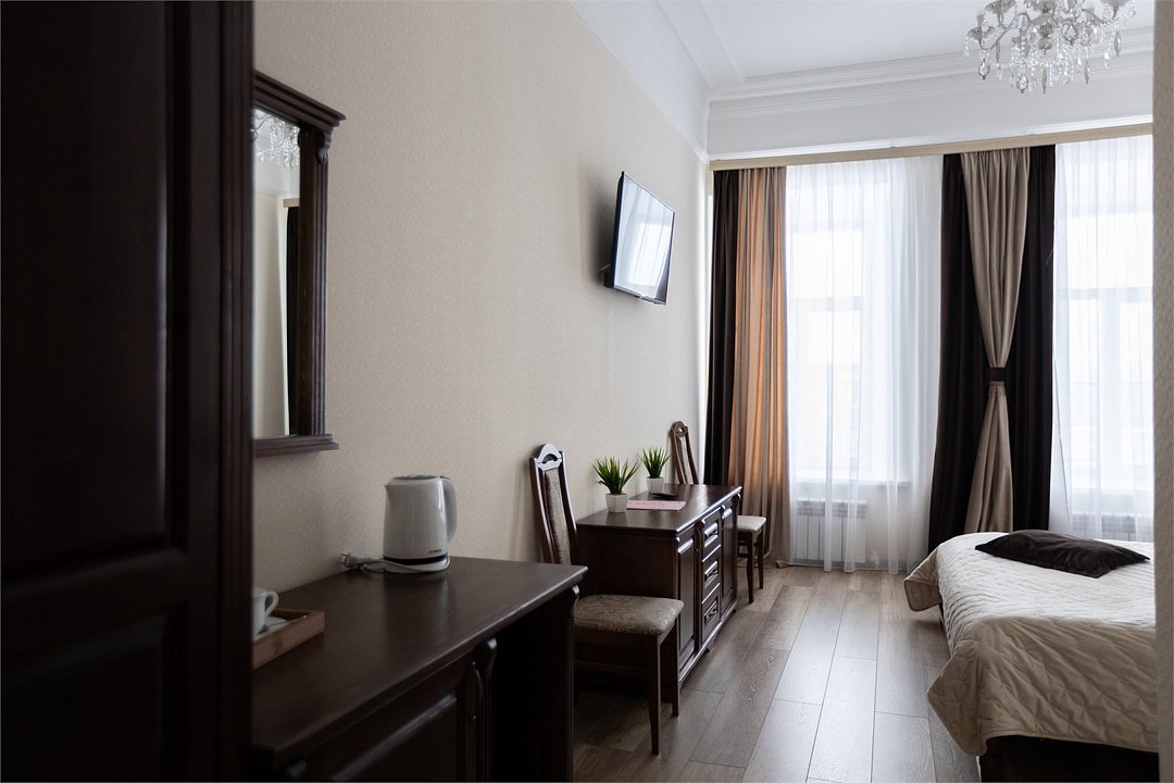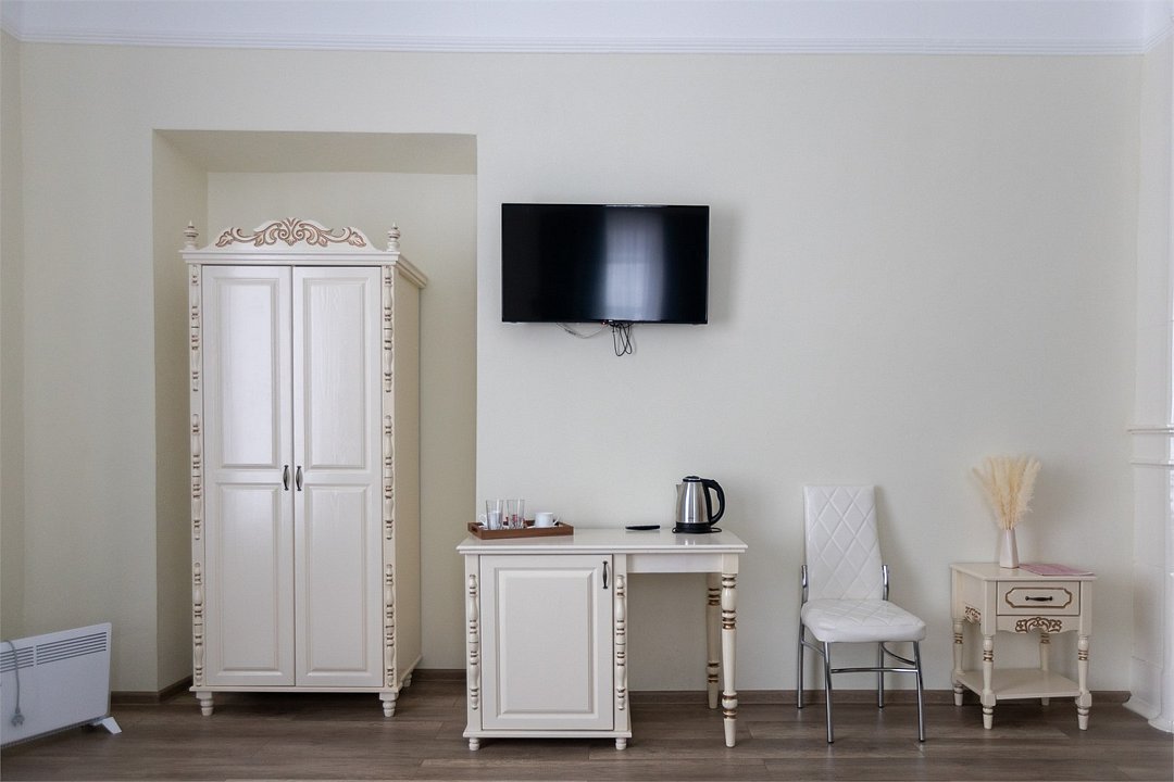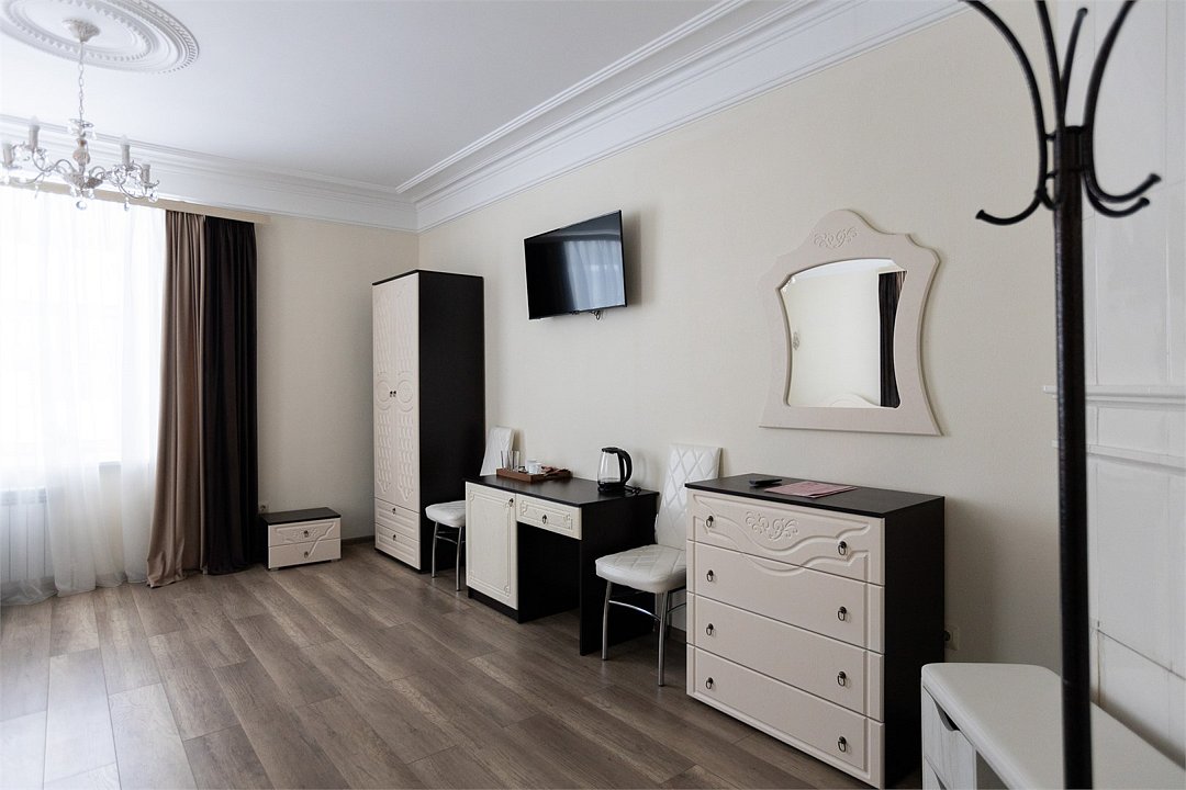 Wi-Fi, фен, вентилятор, электронные замки, ванна, санузел, банные полотенца, тапочки, две односпальные или большая двуспальная кровать, шкаф для одежды, зеркало, чайный набор, сейф, чайник, раковина, кулер на этаже, вид во двор, ламинат, высокие потолки, стаканы, стул, стол, телевизор с плоским экраном, мини-холодильник, гостиничная парфюмерия, телевизор со Smart TV, номер для некурящих, фумигатор, уборка номера, набор для приготовления чая и кофе, услуги прачечной (платно), шапочка для душаВ гостиничном номере