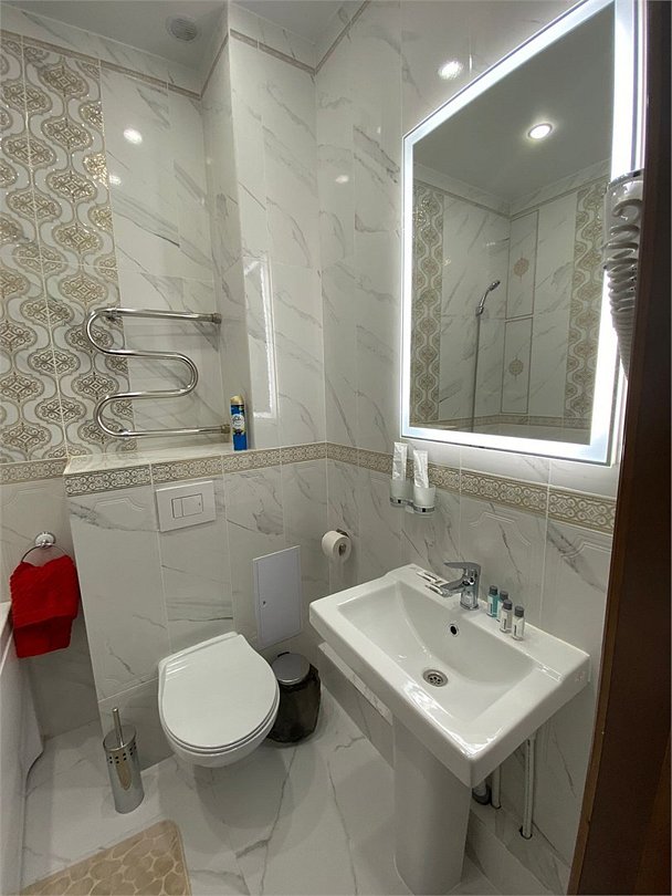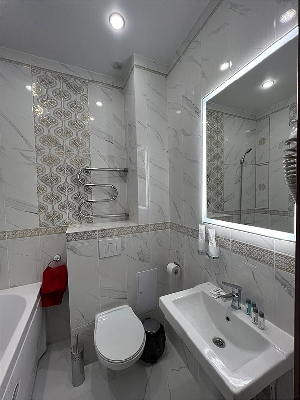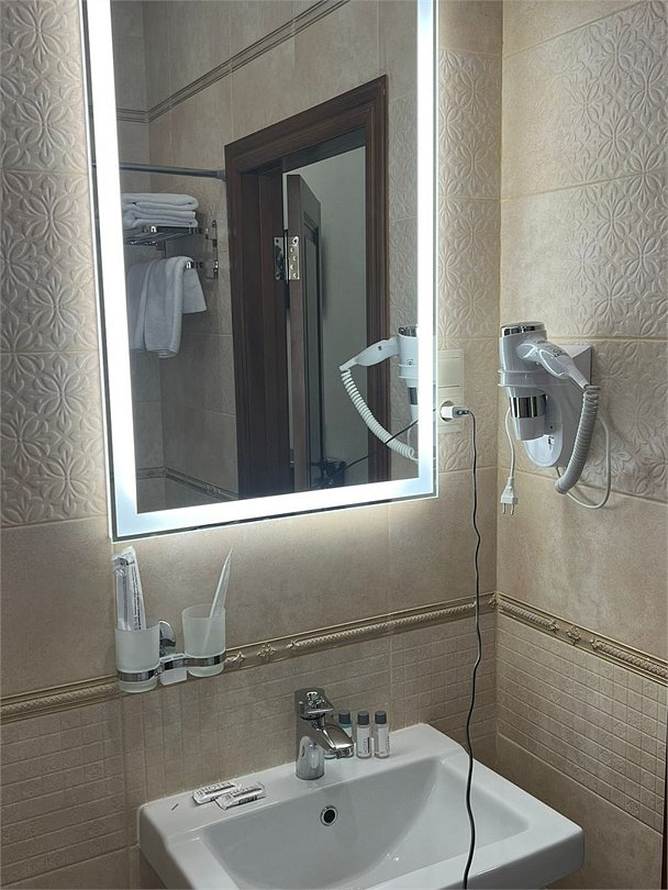 фен, электронные замки, ванна, санузел, банные полотенца, тапочки, раковина, душ, кулер на этаже, телевизор с плоским экраном, мини-холодильник, гостиничная парфюмерия, телевизор со Smart TV, шапочка для душаВ гостиничном номере