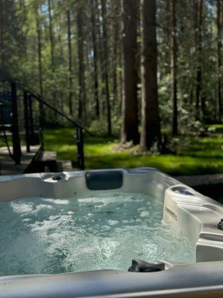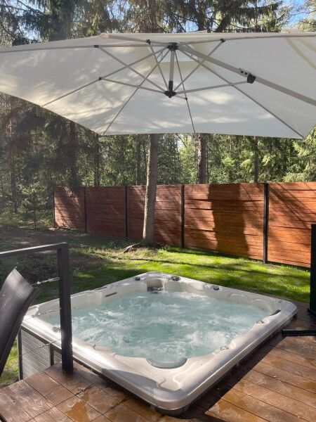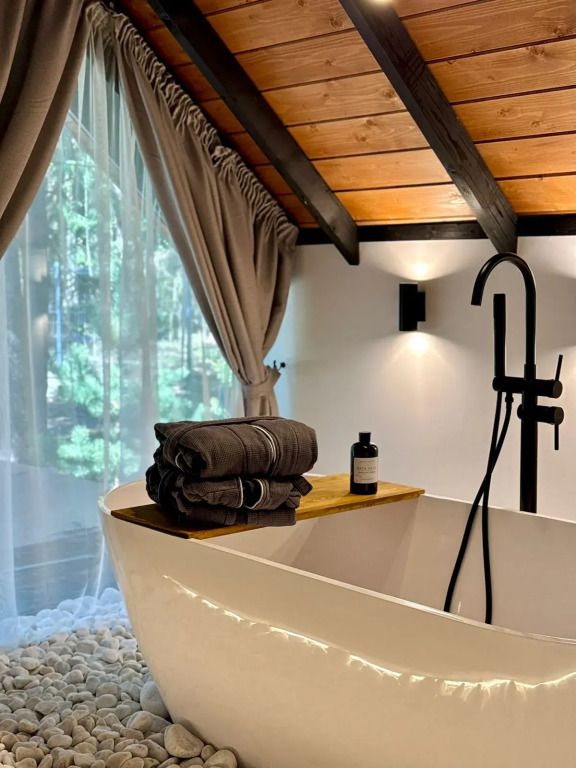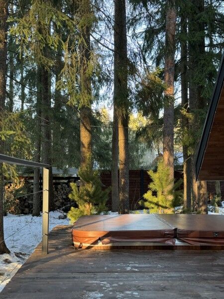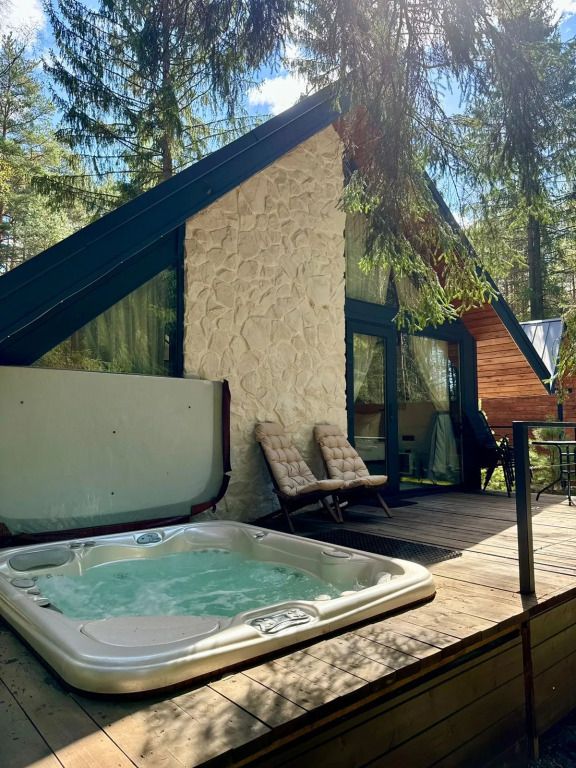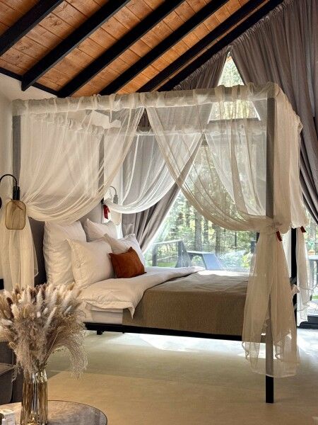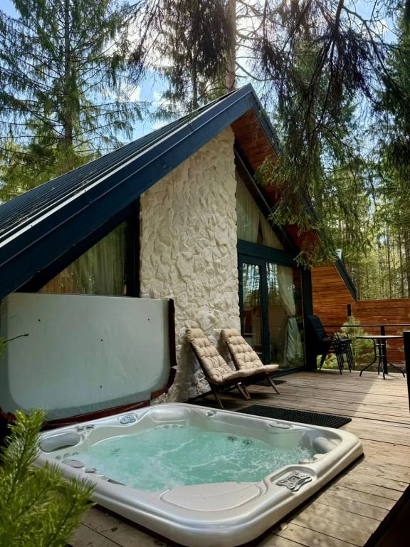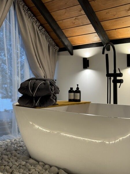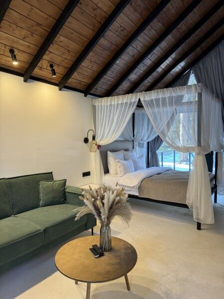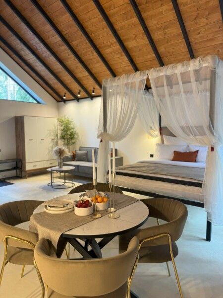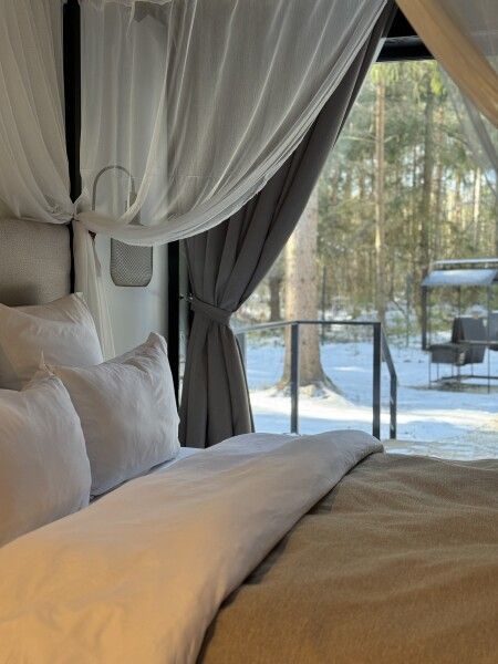 Каждый момент вашего пребывания станет поистине особенным благодаря премиальному уличному спа-бассейну с подогревом. Для гостей предусмотрена отдельностоящая ванна с панорамным видом на лес — идеальное место, чтобы расслабиться и насладиться атмосферой уюта. А дизайнерская кровать с балдахином станет великолепным завершением вашего дня, даря невероятный комфорт и ощущение роскоши.