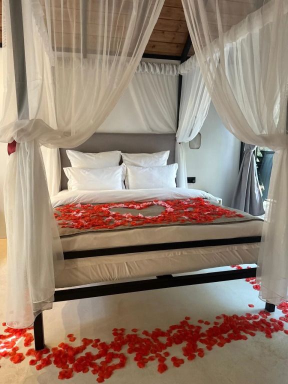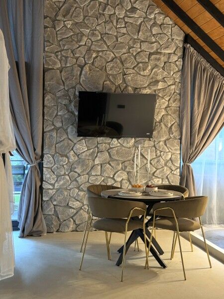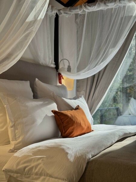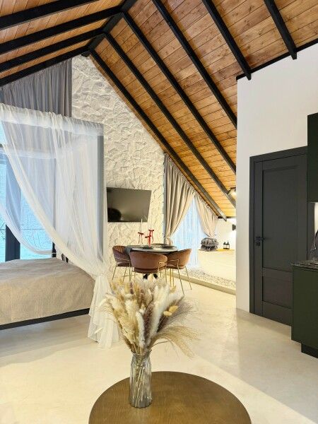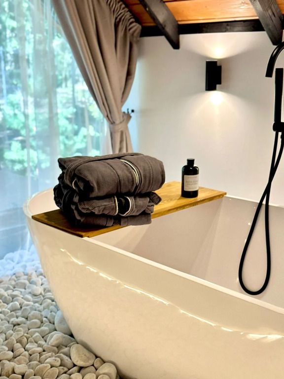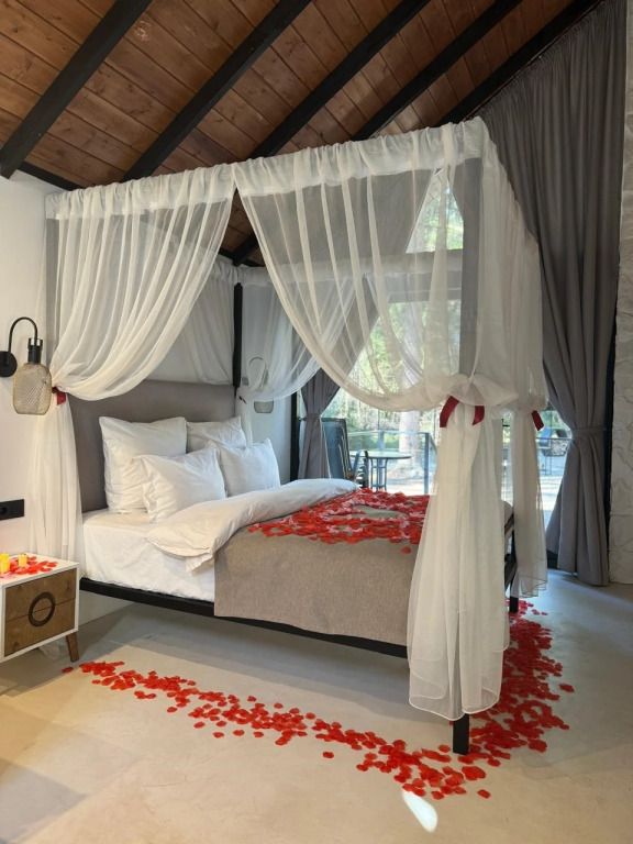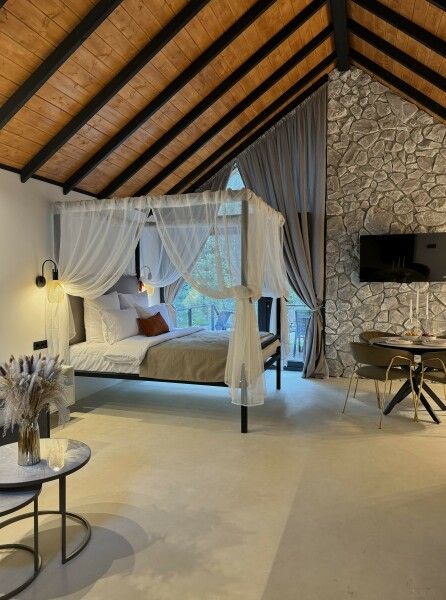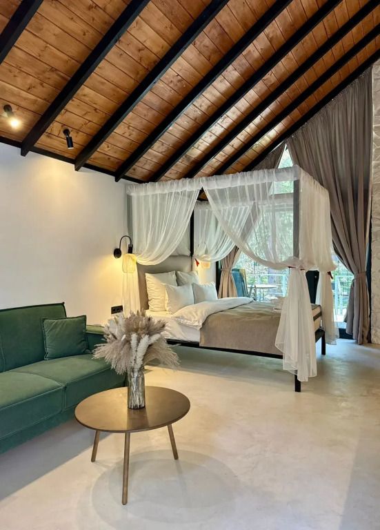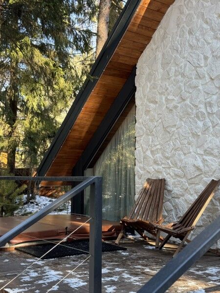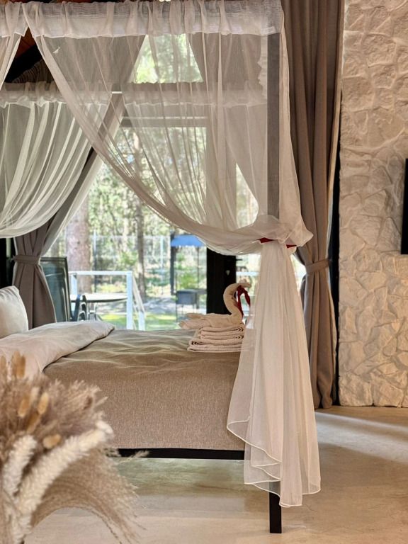 Каждый момент вашего пребывания станет поистине особенным благодаря премиальному уличному спа-бассейну с подогревом. Для гостей предусмотрена отдельностоящая ванна с панорамным видом на лес — идеальное место, чтобы расслабиться и насладиться атмосферой уюта. А дизайнерская кровать с балдахином станет великолепным завершением вашего дня, даря невероятный комфорт и ощущение роскоши.