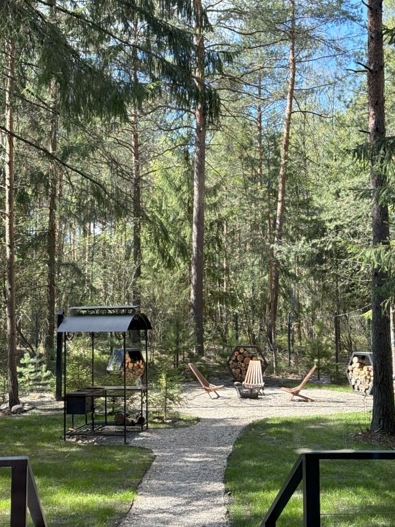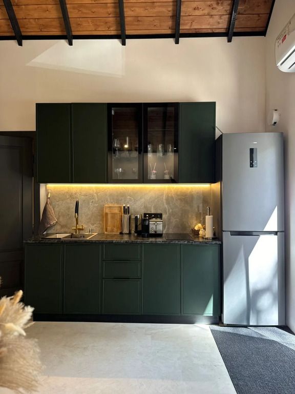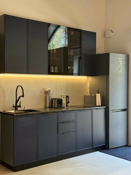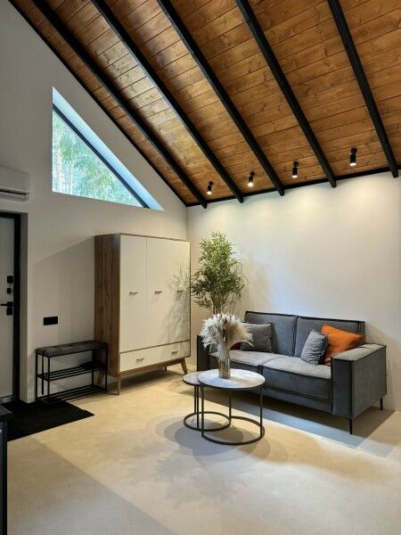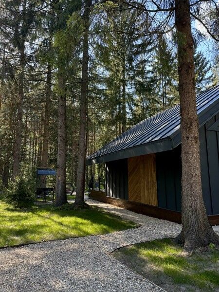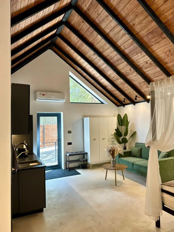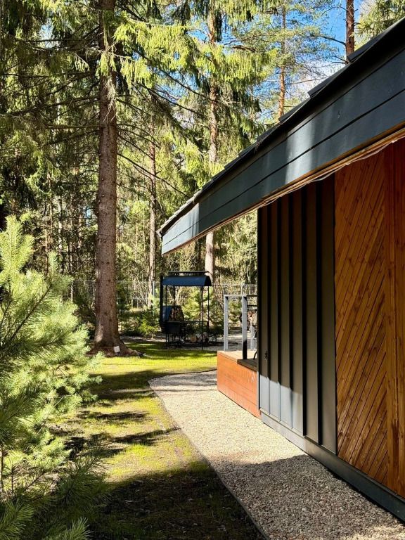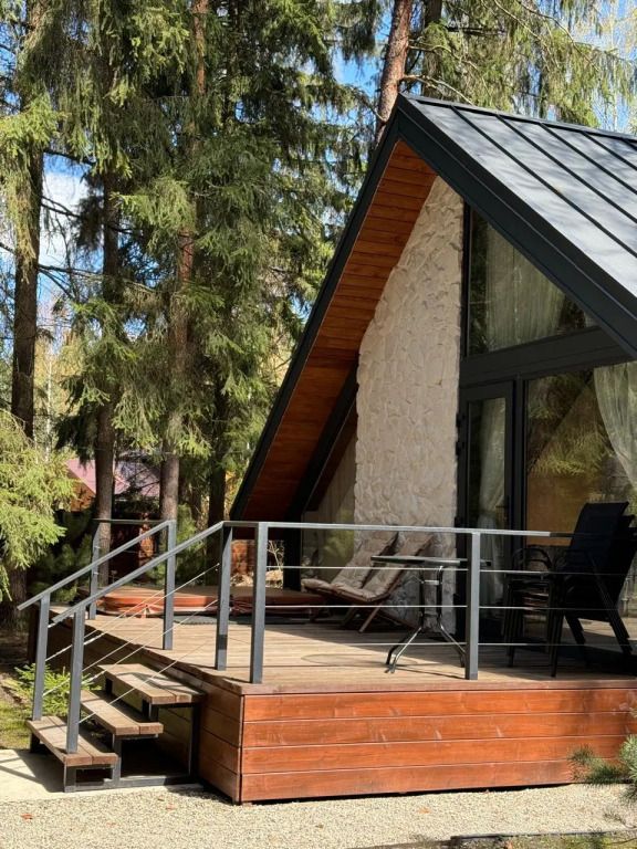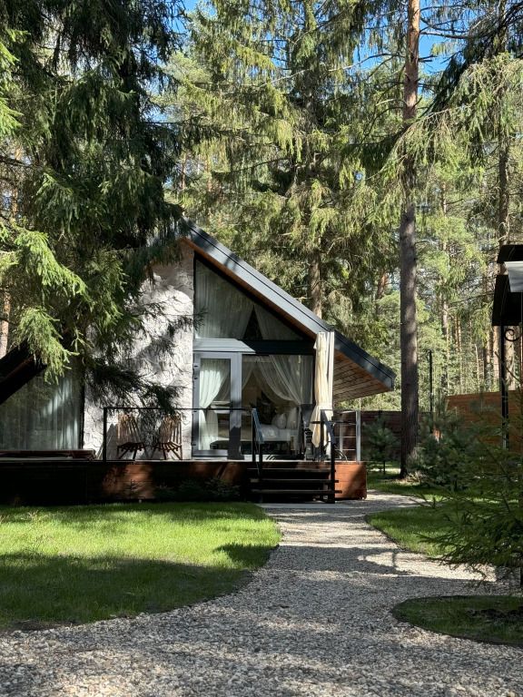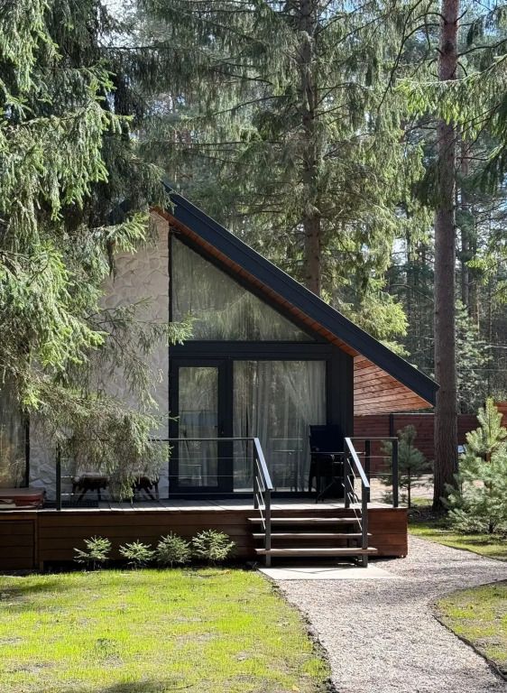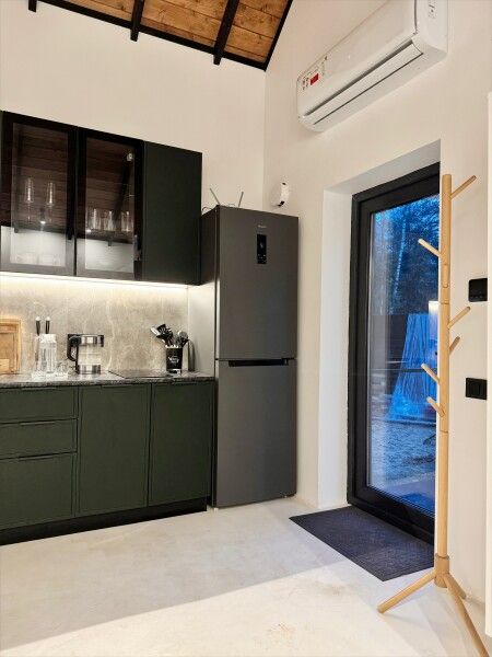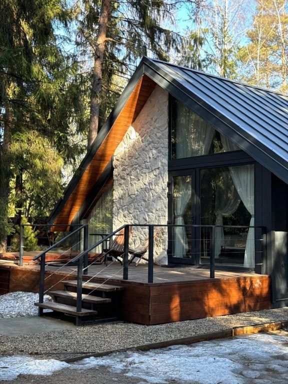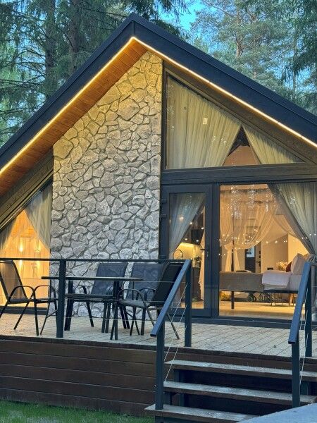 Высокие потолки добавляют воздушности, а панорамные окна наполняют пространство светом и создают неповторимую атмосферу. Любоваться лесным пейзажем из домика — одно удовольствие! Кухня оборудована всем необходимым для создания кулинарных шедевров, а обеденная зона станет идеальным местом для праздничного обеда или романтического ужина.
