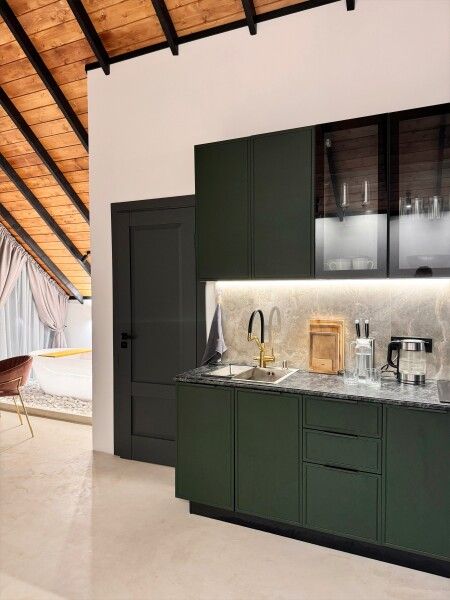 Особая изюминка домика — отдельно стоящая ванна с панорамным видом. Однако, если Вам больше по душе душ, он ждет Вас в ванной комнате. Ванная комната также подарит Вам новые ощущения, ведь для ее отделки использовались премиальные итальянские материалы.