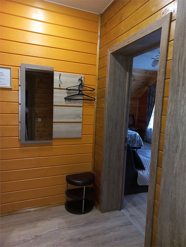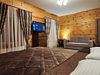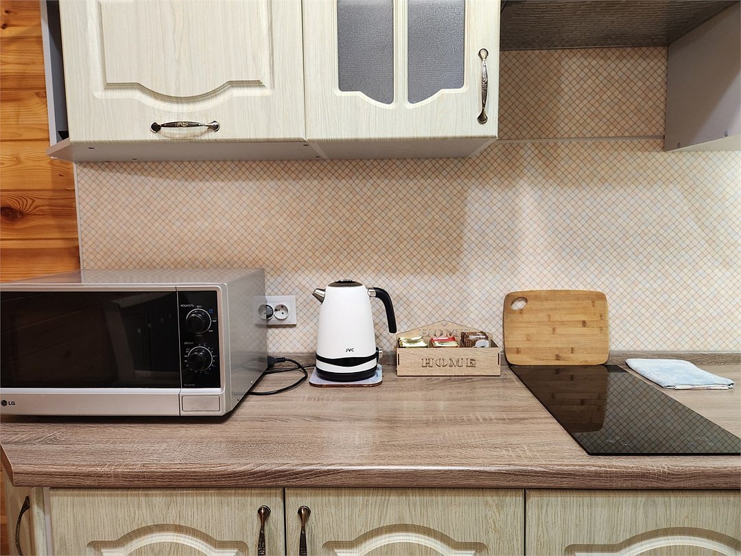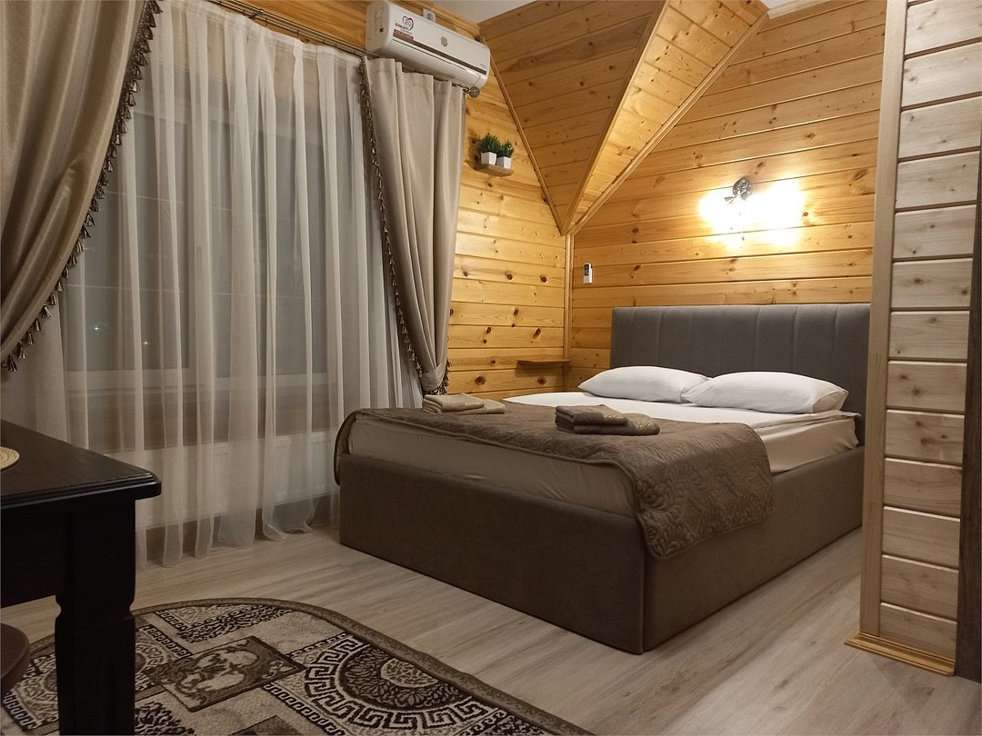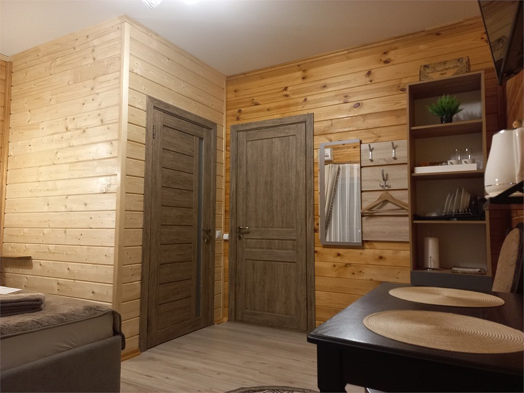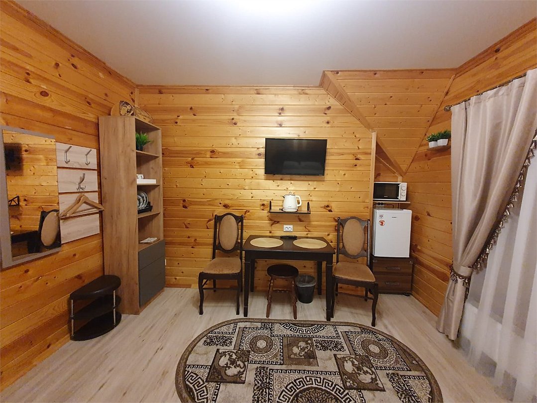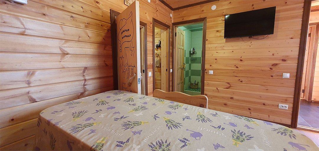 В номере двуспальная кровать, собственный санузел, холодильник, микроволновая печь ,чайник и приборы для приема пищи.Услуги и удобства