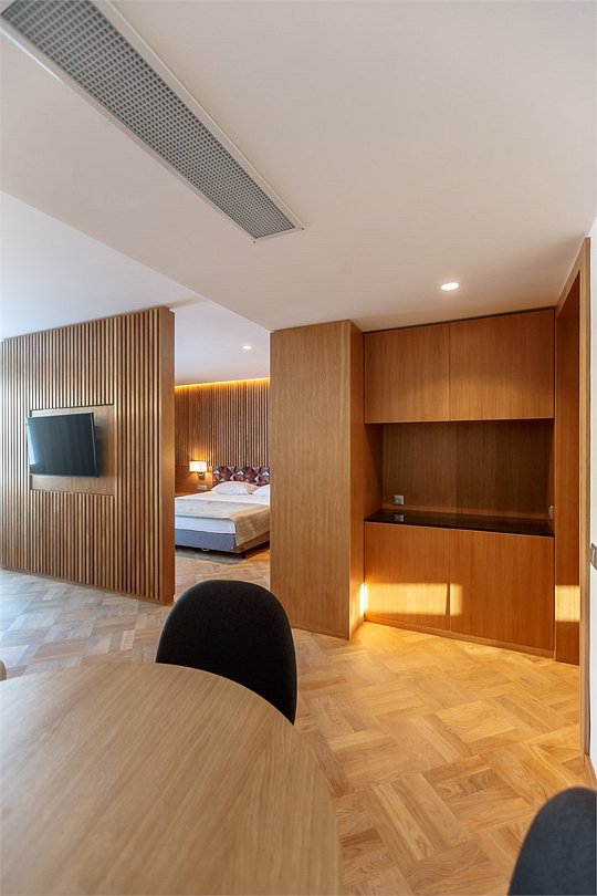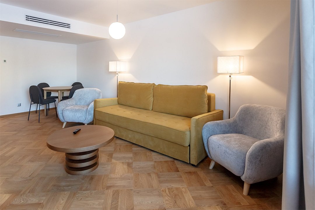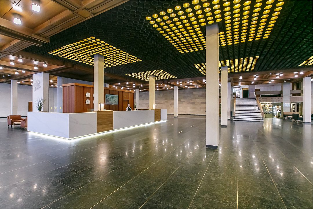 Номер реновирован в 2022 году Просторная студия для двоих площадью 60 кв. метров. Пространство разделено на гостиную и зону для сна. Каждая деталь номера тщательно продумана, чтобы обеспечить гостю максимум комфорта. Предусмотрены современные системы хранения. Встроенная плазменная панель телевизора вращается на 180 градусов и работает одновременно на две зоны. Спальное место в номере представлено в варианте широкой двуспальной кровати. Санузел номера оборудован ванной и душевой кабиной. Номер расположение в центральном ризалите основного корпуса гостиницы.Услуги и удобства