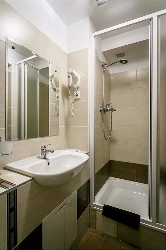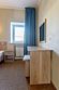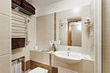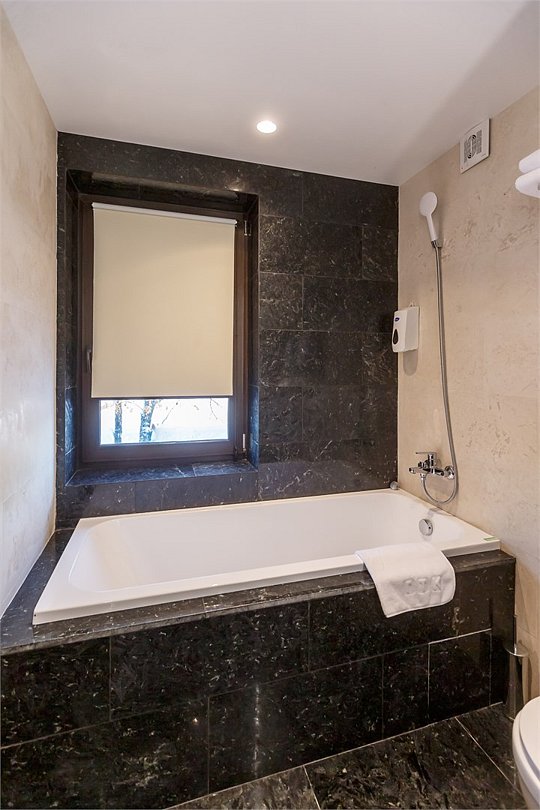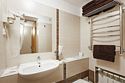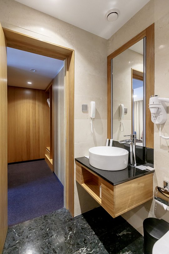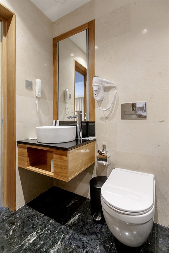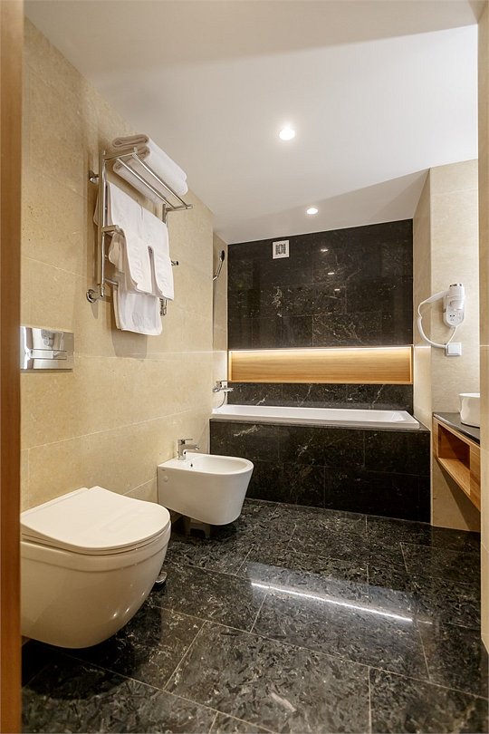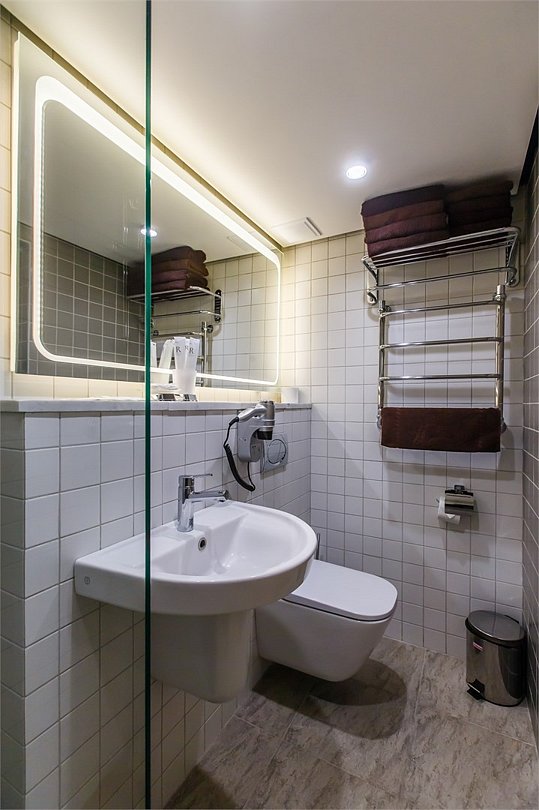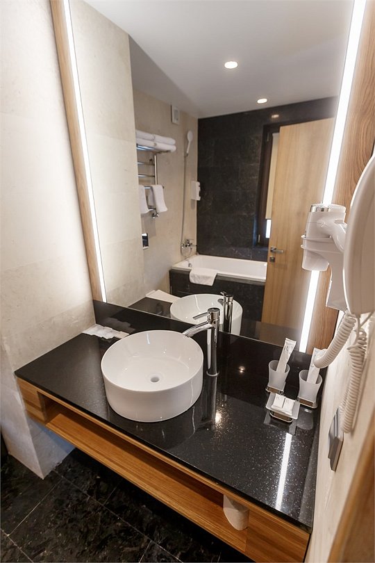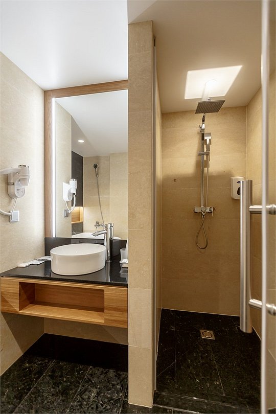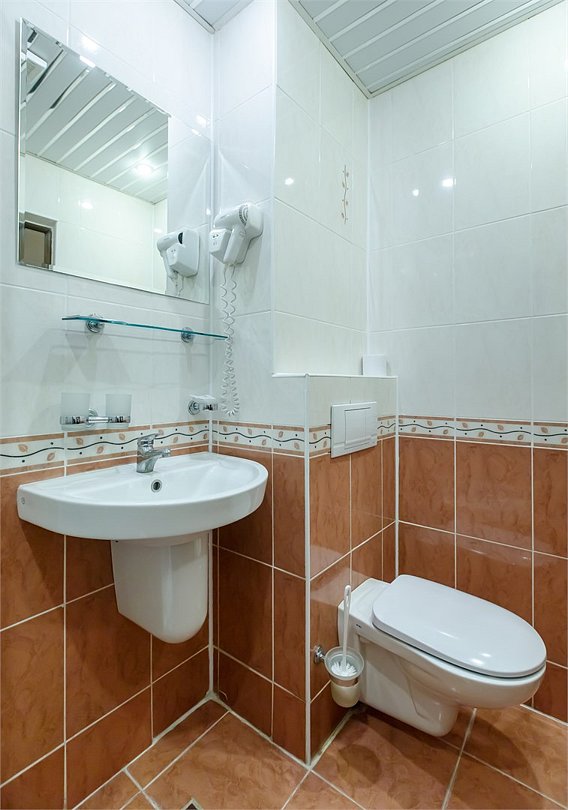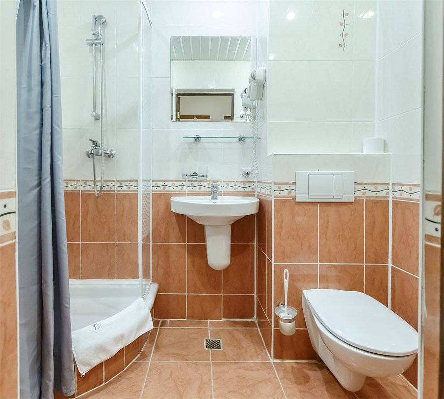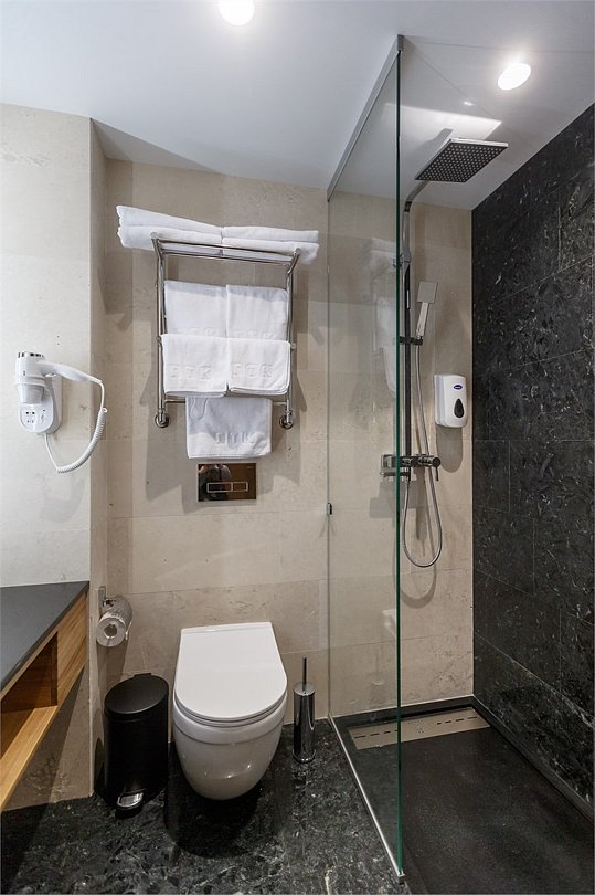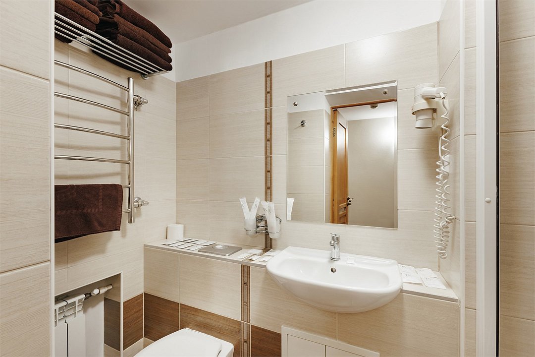 Стандартный номер, выполненный в тёплых нейтральных тонах, создаёт ощущение спокойствия и домашнего уюта. Просторный санузел стандартного номера может быть оборудован ванной или душевой кабиной.