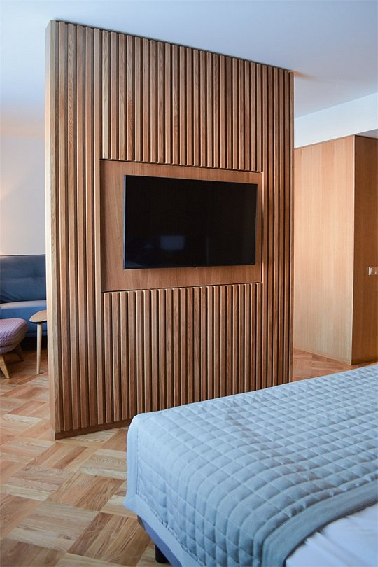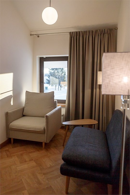 Каждый двухэтажный трёхместный номер с телевизором и имеет отдельный вход с улицы. В номере душ, туалет и две жилые комнаты на втором этаже. В некоторых номерах для размещения на дополнительном месте используется двухъярусная кровать. В стоимость проживания комплементарно входит завтрак, посещения бассейна и сауны по предварительной записи.Услуги и удобства