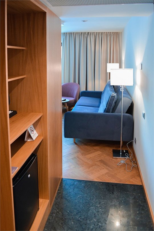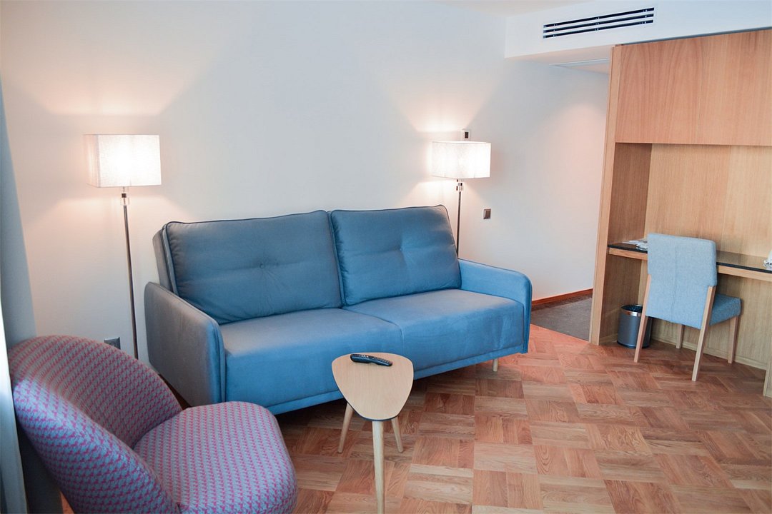 телевизор, Wi-Fi, светильник, фен, электронные замки, ванна, халаты, тапочки, двуспальная кровать, диван, гардеробная, вешалки, чайник, унитаз, вид на реку, стаканы, стул, диван-кровать, мини-холодильник, пуфик, без питомцевВ гостиничном номере