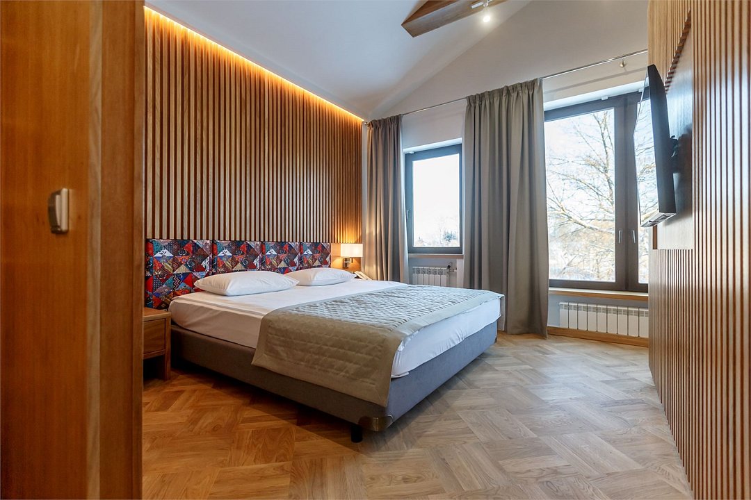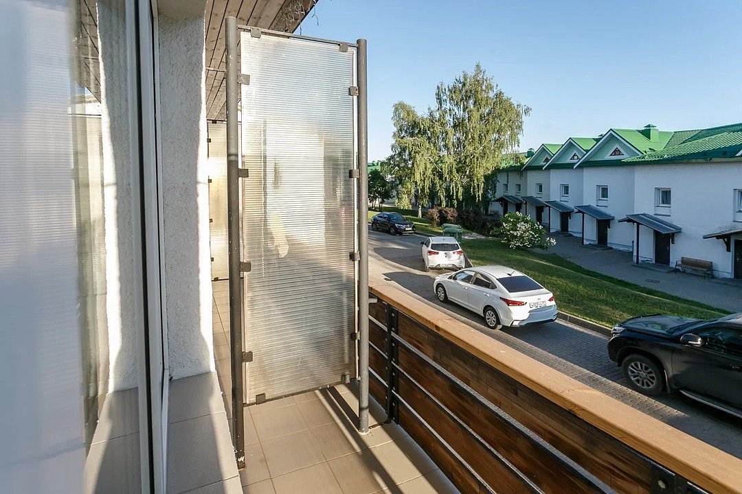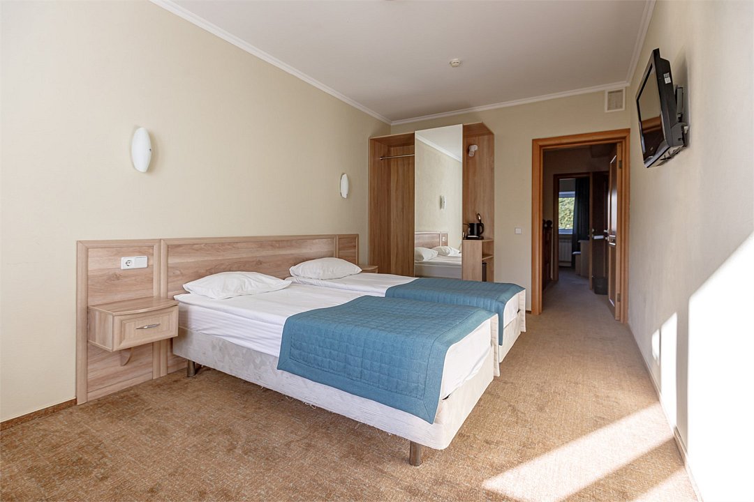 Просторный двухкомнатный номер в таунхаусе с прихожей, санузлом, двумя односпальными кроватями и одной двухэтажной. Помещения, размещенные на двух этажах, подходят для комфортного отдыха компании или семьи до 4-ех человек. Отремонтированный номер имеет отдельных вход и собственный балкон с живописным видом на территорию комплекса или берег реки Каменки. Часть номеров имеют собственный гараж на первом этаже.Услуги и удобства