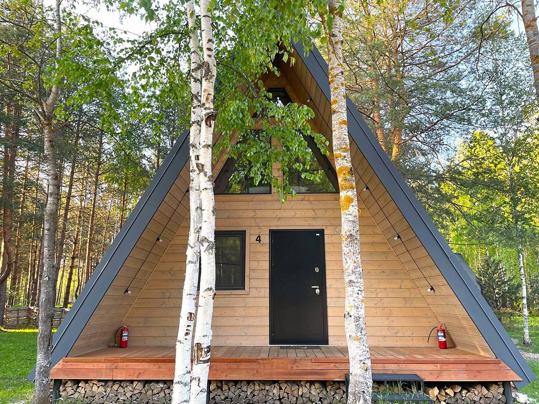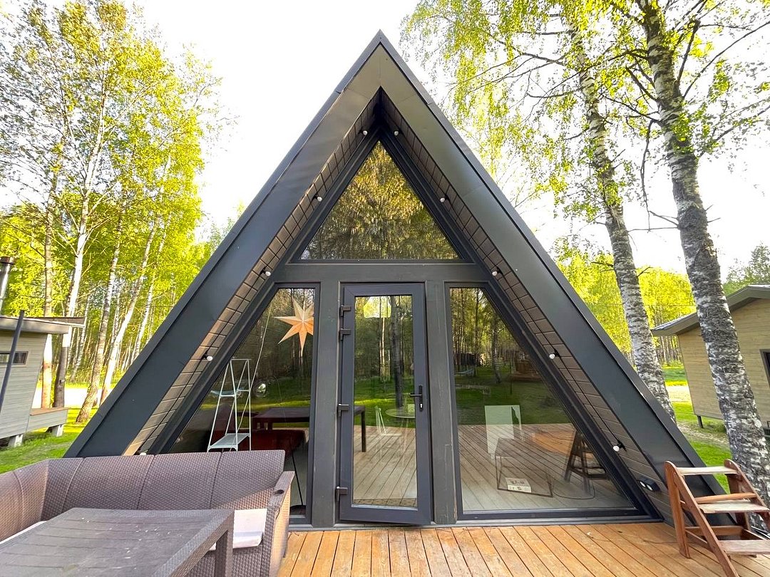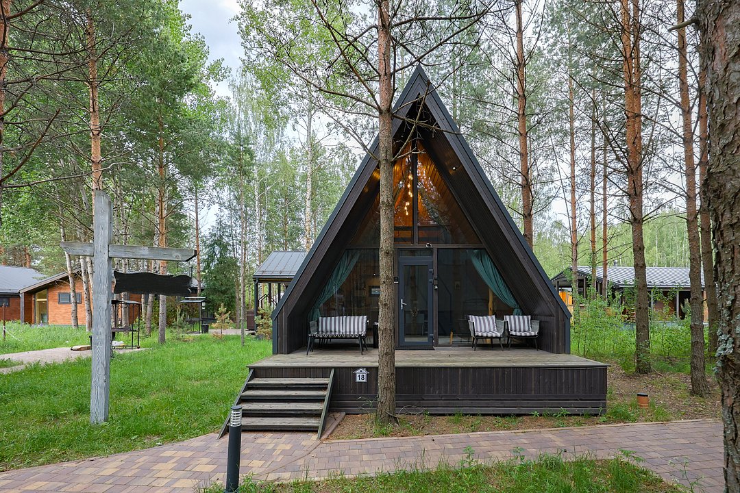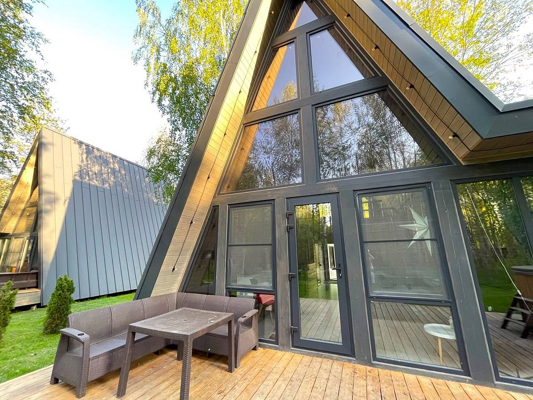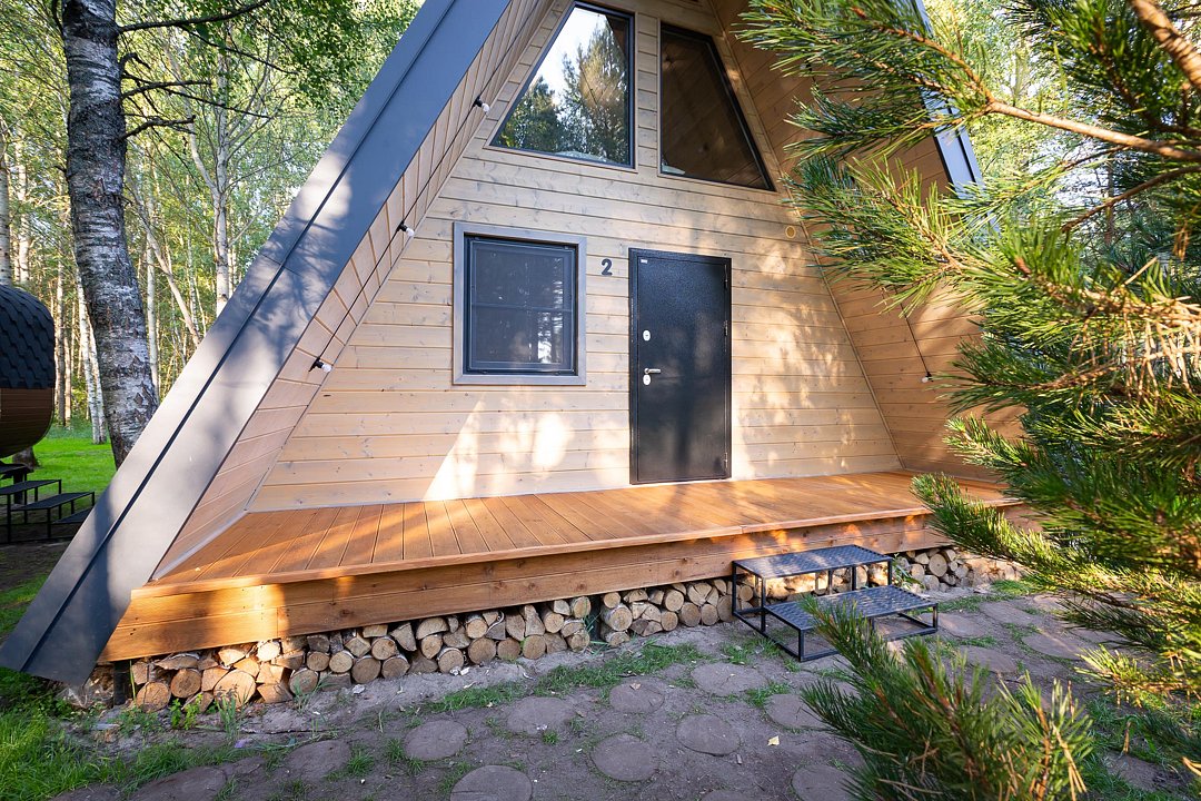 — современный A-Frame, отделка из дерева;