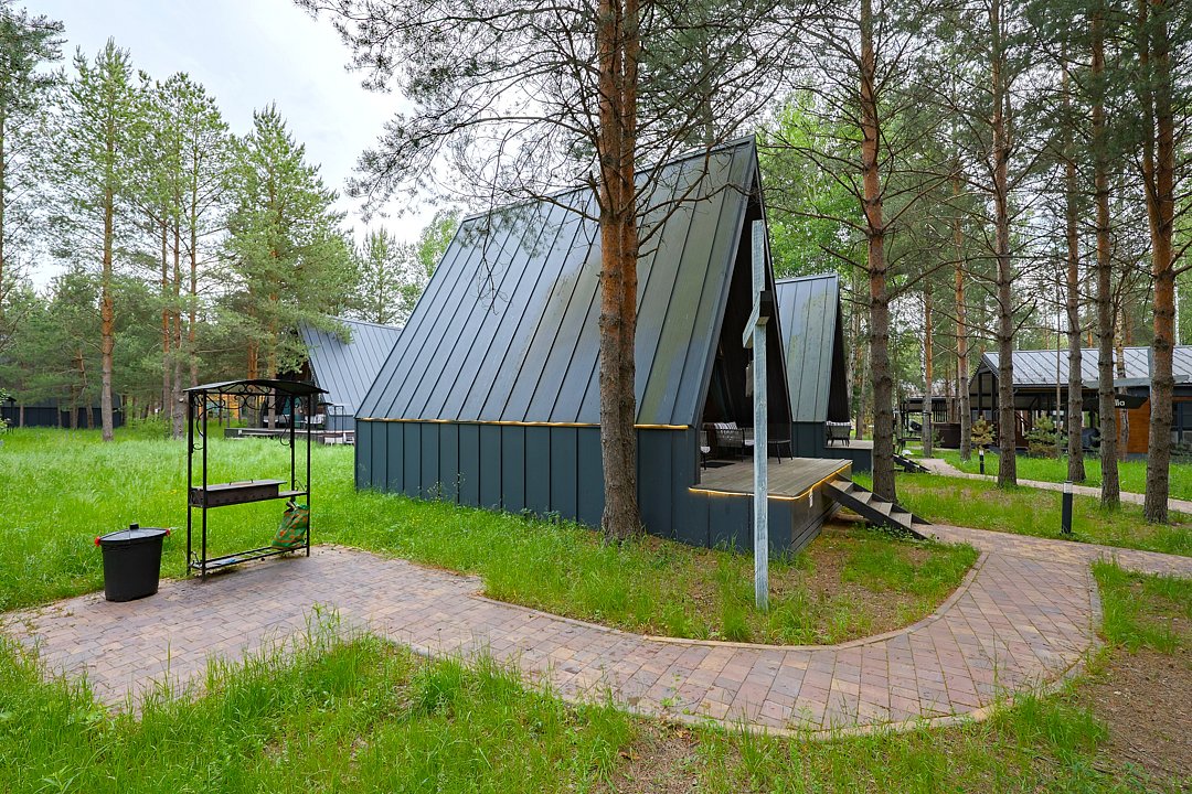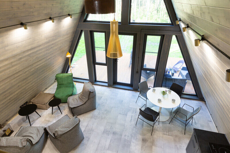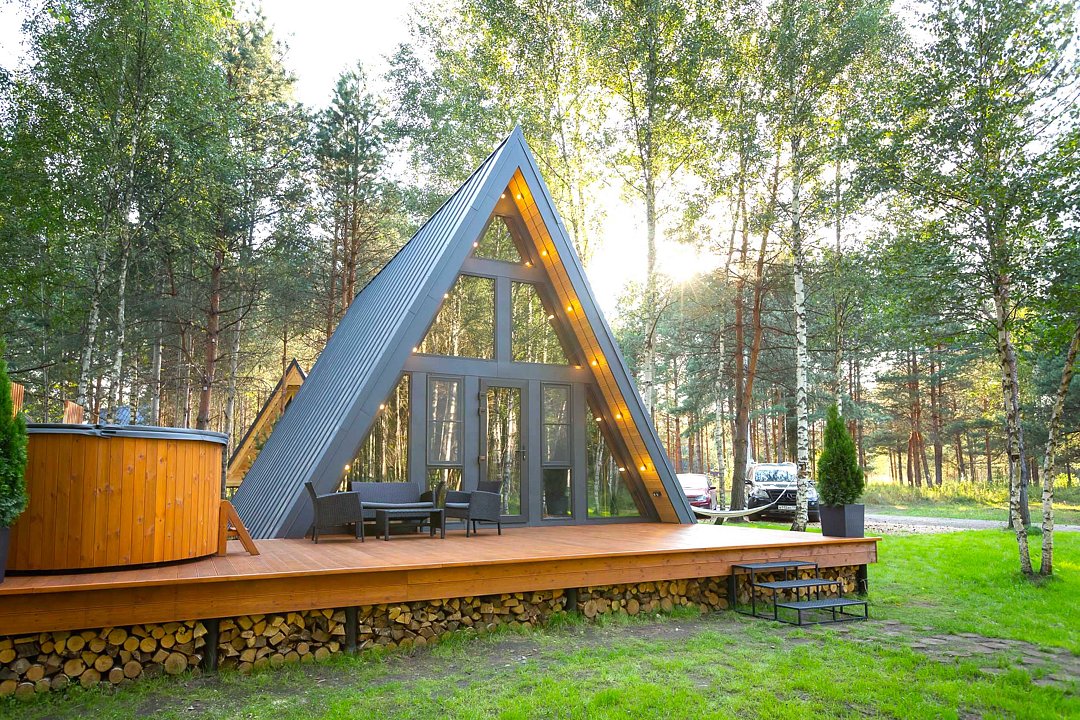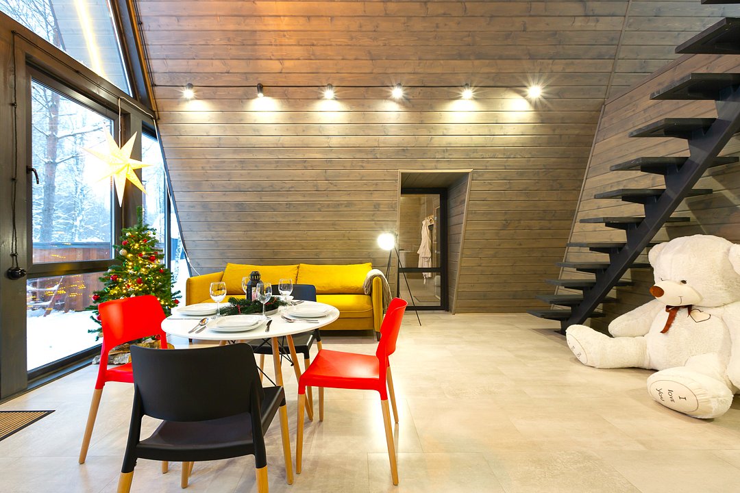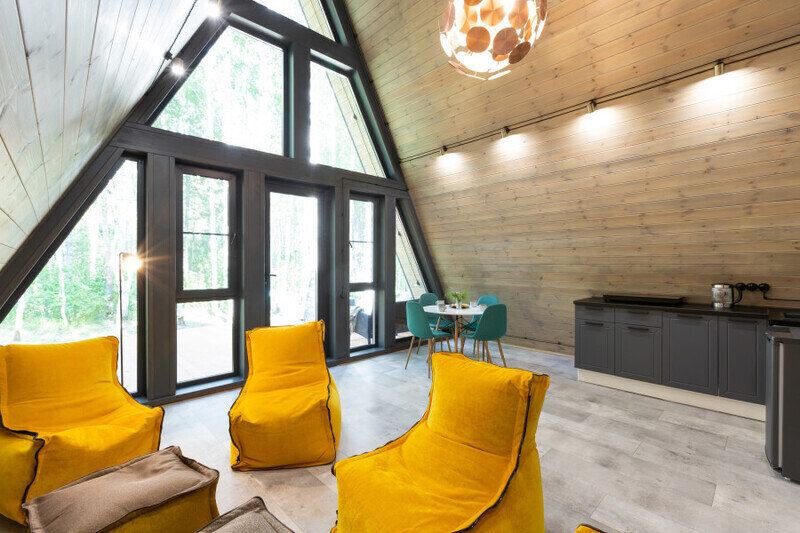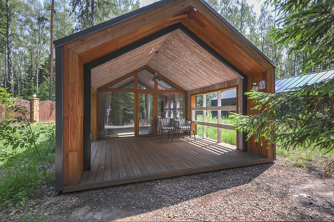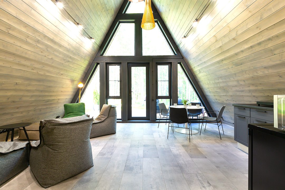 — современный A-Frame, отделка из дерева;