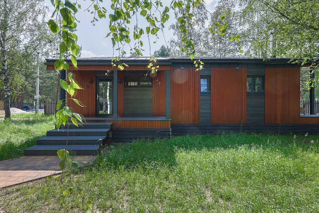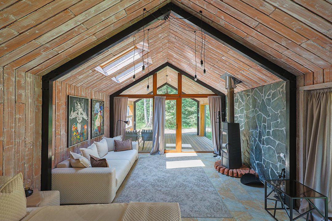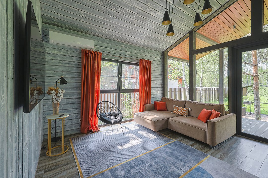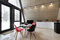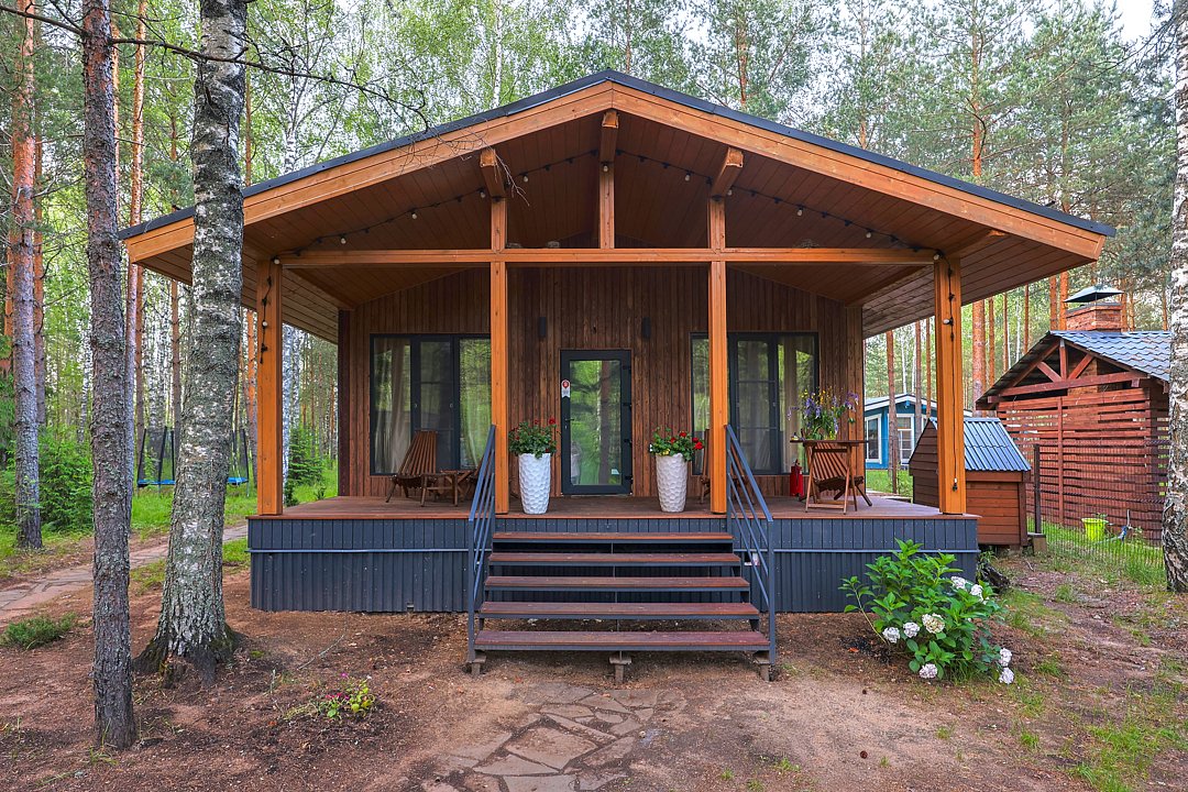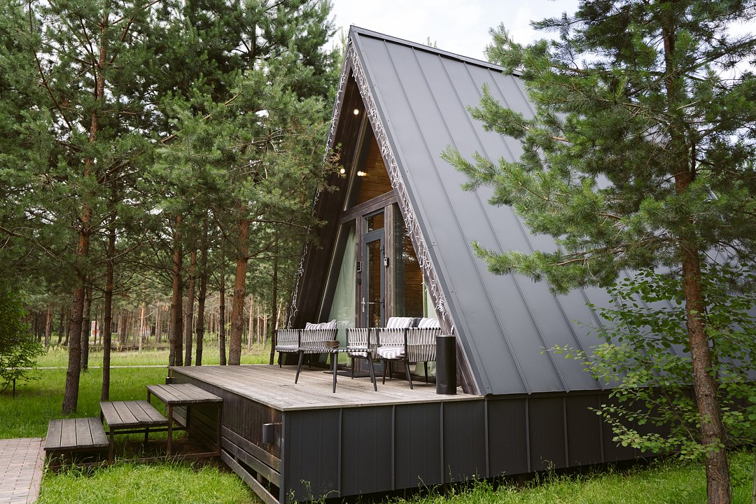 — современный A-Frame, отделка из дерева;