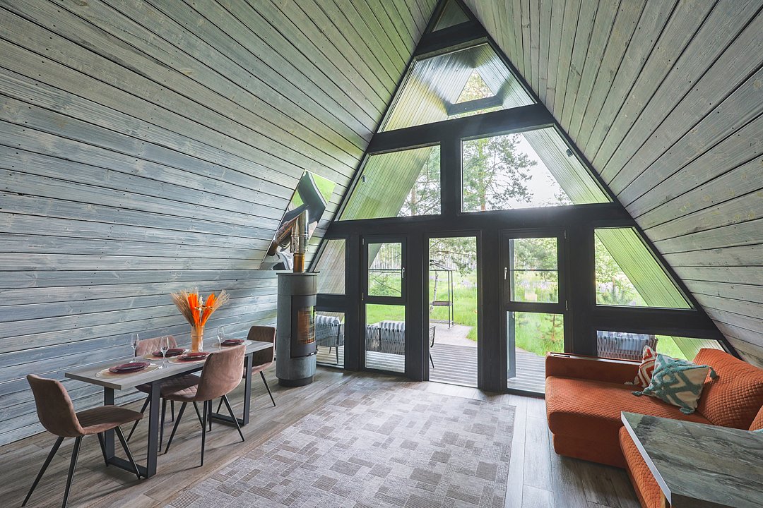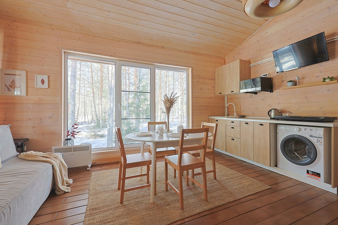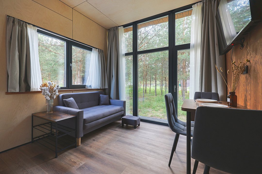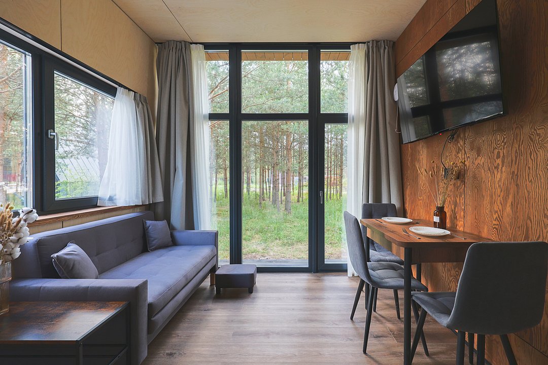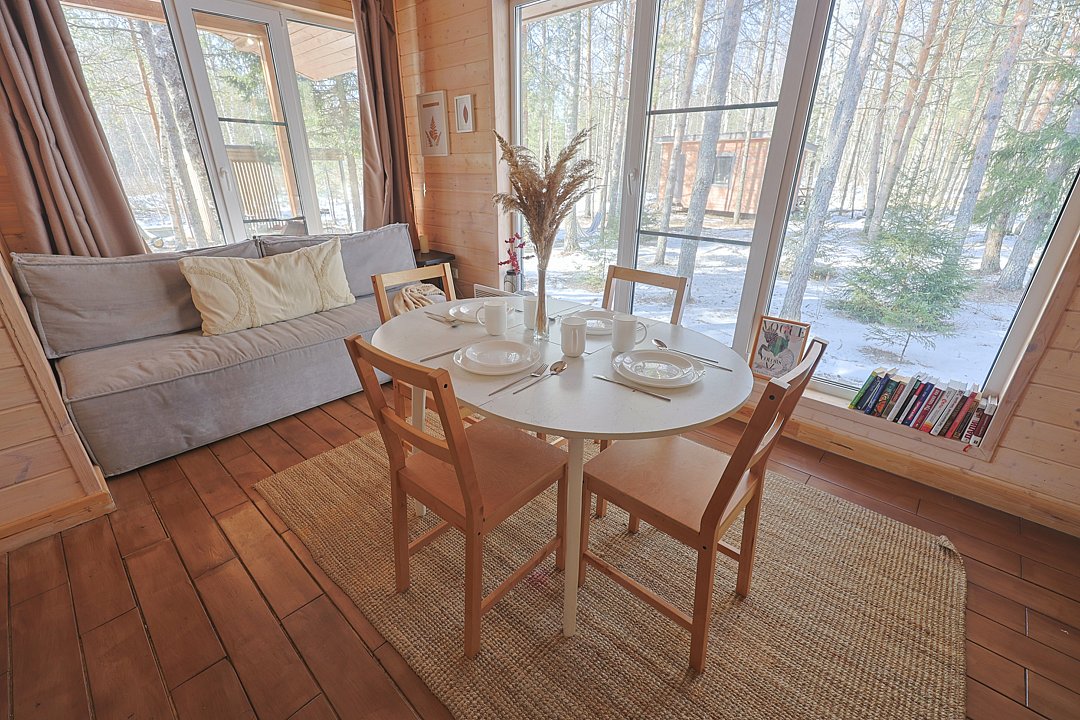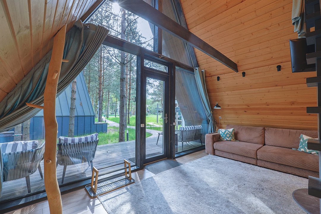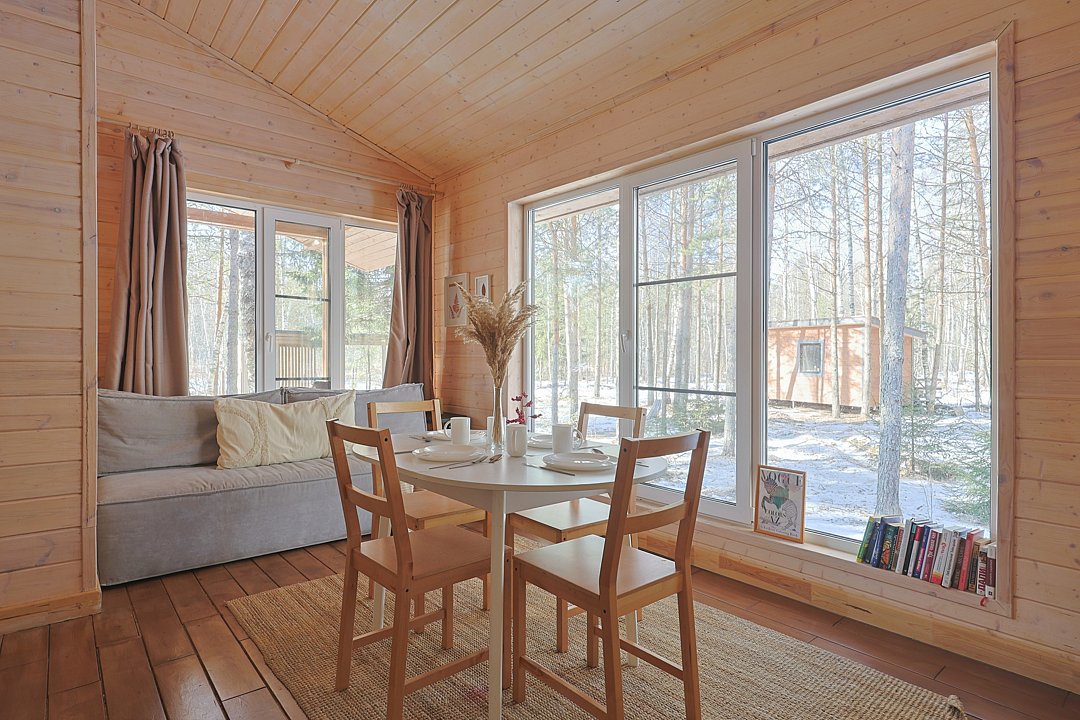 Каждый домик в глэмпинге выполнен в скандинавском дизайне, который прекрасно сочетается с минимализмом, создавая стильную и уютную атмосферу. Большие панорамные окна позволяют наслаждаться живописными видами в любое время года, а богатое естественное освещение добавляет домику света и радости.
