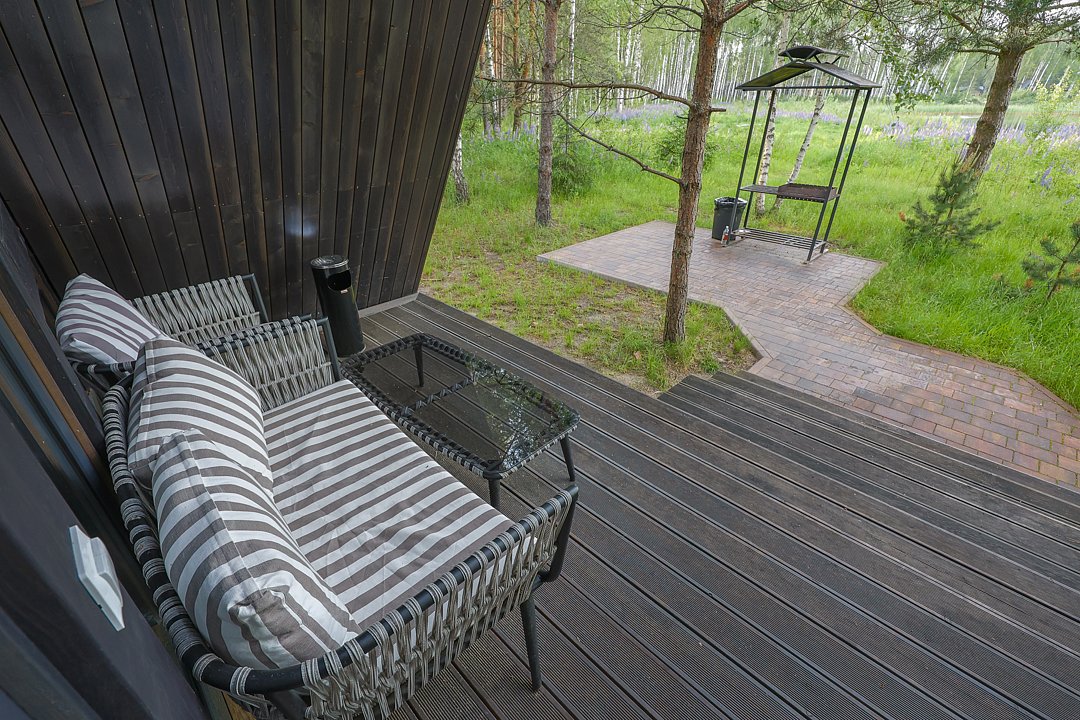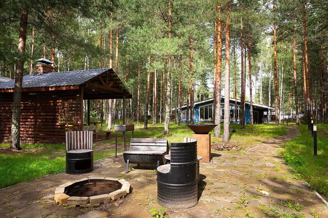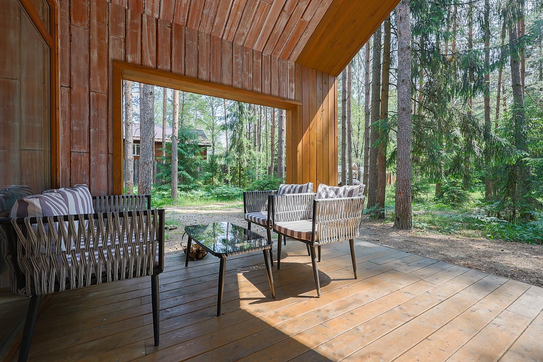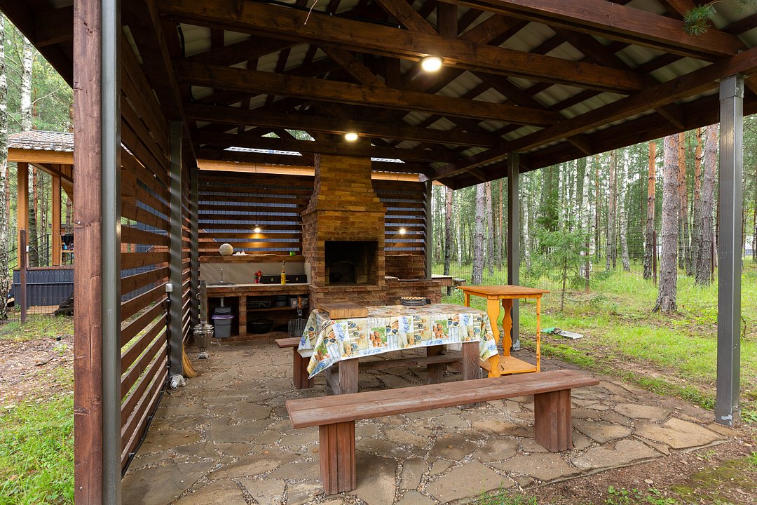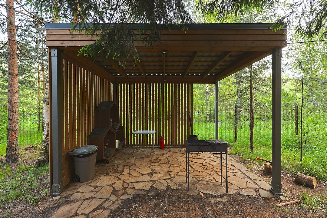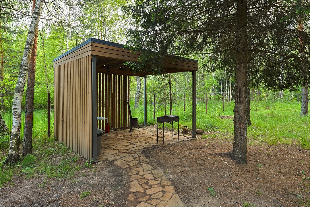 — большая терраса с уличной мебелью и индивидуальная мангальная зона в лесу;