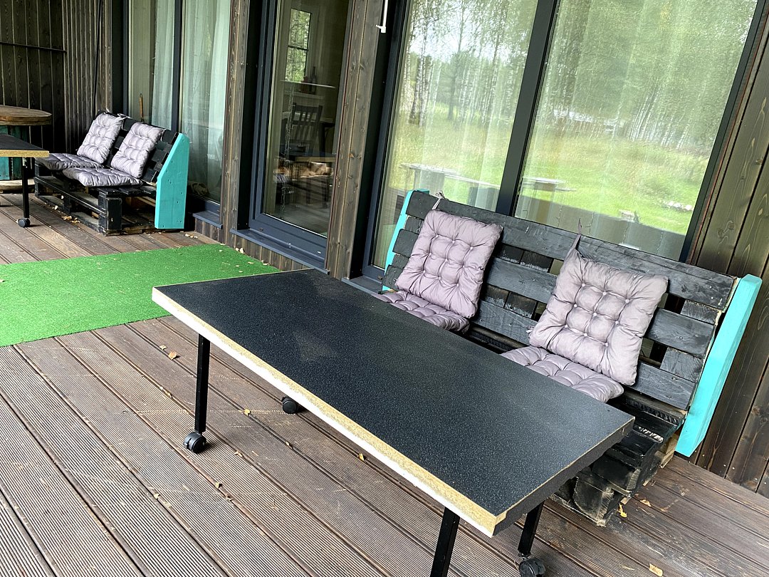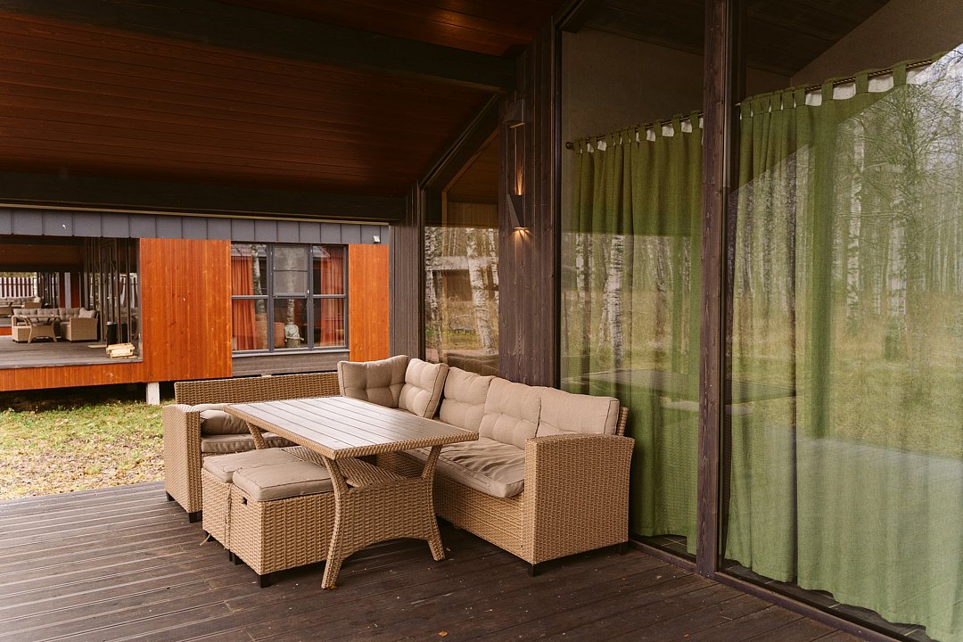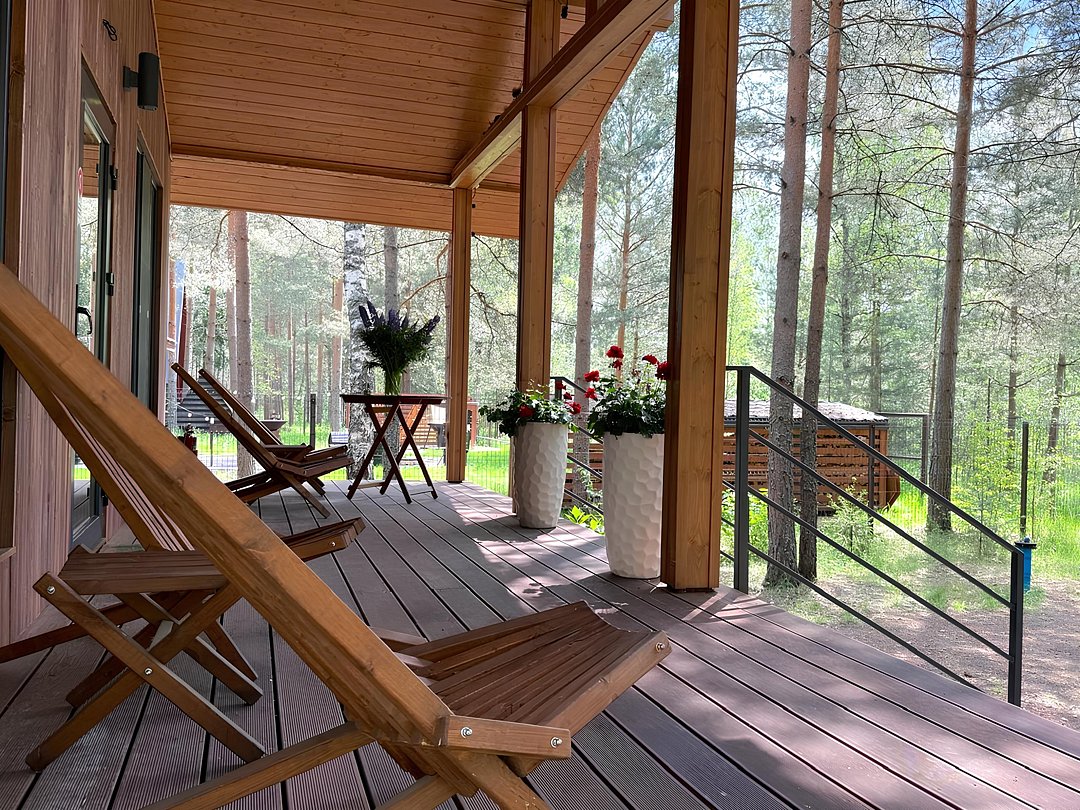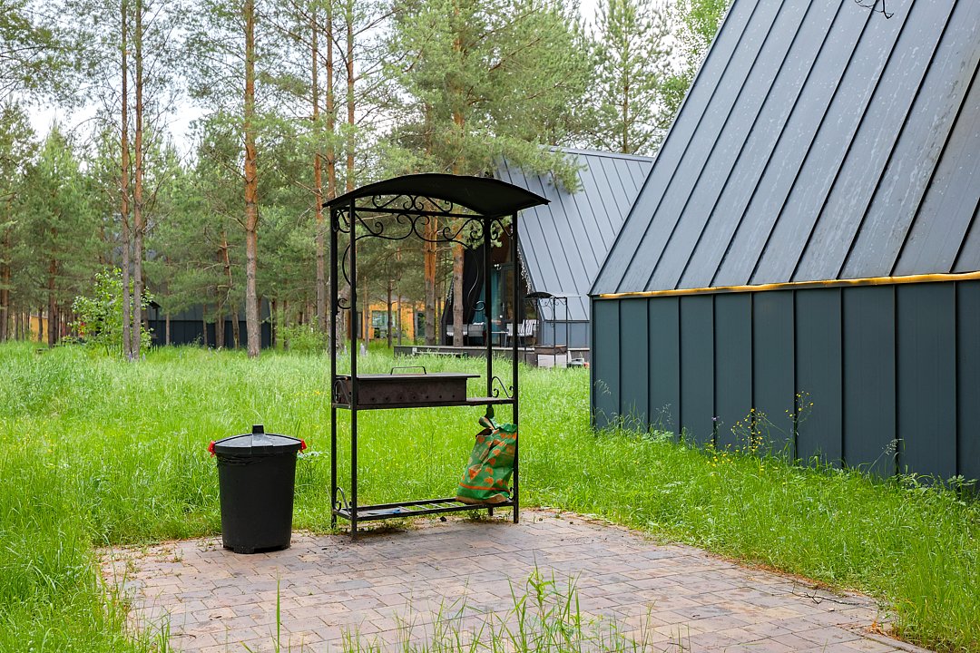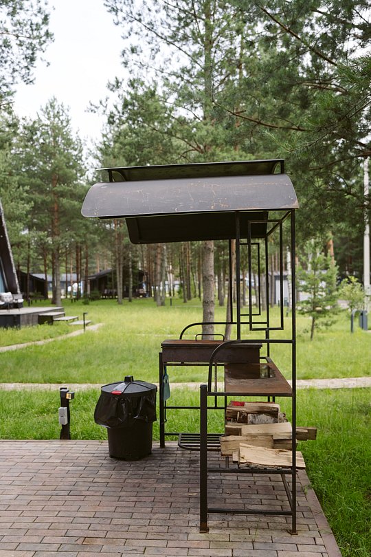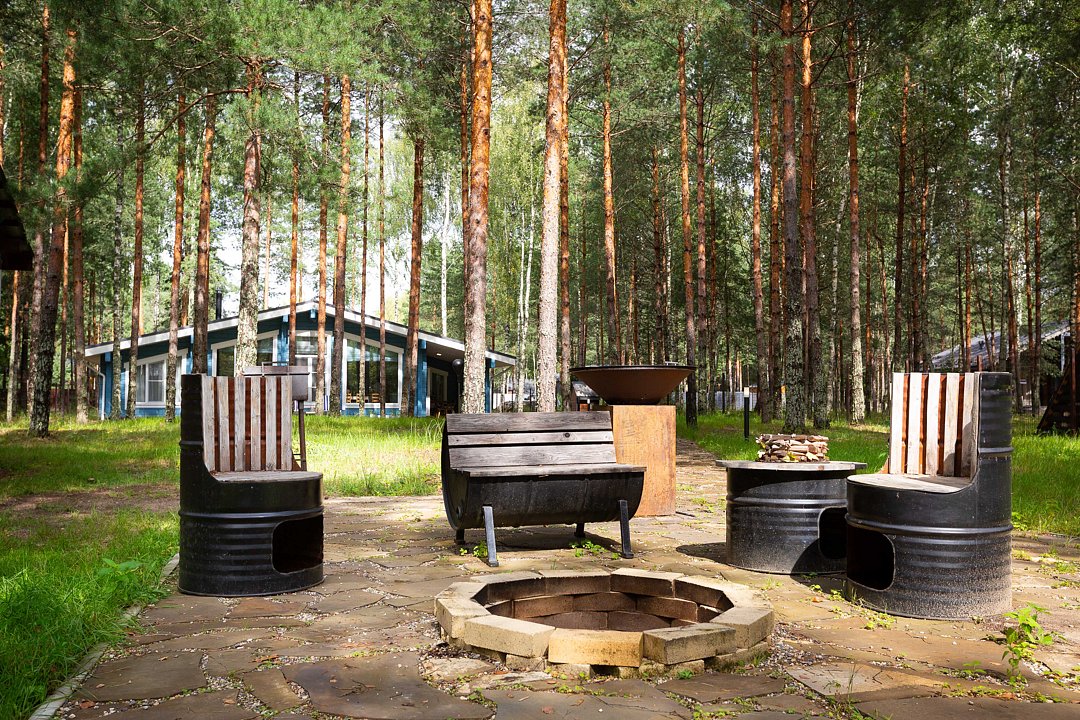 — большая терраса с уличной мебелью и индивидуальная мангальная зона в лесу;