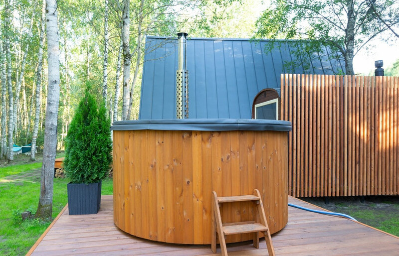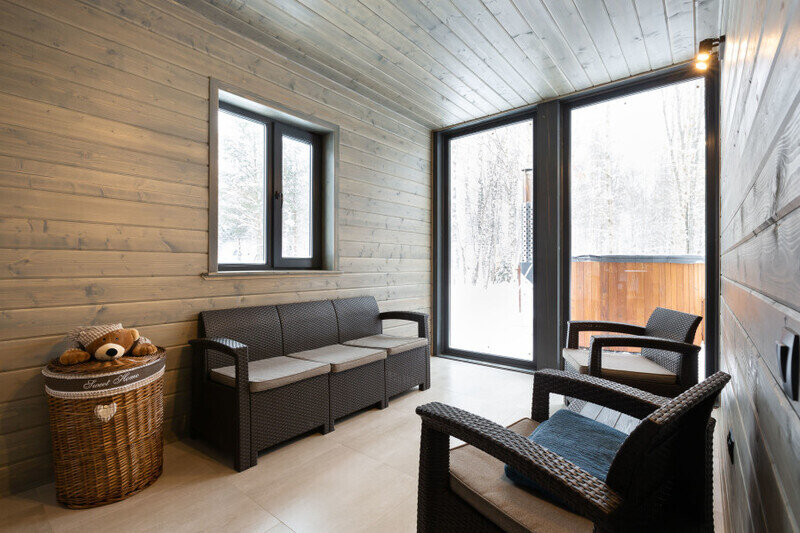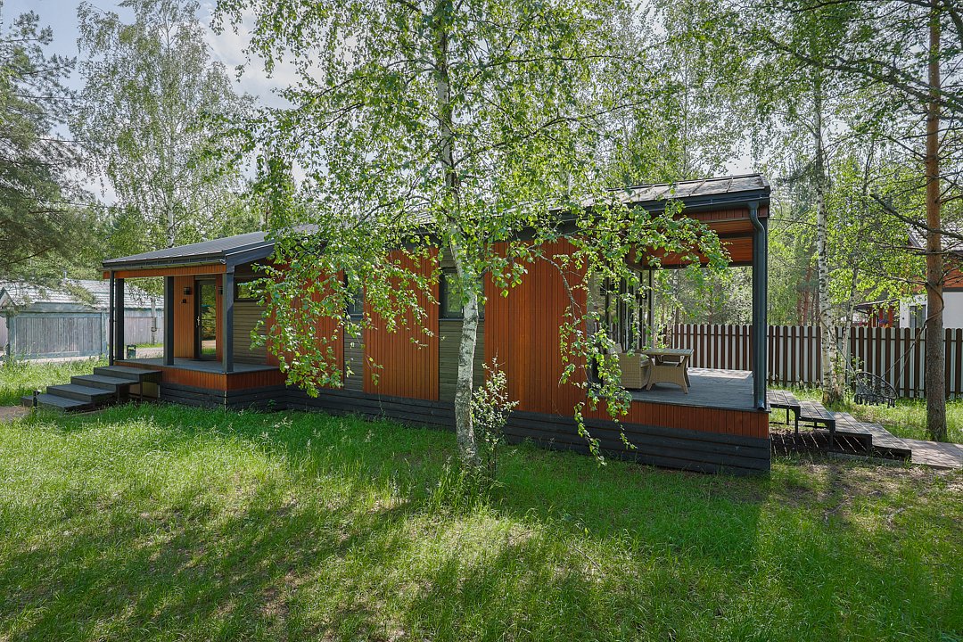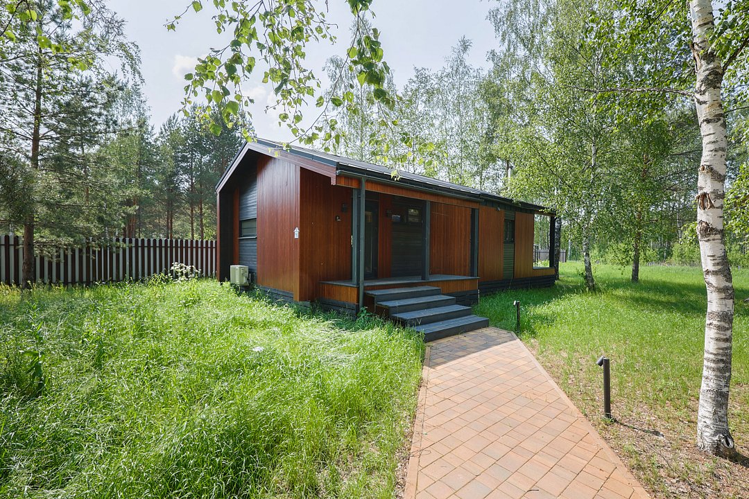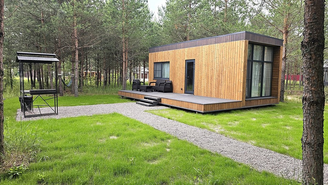 Домик 23 (Scandi с купелью, террасой и кондиционером) 25m2, из натурального дерева, одноэтажный.