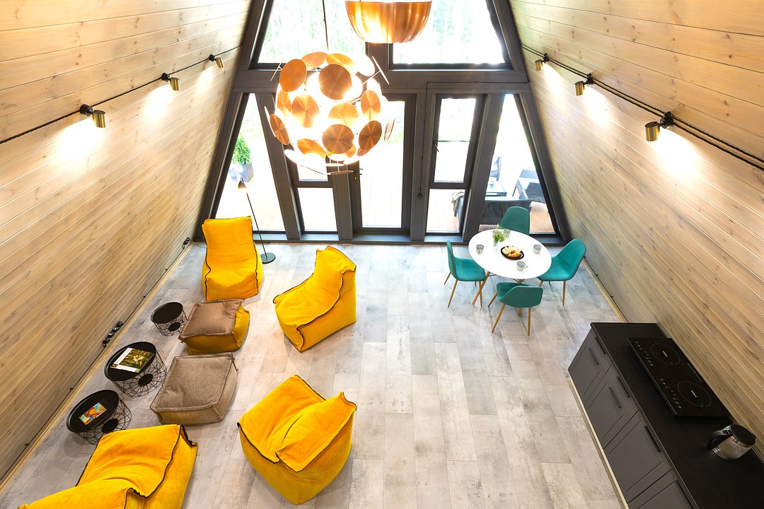 Домик 14 (A-Frame без купели) 45m2, из натурального дерева, двухэтажный включает в себя: