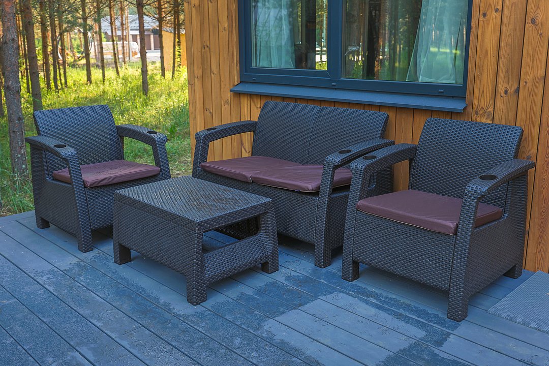 — терраса с уличной мебелью и индивидуальная мангальная зона в лесу;