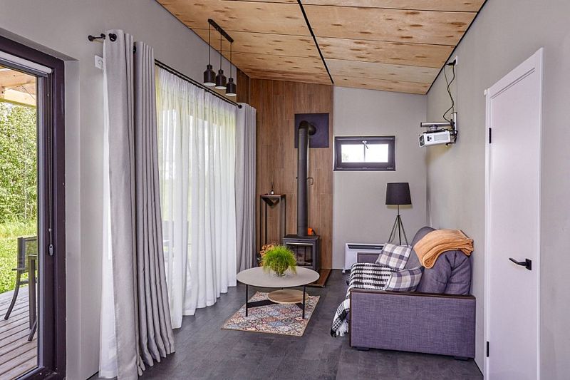Гостиная с панорамным окном и проектором, кухня, диван-кровать, печь-камин. Одна большая спальня. Санузел с душевой и теплым полом.