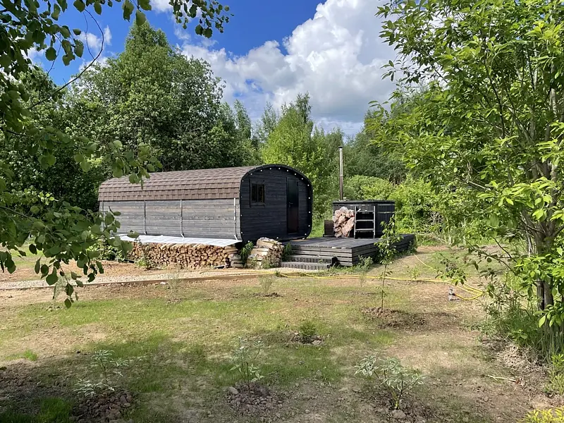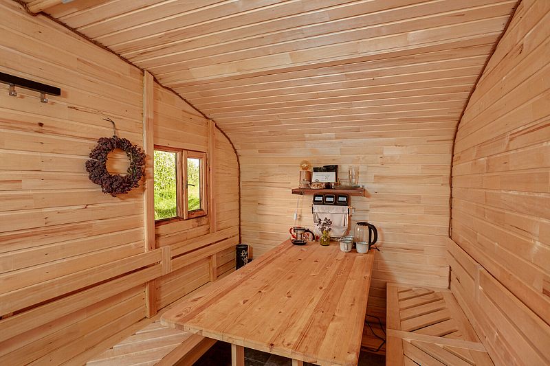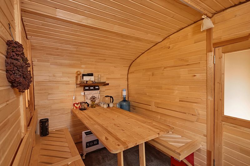 Зона отдыха оборудована всем необходимым: доступ к свежей воде, чайным принадлежностям и столовым приборам создают удобство и уют, гости могут развлечь себя настольными играми или насладиться любимой музыкой с помощью блютус-колонки. Для полного комфорта предусмотрены душевая, раковина и туалет с феном, а также 50-литровый «ливень», подключенный к колодцу, подарит освежающие моменты.