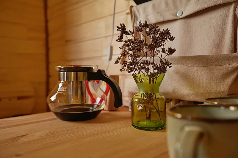 На террасе рядом с баней расположился банный чан, который приглашает гостей окунуться в теплую воду, наполненную восхитительными ароматами пихты и грейпфрута. Это укромное местечко, где можно по-настоящему насладиться природой и расслабиться от городской суеты.