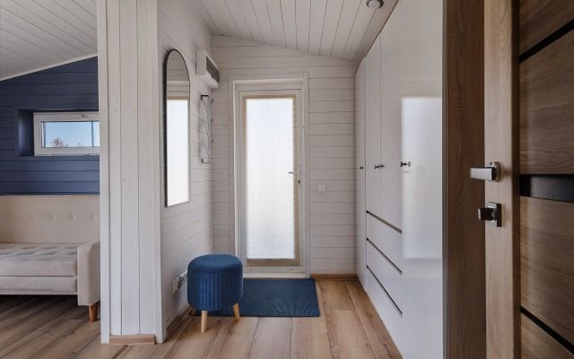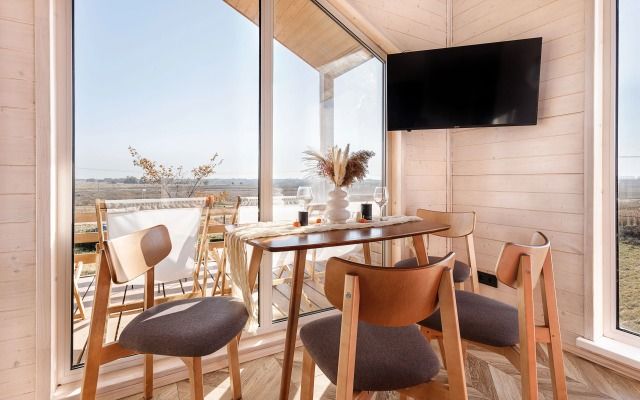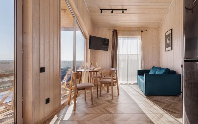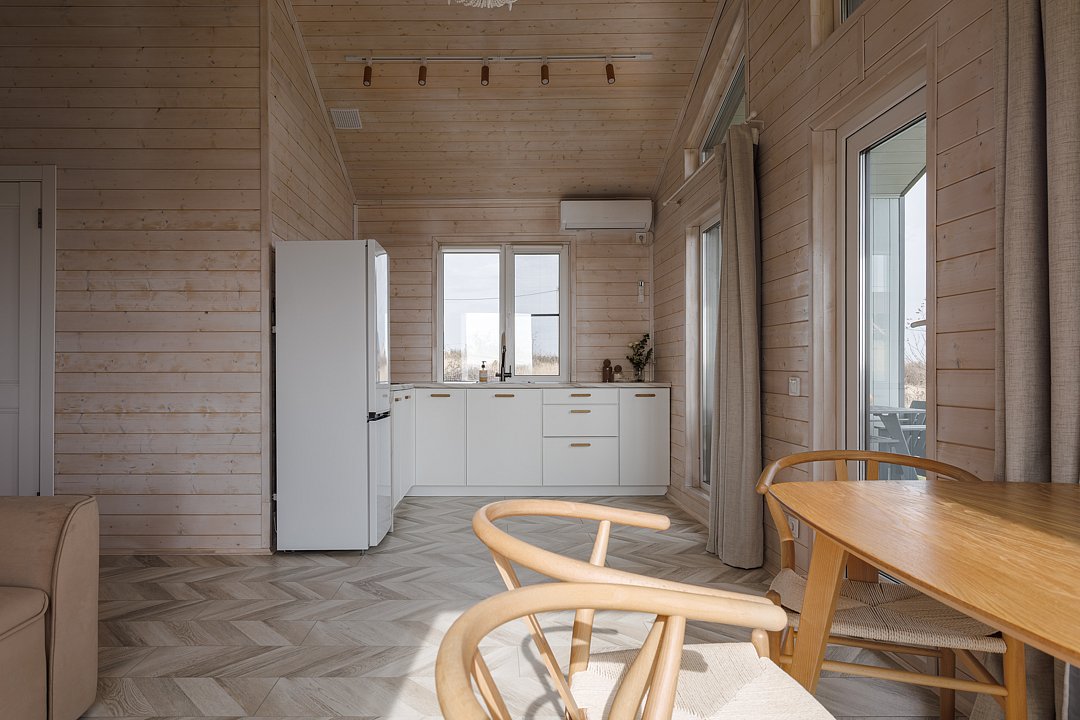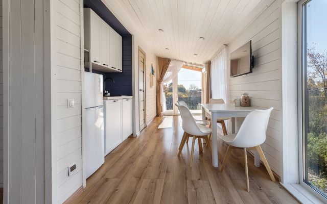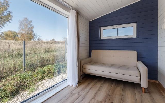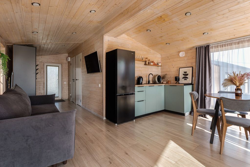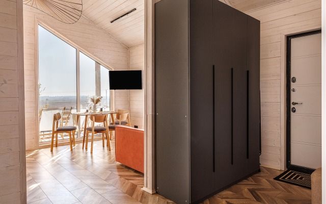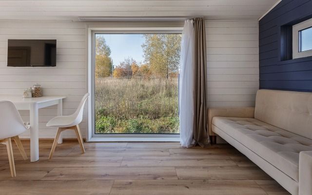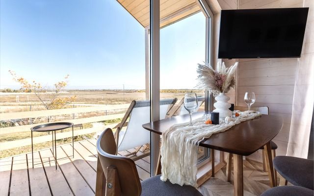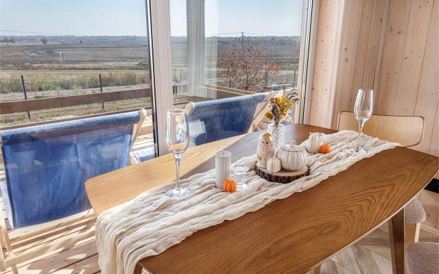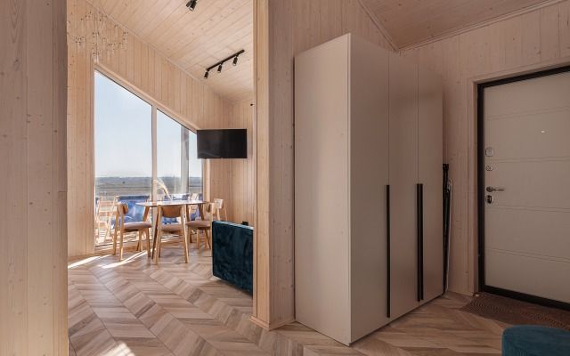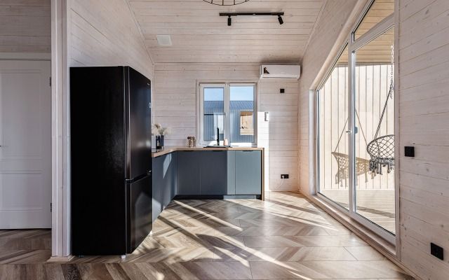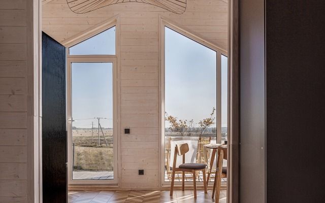 Из панорамных окон открывается прекрасный вид на окружающую природу, создавая ощущение единения с живописными пейзажами. В доме оборудована кухня, где можно самостоятельно готовить любимые блюда, а также есть возможность воспользоваться мангалом, что делает отдых ещё более приятным.