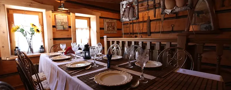 Меню - блюда русской кухни: самолепные пельмени, домашнее сало, щи и уха, блинчики с икрой. Русский стол дополнят классические суздальские напитки - медовуха, хреновуха, квас, наливки и настойки.