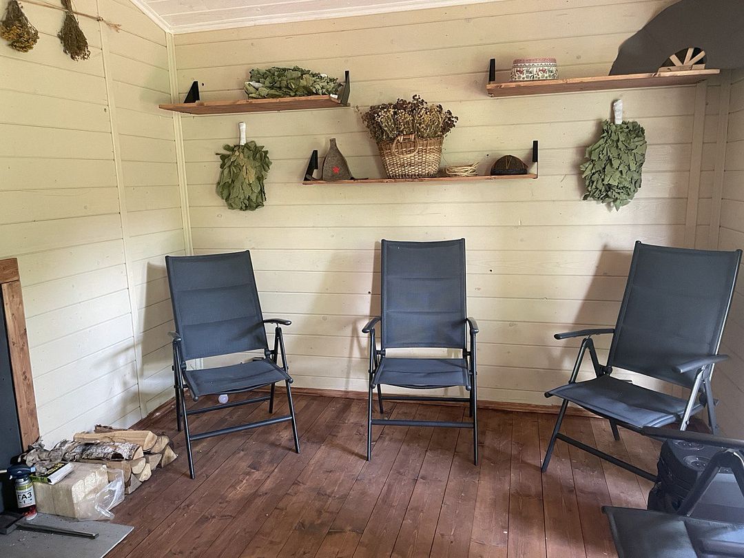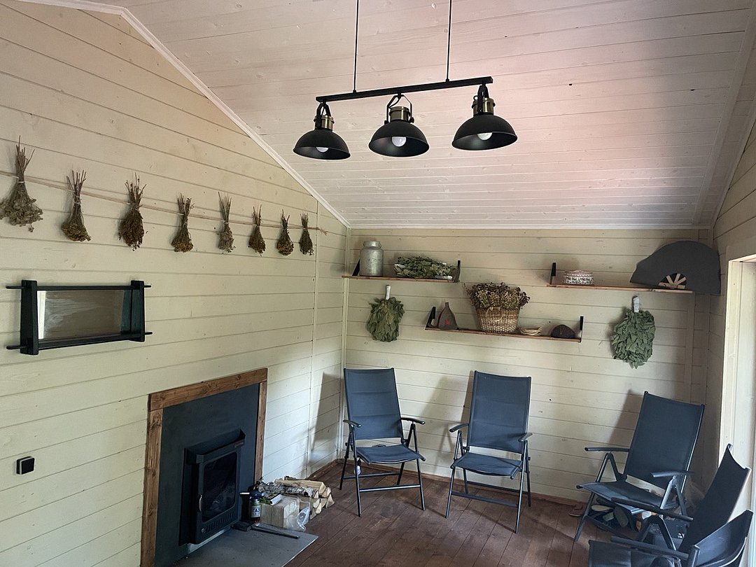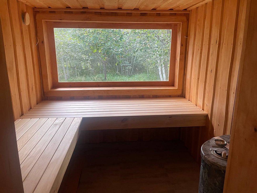 Инфраструктура: тапочки, купель, зона отдыха, полотенца, душБаня находится в отдельном доме у леса и оборудована мини-кухней и зоной отдыха. Ее можно протопить в двух режимах: сауна и русская баня. Душевая оборудована обливной системой. Парилка укомплектована красивой подсветкой и панорамным окном в лес, чтобы создать уютную и расслабляющую атмосферу. Также предусмотрена большая крытая терраса с купелью, чтобы вы могли наслаждаться свежим воздухом после парения.