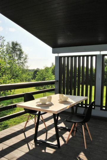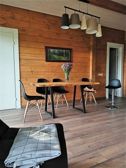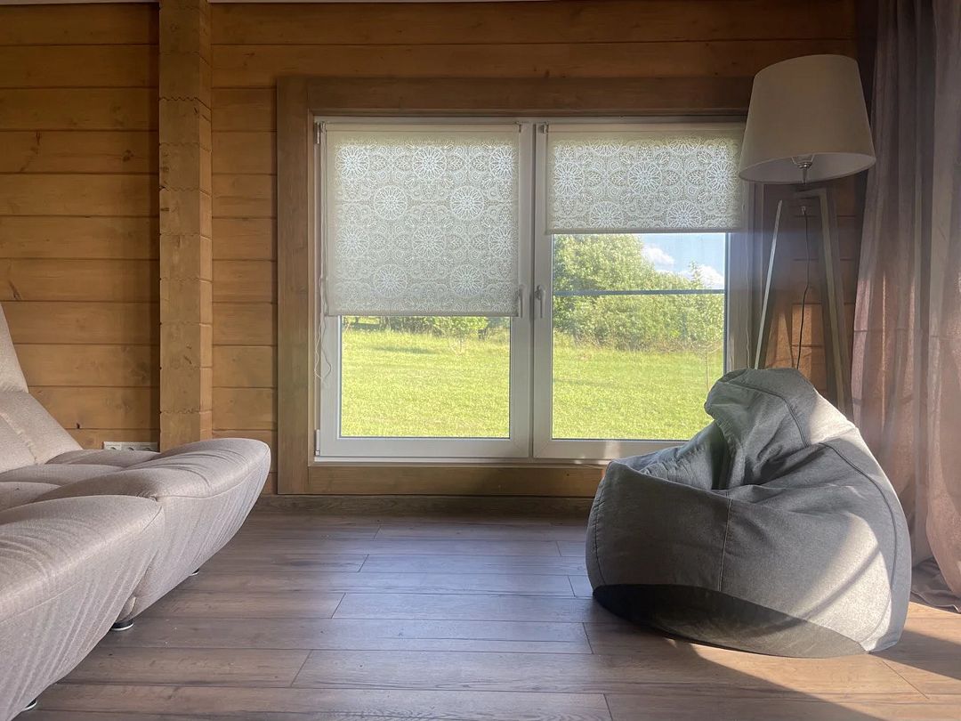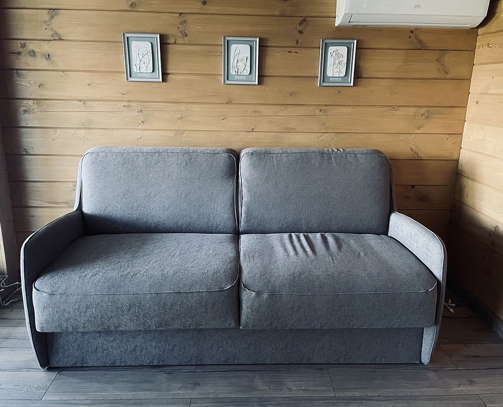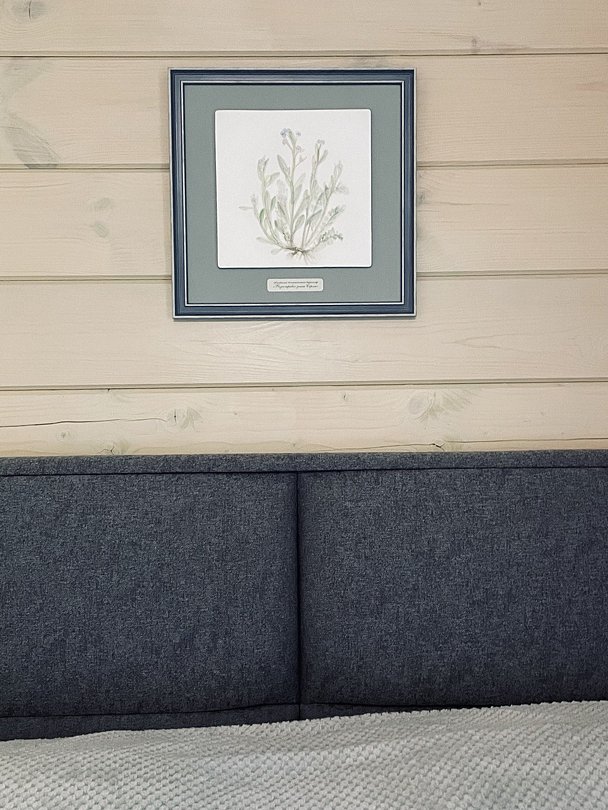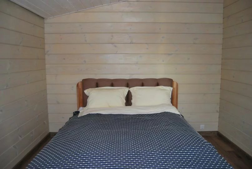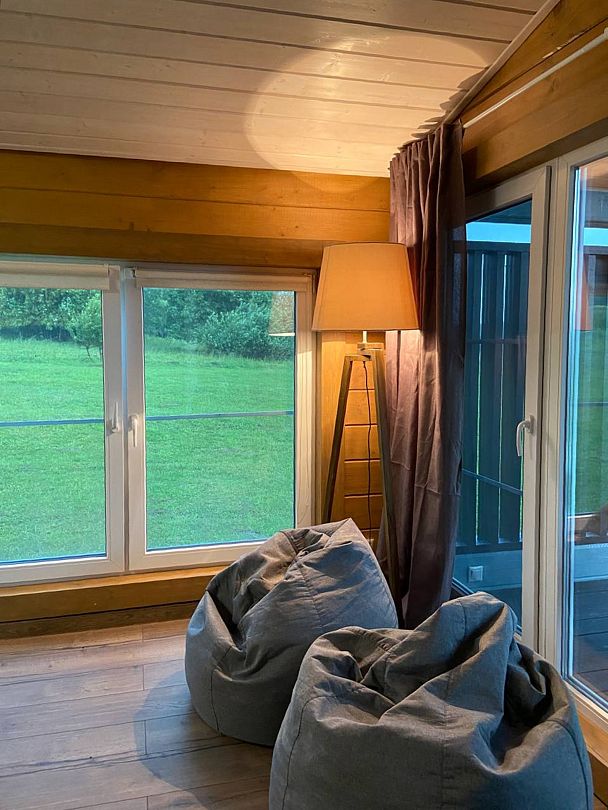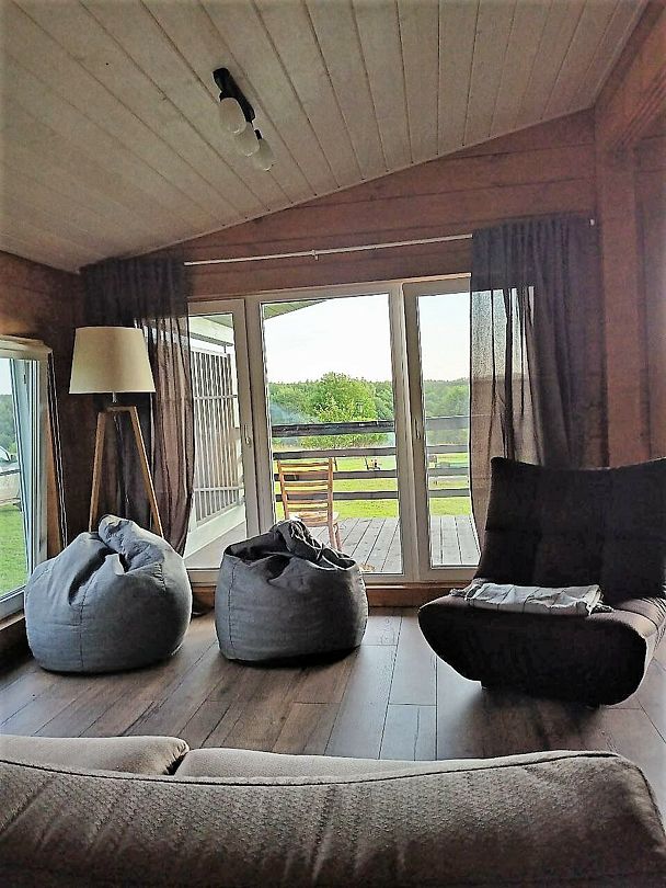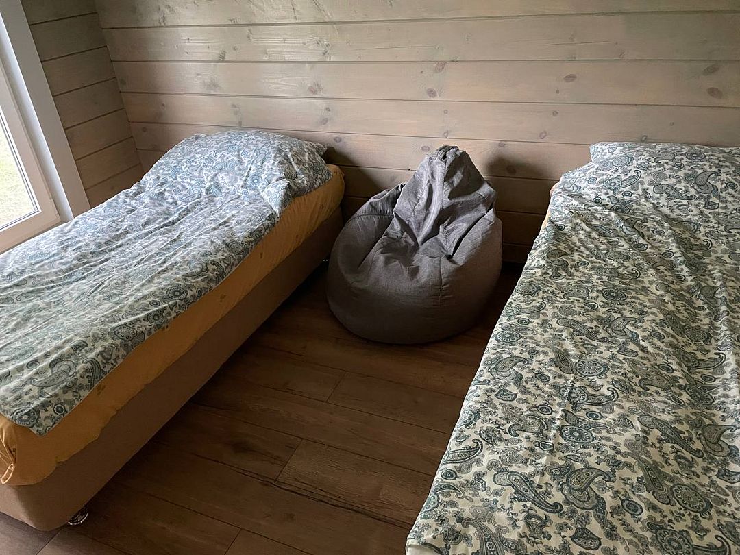 В первой спальне — двуспальная кровать (160х200 см) с ортопедическим матрасом. Во второй спальне — две односпальные кровати (80х200) с ортопедическим матрасом (при необходимости их можно сдвинуть). В третьей спальне — раскладной диван со спальным местом (140х200). Во всех спальнях есть место для хранения одежды. Удобная гостиная-кухня, оборудованная всем необходимым для отдыха и приготовления еды. В гостиной панорамное остекление, комфортный диван. У дома большая веранда с потрясающим видом.