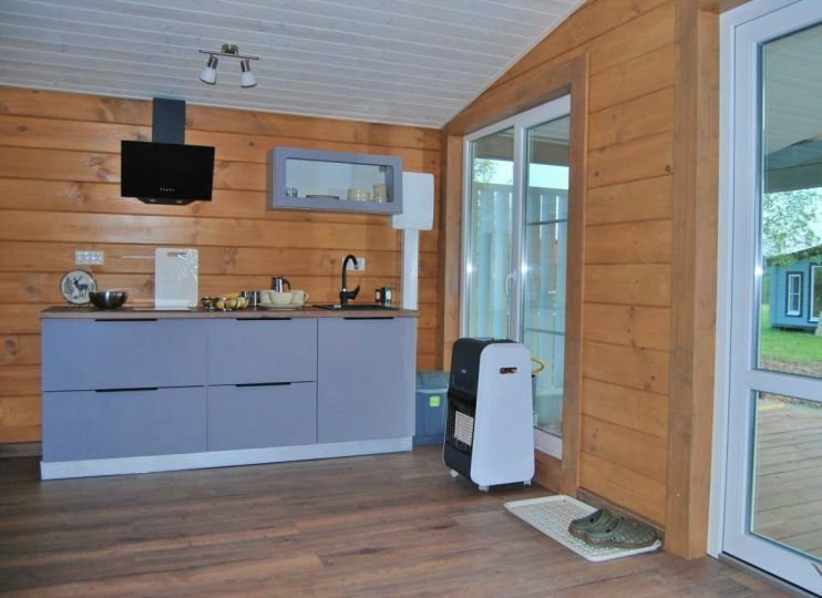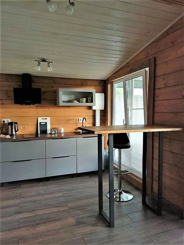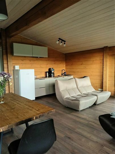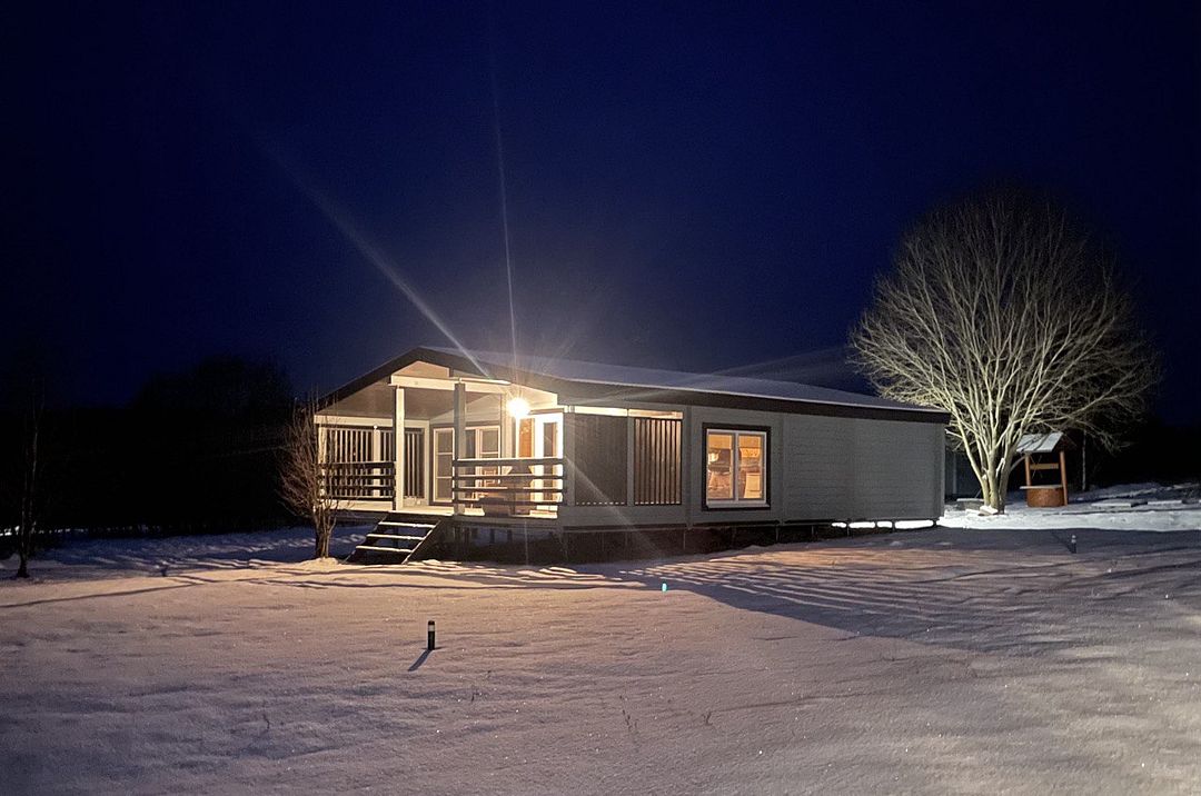 Уютный и комфортный дом из клеёного бруса с панорамным остеклением, откуда открывается очаровательный вид. Дом из двух комнат и санузла с душевой кабиной.