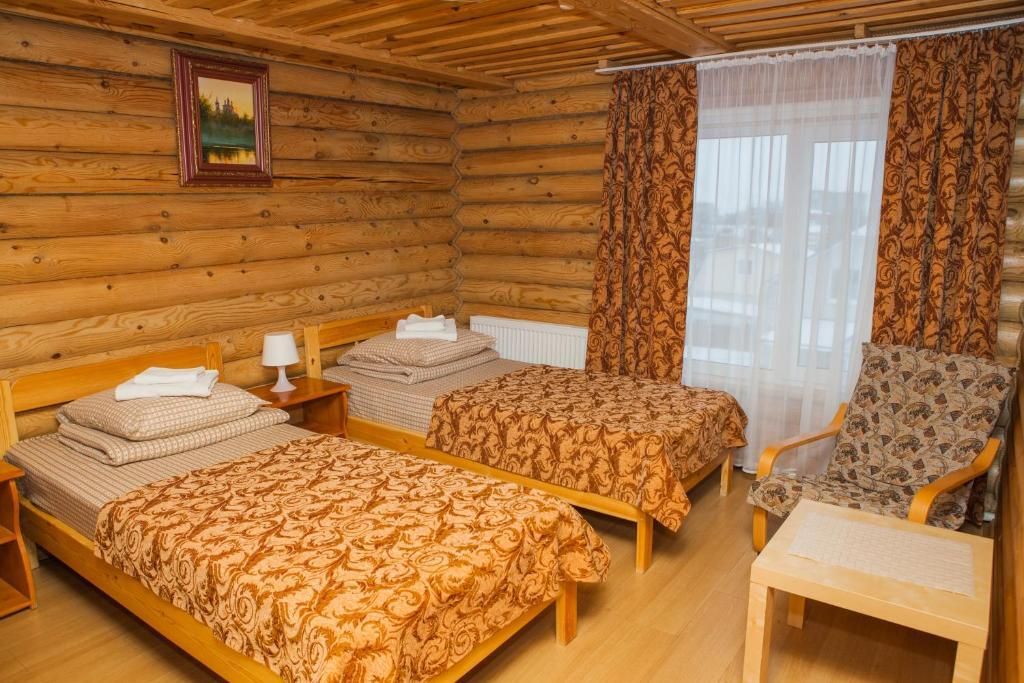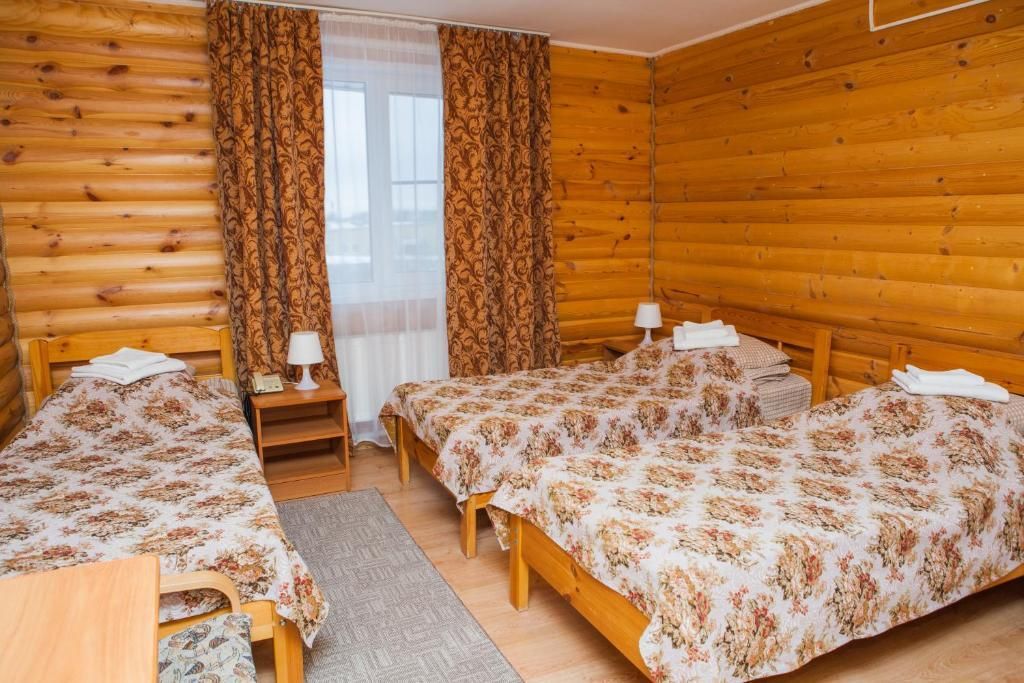 Просторный трехместный номер класса люкс. Гости располагаются на большой двуспальной и одной полутороспальной кровати. В номере так же есть большой шкаф для одежды, телевизор, прикроватная мебель, холодильник и электрочайник. В ванной находятся все необходимые принадлежности, фен, а так же установлена душевая кабина.