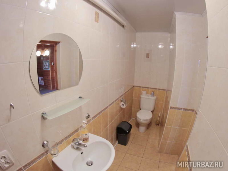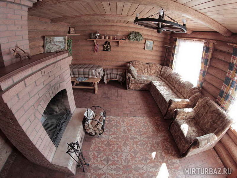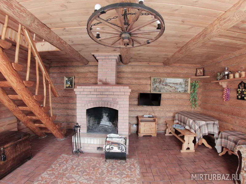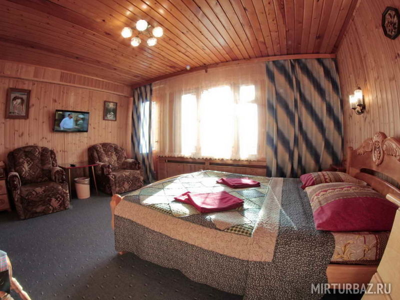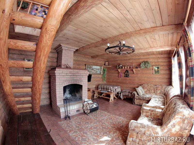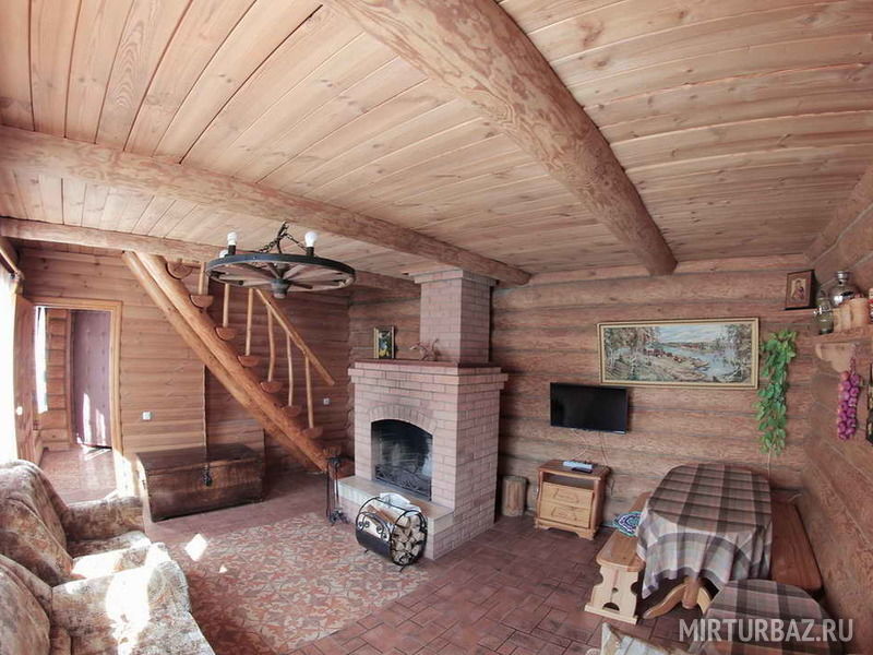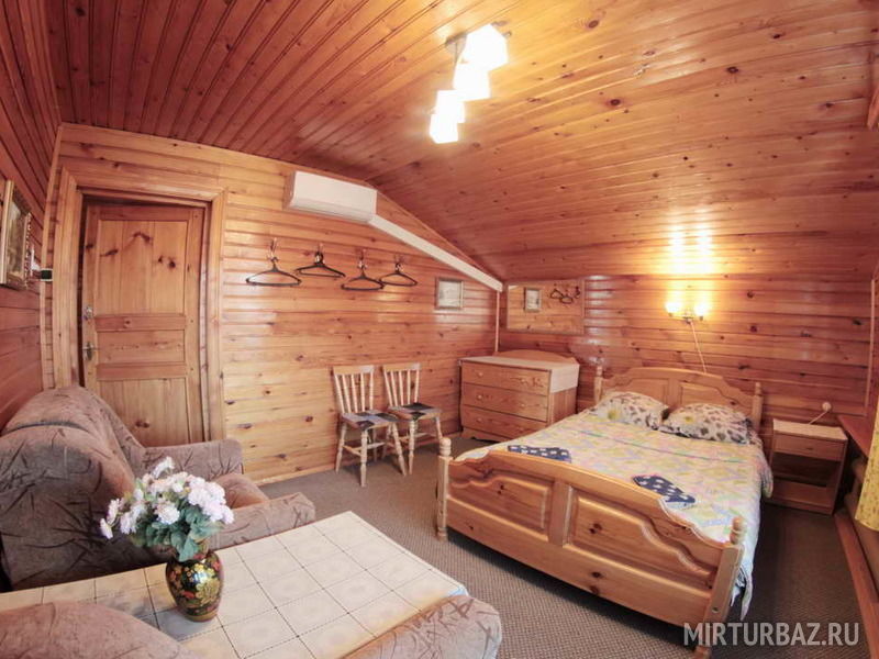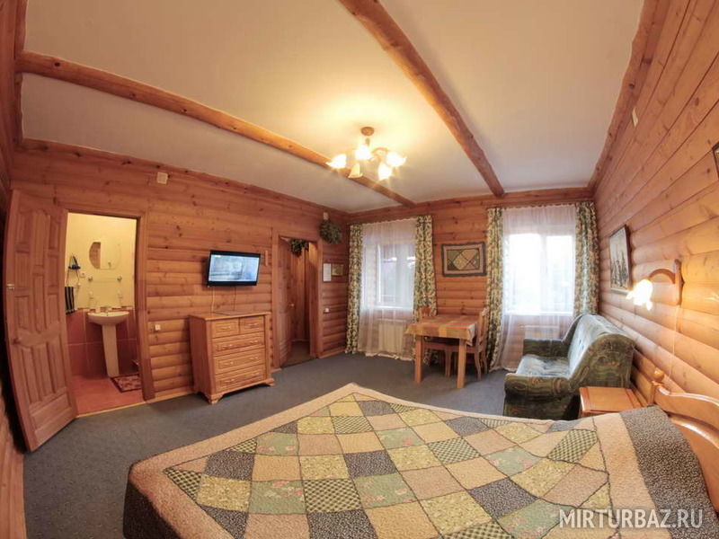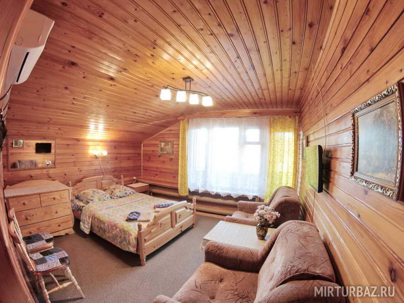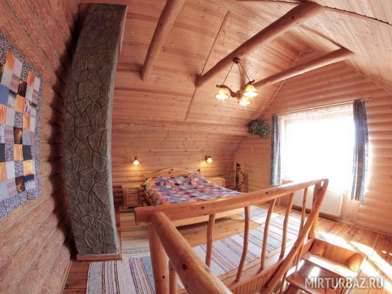 Двухэтажный номер в сосновом срубе с камином, имеет отдельный вход, состоит из большой гостиной с теплыми полами, просторной спальни на втором этаже, прихожей, и душевой комнаты с туалетом.